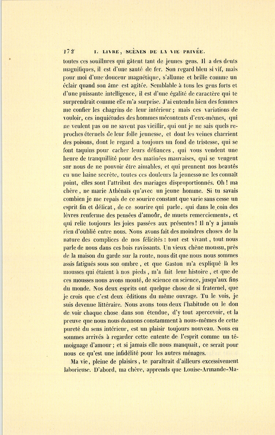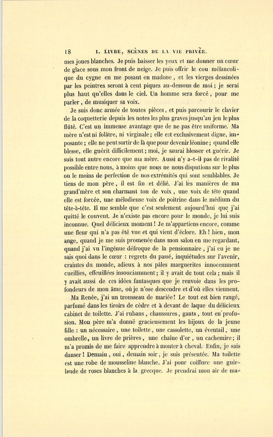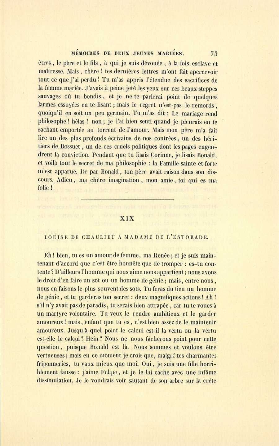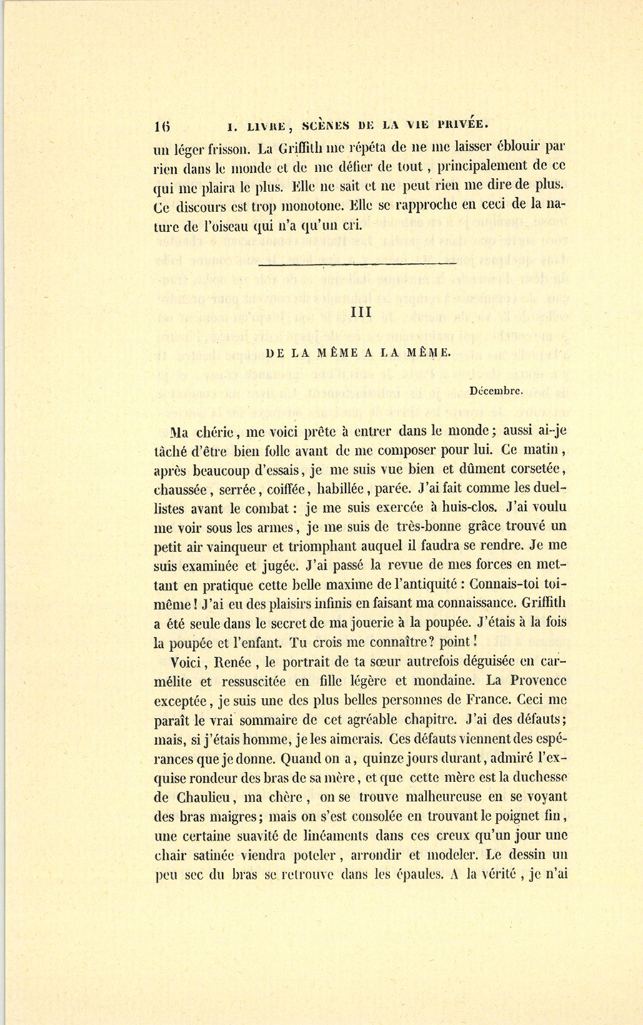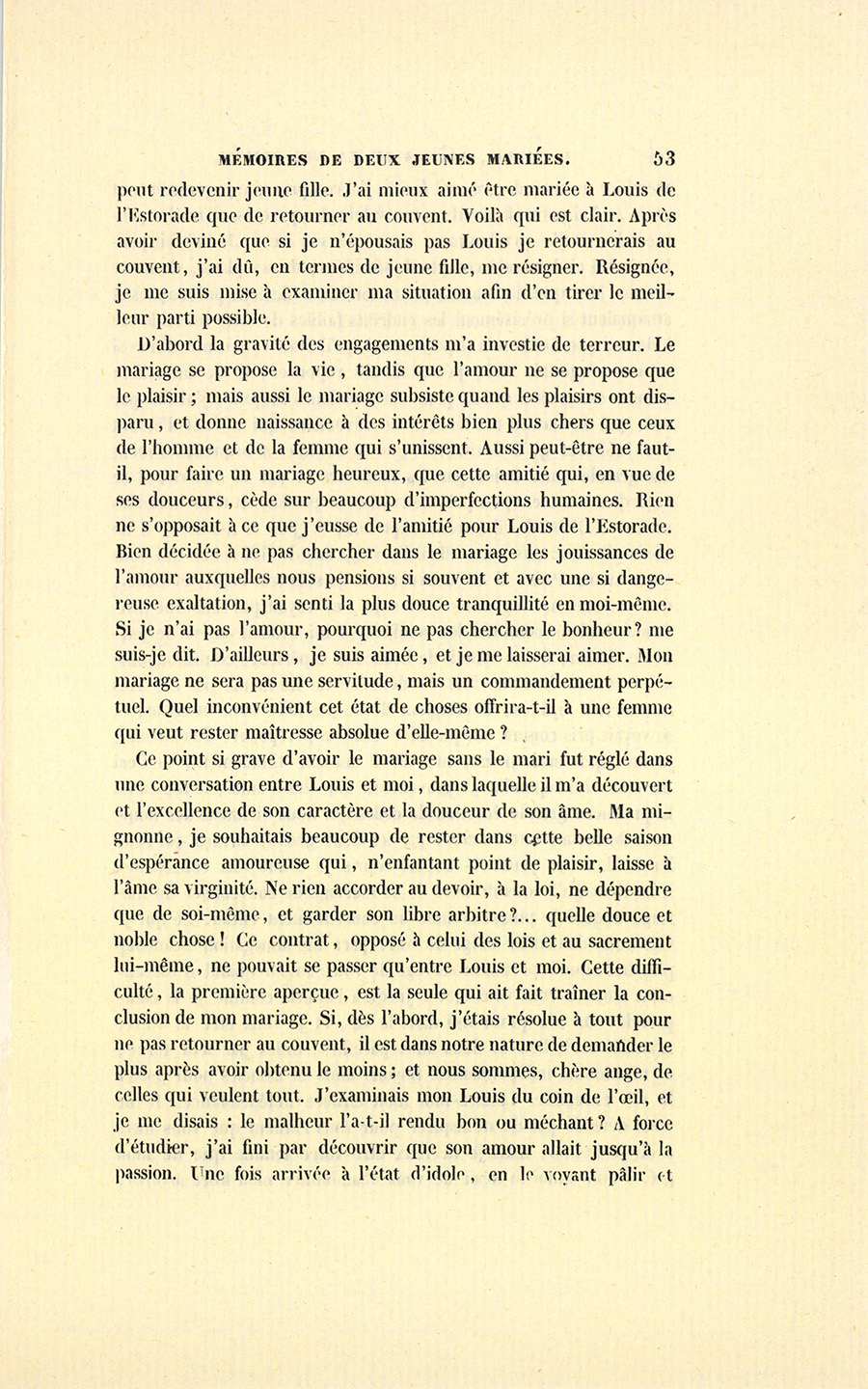 Ma chère Louise, avant de t’écrire, j’ai dû attendre ; mais maintenant je sais bien des choses, ou, pour mieux dire, je les ai apprises, et je dois te les dire pour ton bonheur à venir. Il y a tant de différence entre une jeune fille et une femme mariée, que la jeune fille ne peut pas plus la concevoir que la femme mariée ne {p. 53} peut redevenir jeune fille. J’ai mieux aimé être mariée à Louis de l’Estorade que de retourner au couvent. Voilà qui est clair. Après avoir deviné que si je n’épousais pas Louis je retournerais au couvent, j’ai dû, en termes de jeune fille, me résigner. Résignée, je me suis mise à examiner ma situation afin d’en tirer le meilleur parti possible.