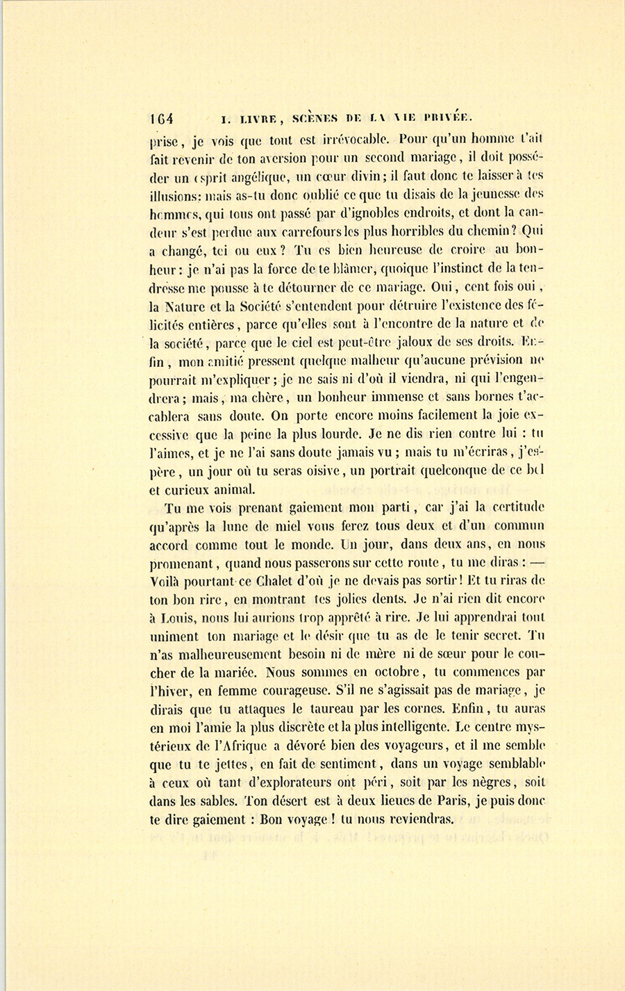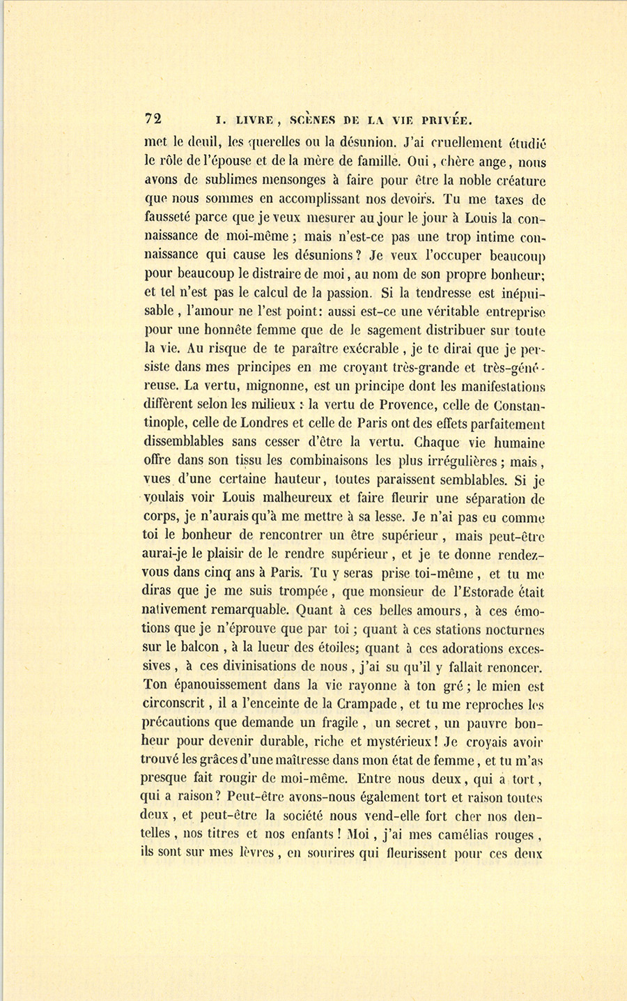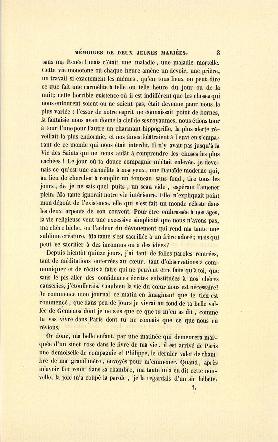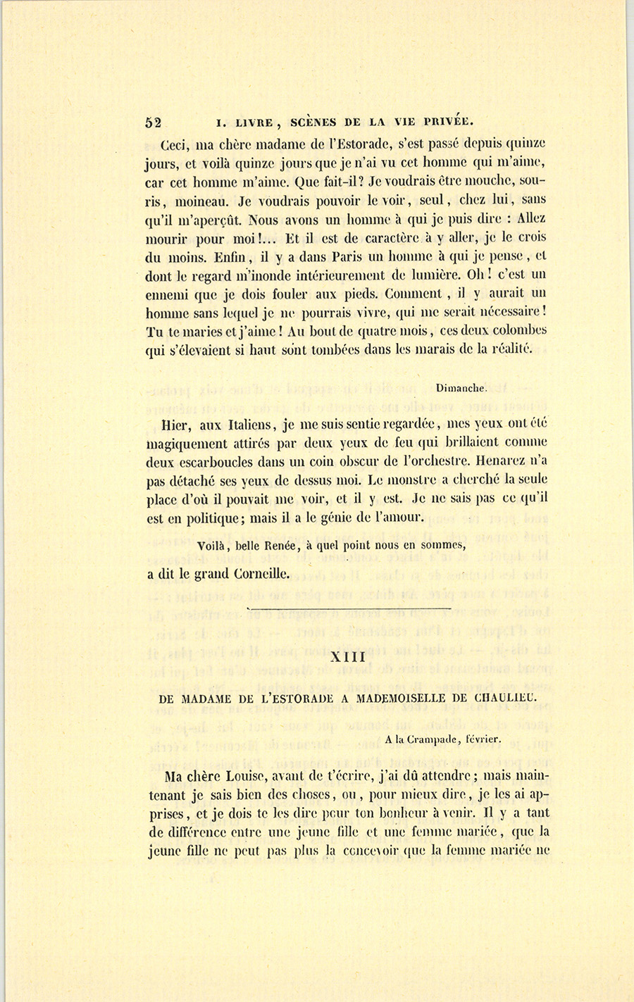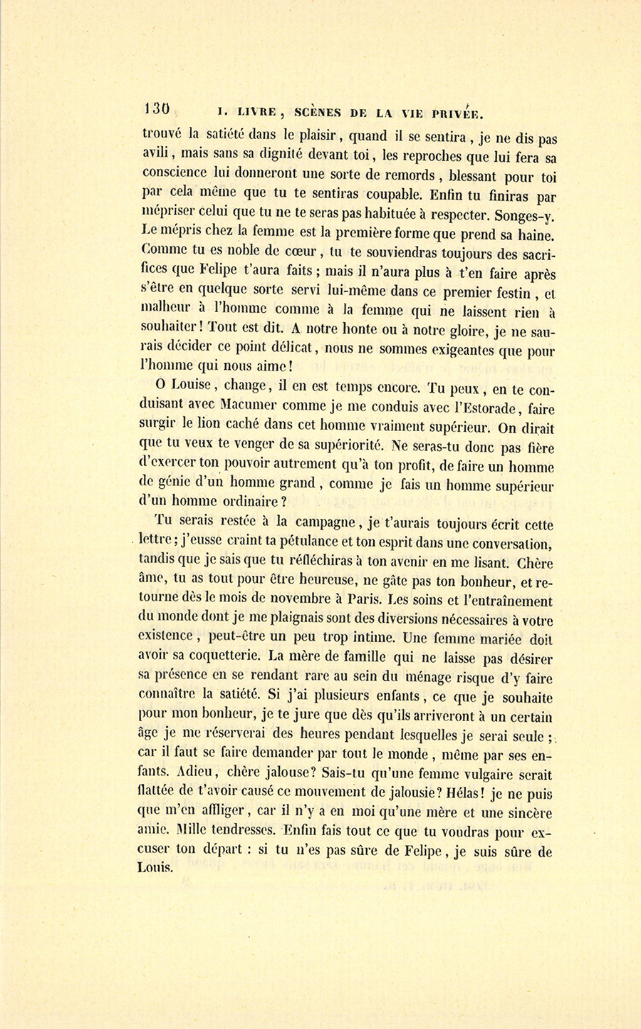 Ma chère Louise, avant de t’écrire, j’ai dû attendre ; mais maintenant je sais bien des choses, ou, pour mieux dire, je les ai apprises, et je dois te les dire pour ton bonheur à venir. Il y a tant de différence entre une jeune fille et une femme mariée, que la jeune fille ne peut pas plus la concevoir que la femme mariée ne {p. 53} peut redevenir jeune fille. J’ai mieux aimé être mariée à Louis de l’Estorade que de retourner au couvent. Voilà qui est clair. Après avoir deviné que si je n’épousais pas Louis je retournerais au couvent, j’ai dû, en termes de jeune fille, me résigner. Résignée, je me suis mise à examiner ma situation afin d’en tirer le meilleur parti possible.