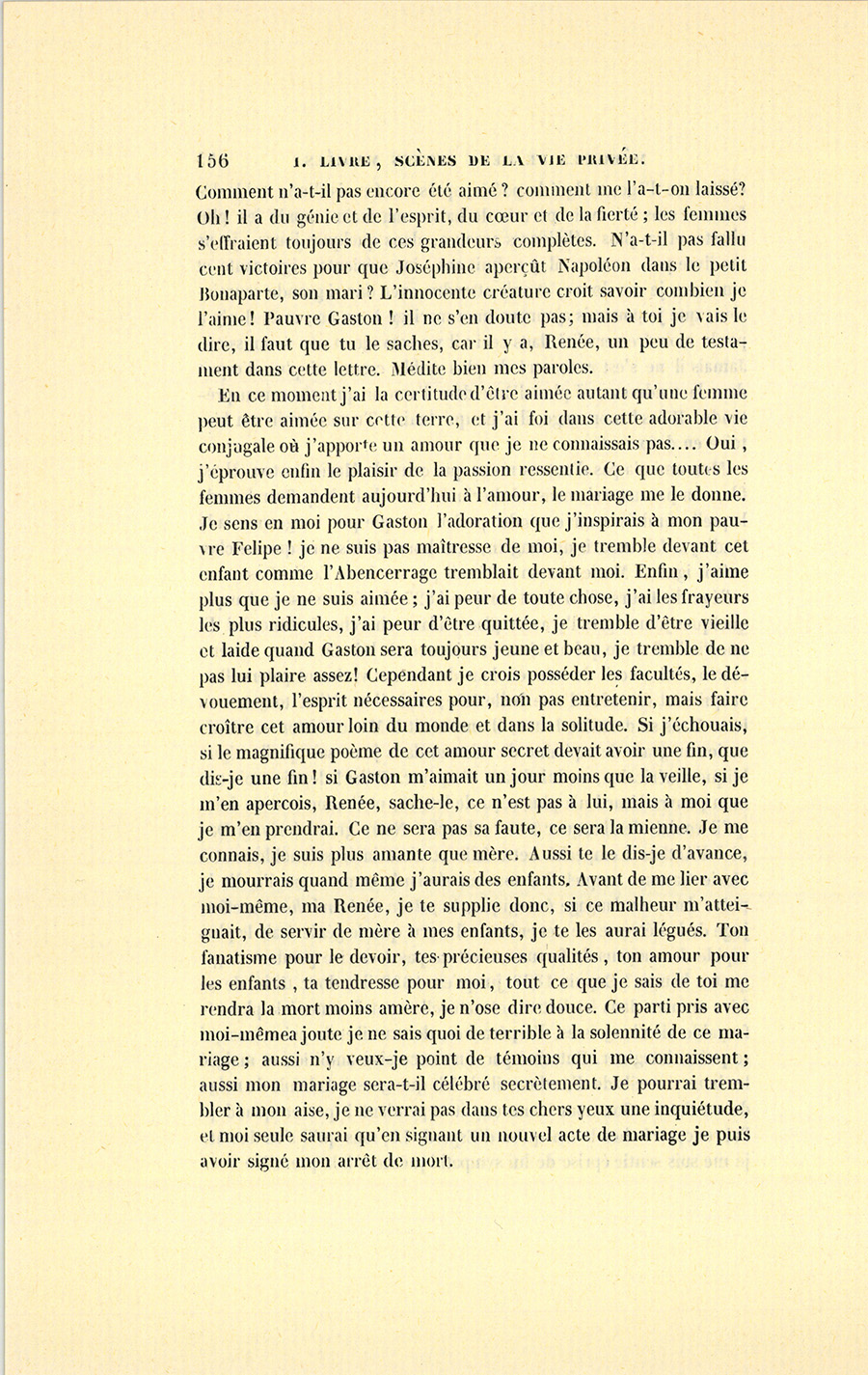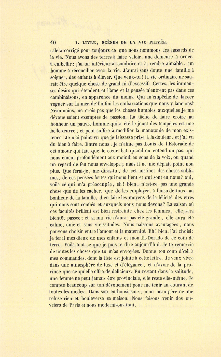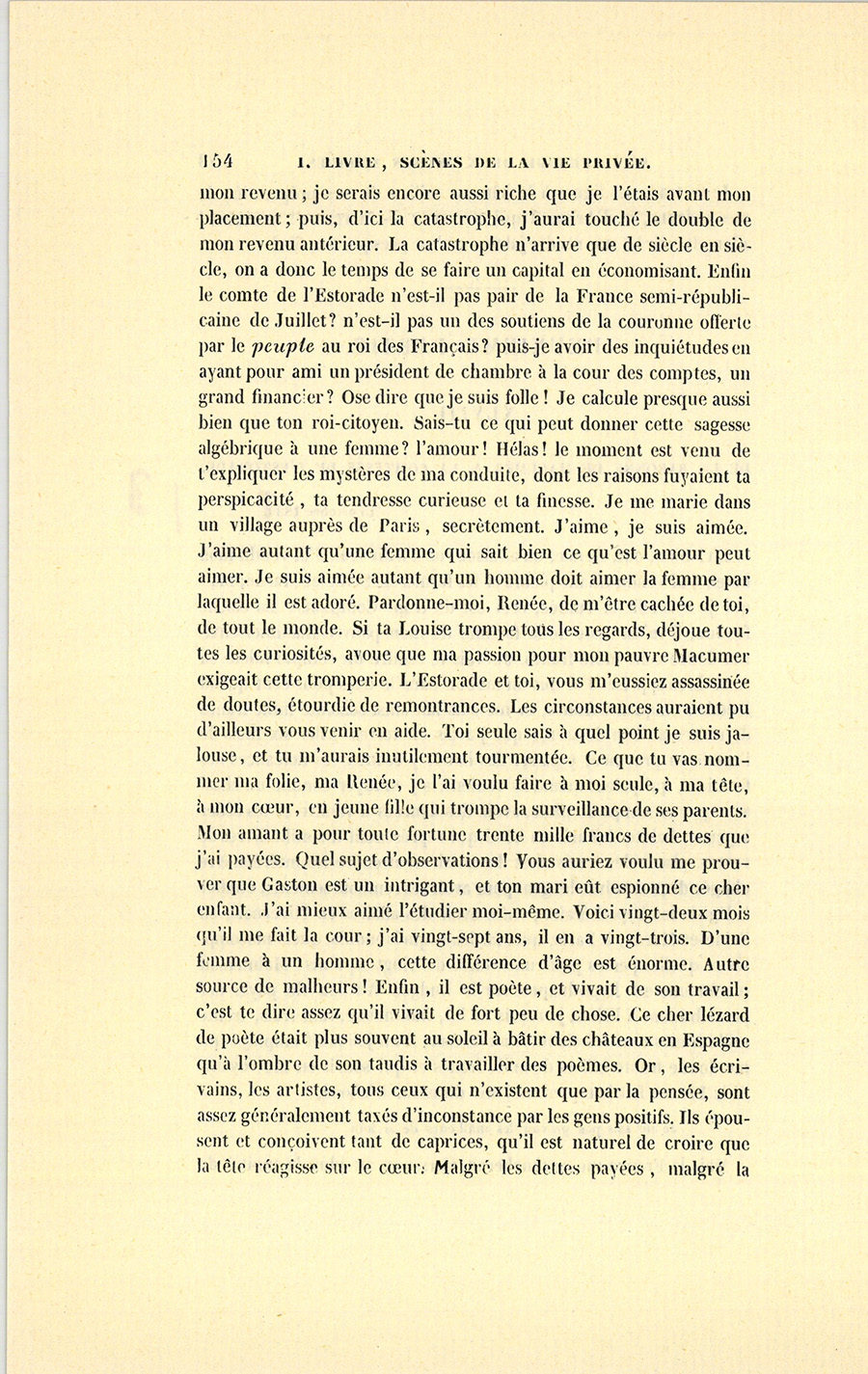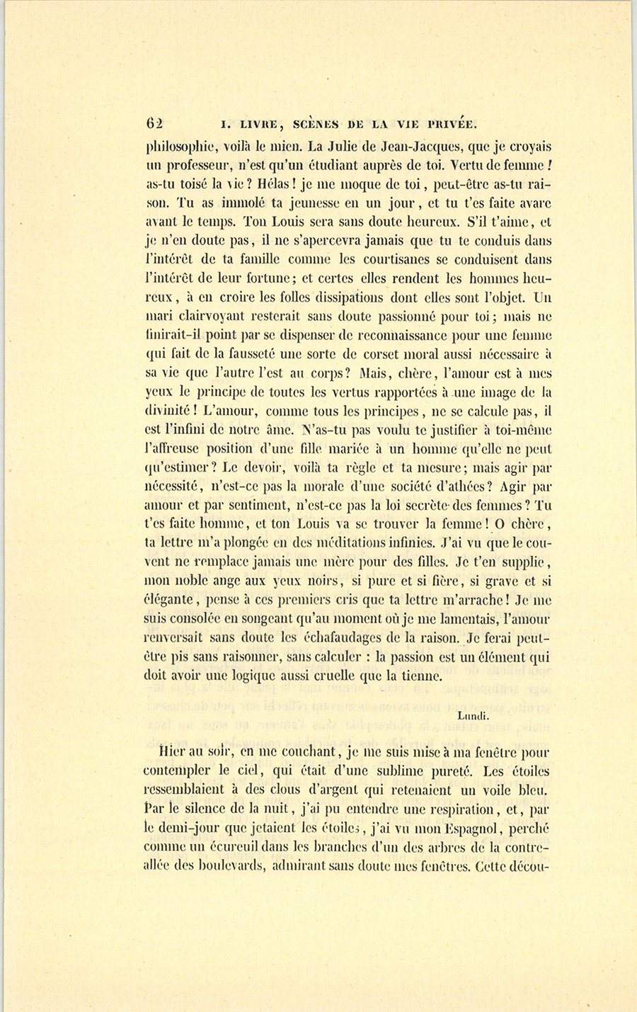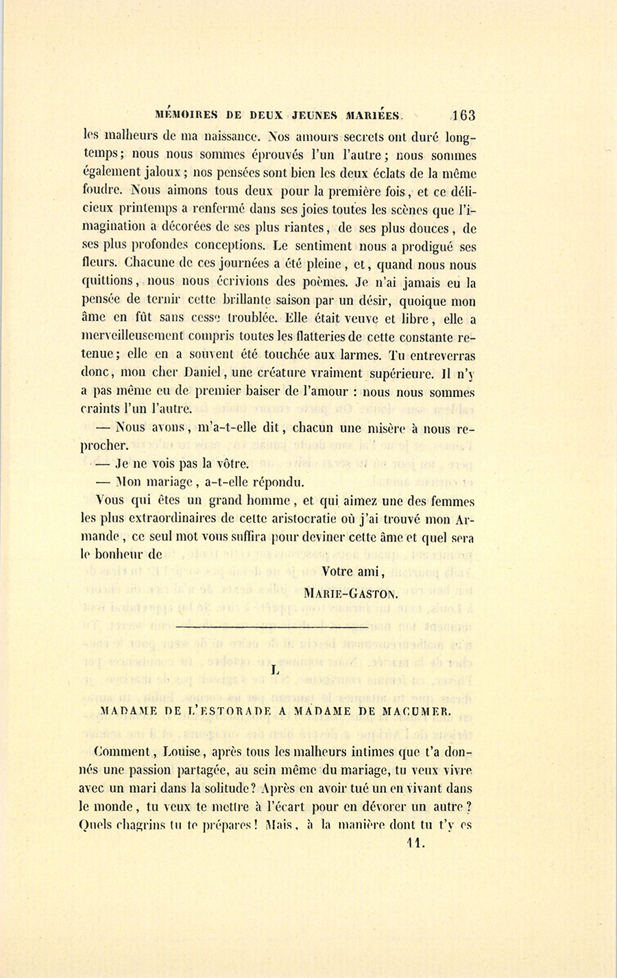Ma chère Louise, avant de t’écrire, j’ai dû attendre ; mais maintenant je sais bien des choses, ou, pour mieux dire, je les ai apprises, et je dois te les dire pour ton bonheur à venir. Il y a tant de différence entre une jeune fille et une femme mariée, que la jeune fille ne peut pas plus la concevoir que la femme mariée ne {p. 53} peut redevenir jeune fille. J’ai mieux aimé être mariée à Louis de l’Estorade que de retourner au couvent. Voilà qui est clair. Après avoir deviné que si je n’épousais pas Louis je retournerais au couvent, j’ai dû, en termes de jeune fille, me résigner. Résignée, je me suis mise à examiner ma situation afin d’en tirer le meilleur parti possible.