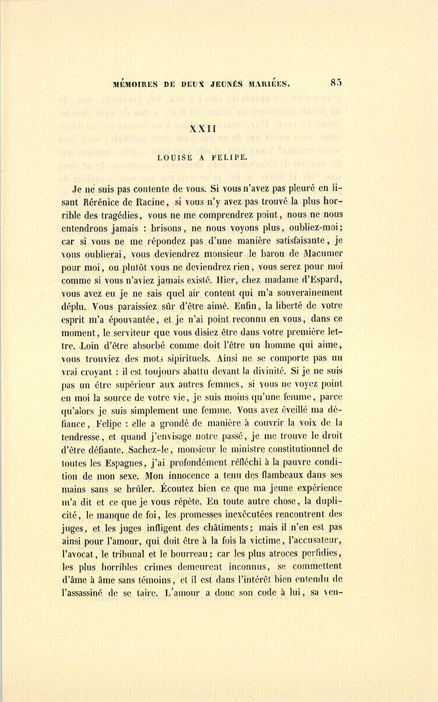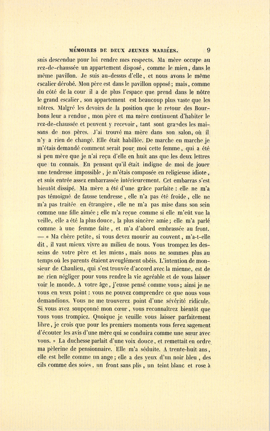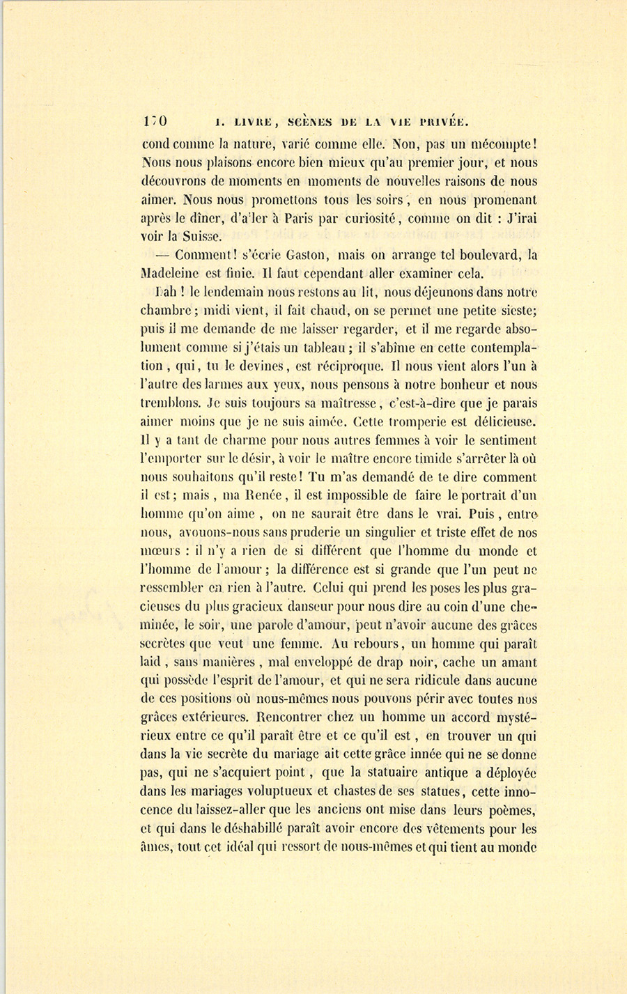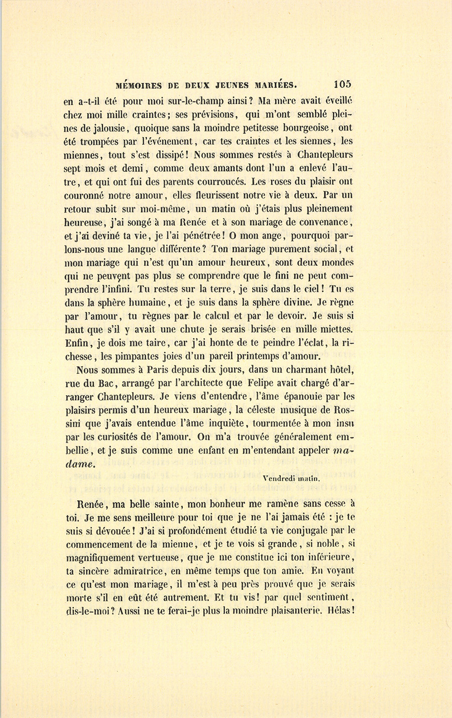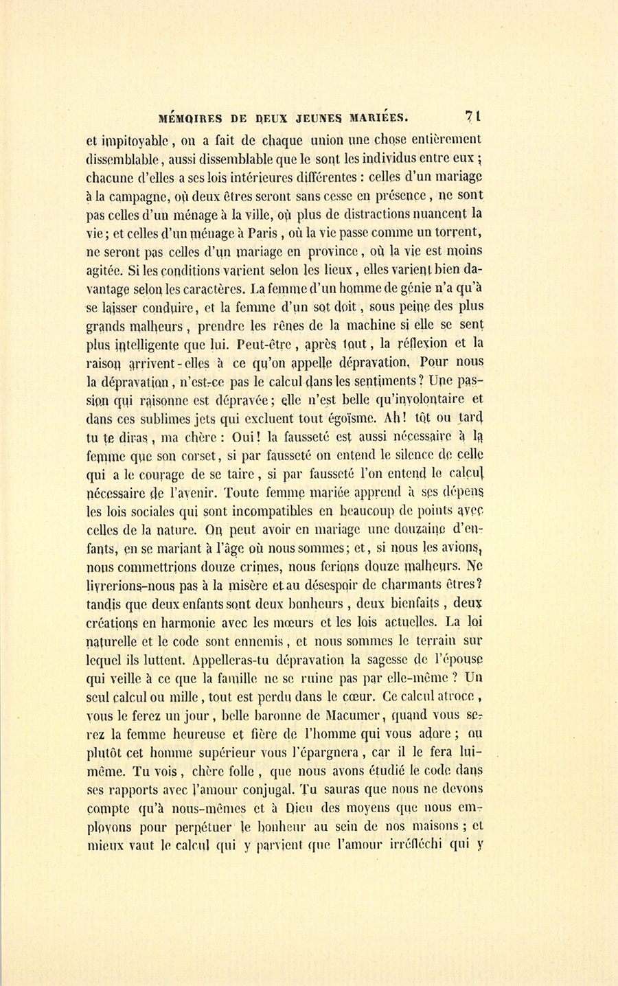 Ma chère Louise, avant de t’écrire, j’ai dû attendre ; mais maintenant je sais bien des choses, ou, pour mieux dire, je les ai apprises, et je dois te les dire pour ton bonheur à venir. Il y a tant de différence entre une jeune fille et une femme mariée, que la jeune fille ne peut pas plus la concevoir que la femme mariée ne {p. 53} peut redevenir jeune fille. J’ai mieux aimé être mariée à Louis de l’Estorade que de retourner au couvent. Voilà qui est clair. Après avoir deviné que si je n’épousais pas Louis je retournerais au couvent, j’ai dû, en termes de jeune fille, me résigner. Résignée, je me suis mise à examiner ma situation afin d’en tirer le meilleur parti possible.