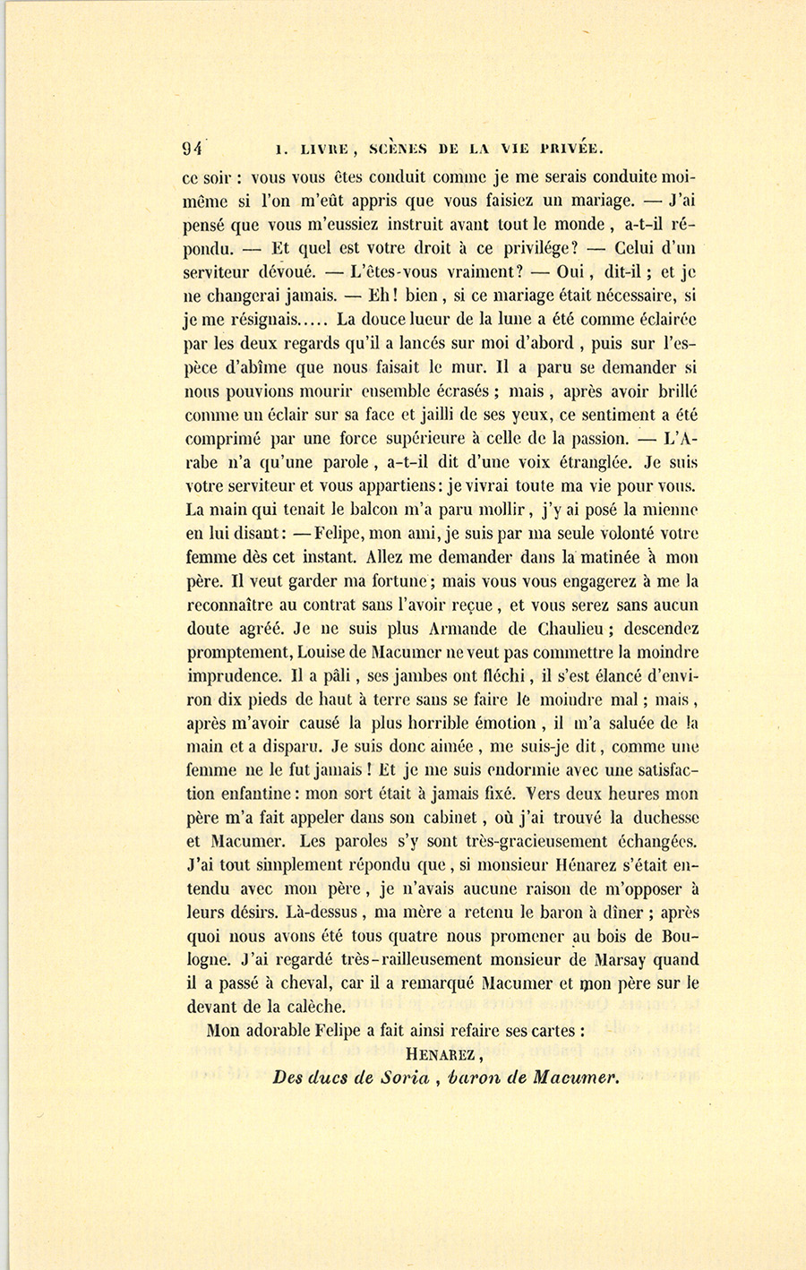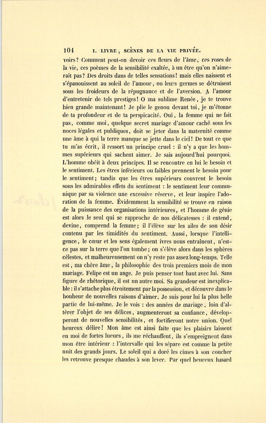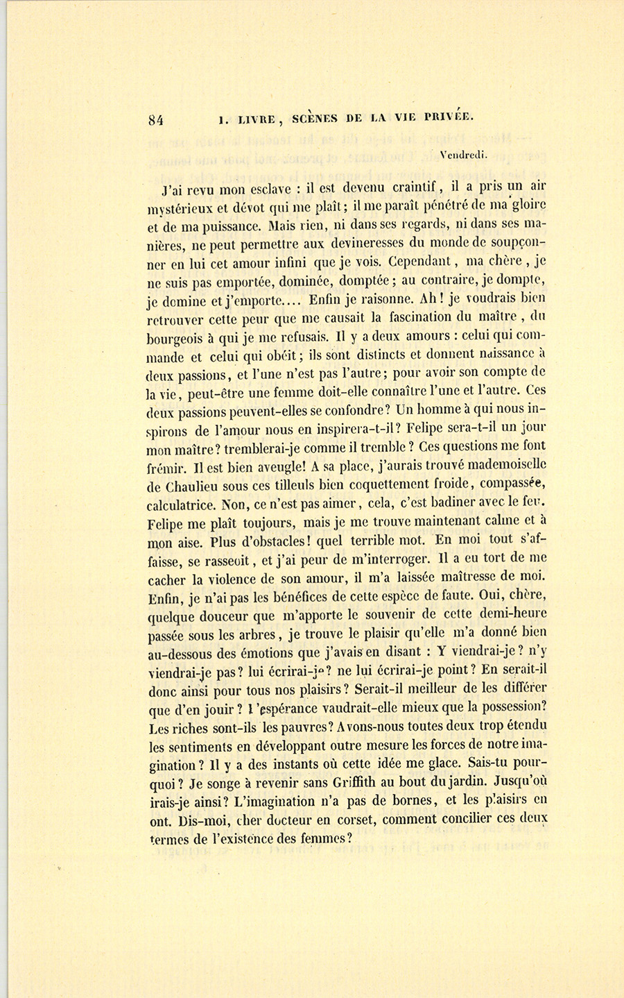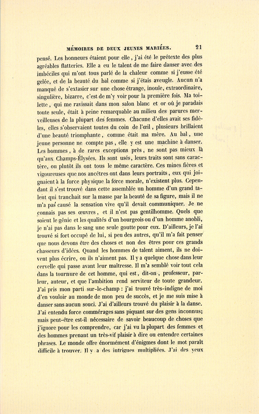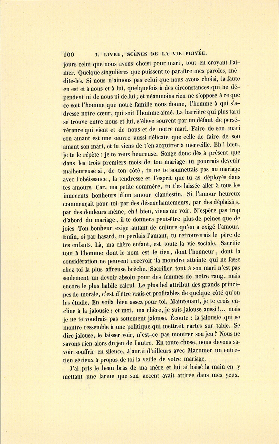 Ma chère Louise, avant de t’écrire, j’ai dû attendre ; mais maintenant je sais bien des choses, ou, pour mieux dire, je les ai apprises, et je dois te les dire pour ton bonheur à venir. Il y a tant de différence entre une jeune fille et une femme mariée, que la jeune fille ne peut pas plus la concevoir que la femme mariée ne {p. 53} peut redevenir jeune fille. J’ai mieux aimé être mariée à Louis de l’Estorade que de retourner au couvent. Voilà qui est clair. Après avoir deviné que si je n’épousais pas Louis je retournerais au couvent, j’ai dû, en termes de jeune fille, me résigner. Résignée, je me suis mise à examiner ma situation afin d’en tirer le meilleur parti possible.