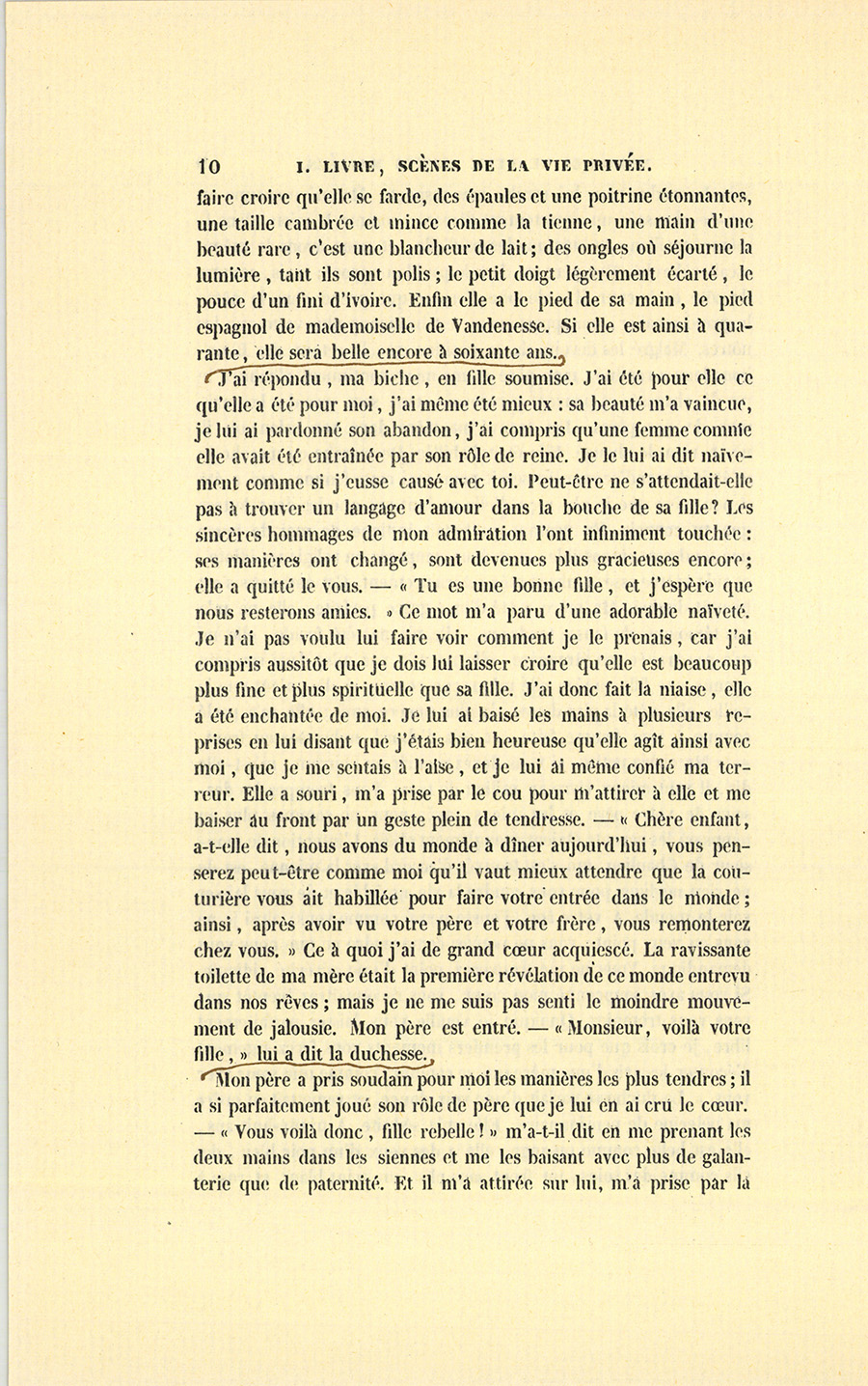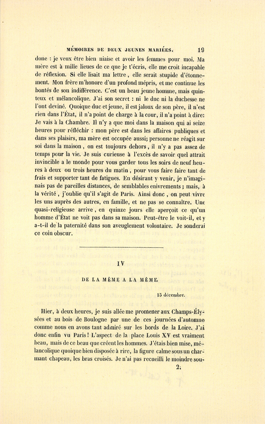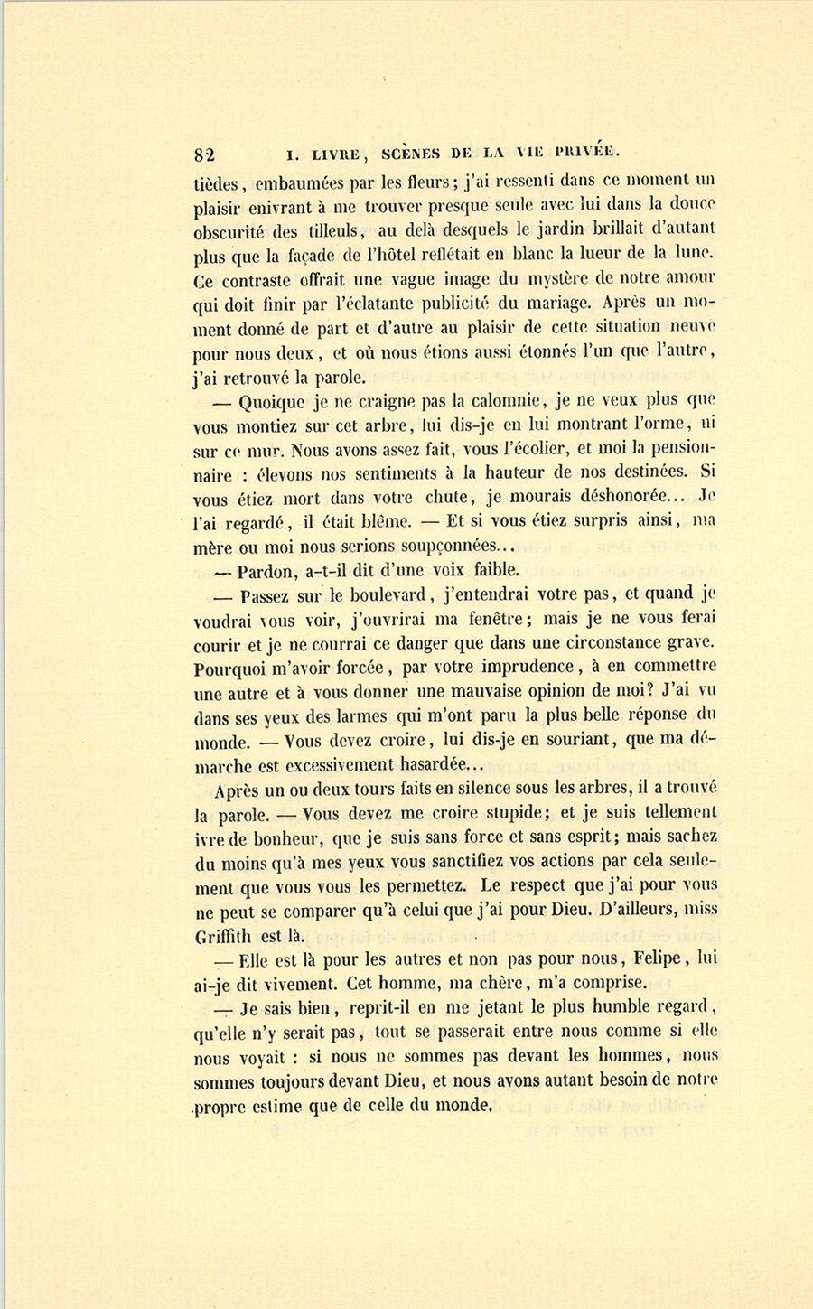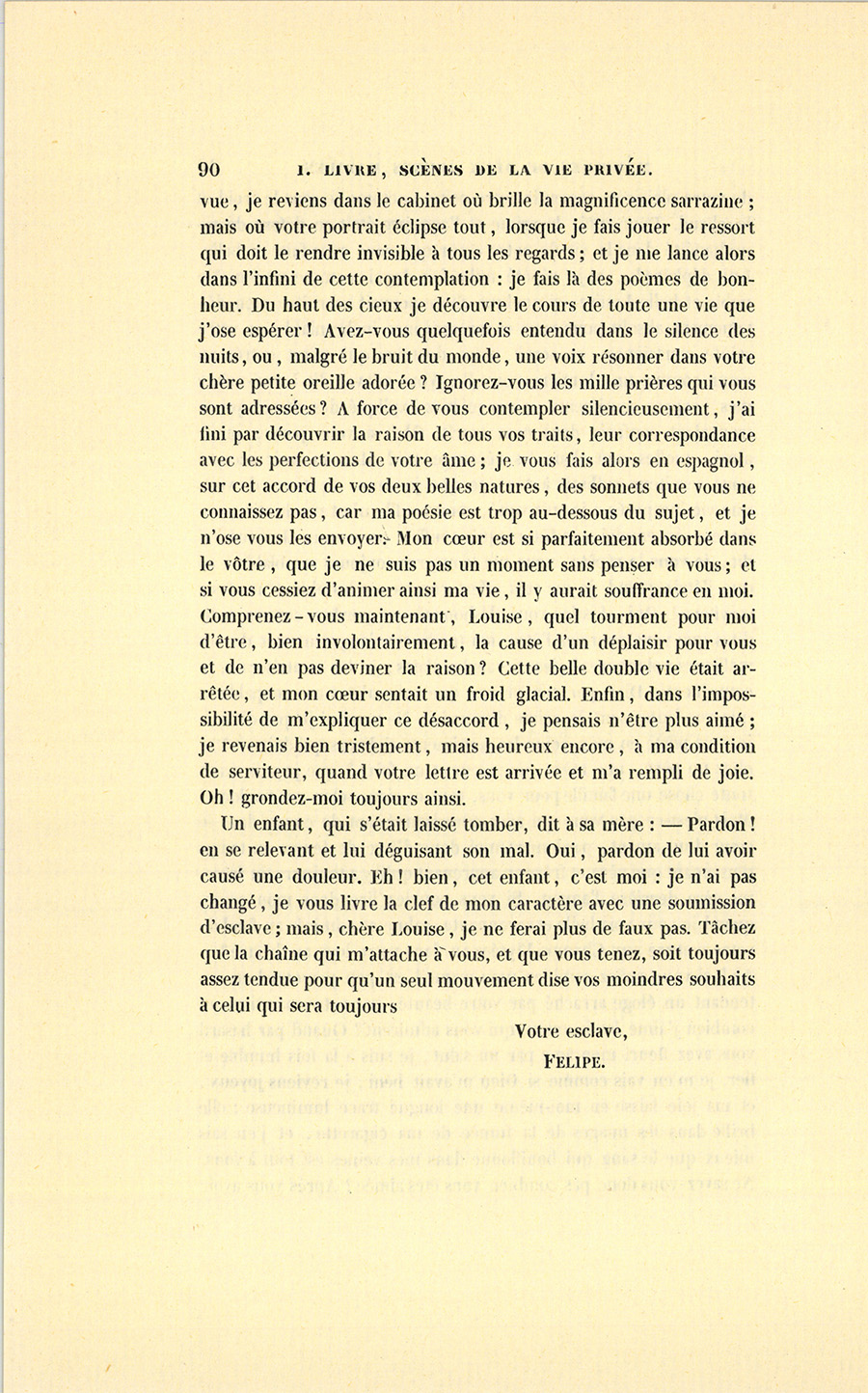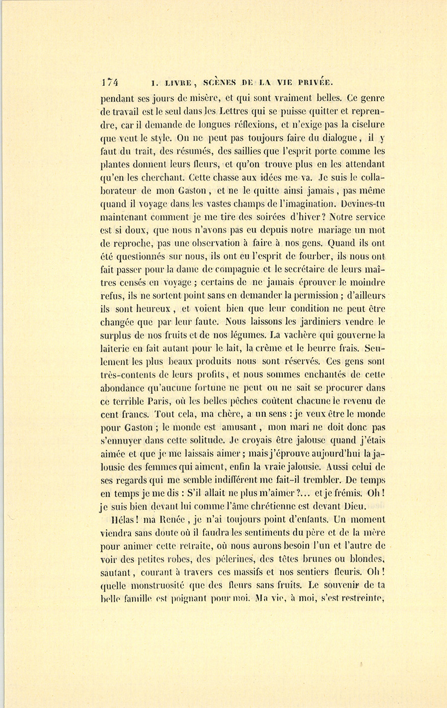 Ma chère Louise, avant de t’écrire, j’ai dû attendre ; mais maintenant je sais bien des choses, ou, pour mieux dire, je les ai apprises, et je dois te les dire pour ton bonheur à venir. Il y a tant de différence entre une jeune fille et une femme mariée, que la jeune fille ne peut pas plus la concevoir que la femme mariée ne {p. 53} peut redevenir jeune fille. J’ai mieux aimé être mariée à Louis de l’Estorade que de retourner au couvent. Voilà qui est clair. Après avoir deviné que si je n’épousais pas Louis je retournerais au couvent, j’ai dû, en termes de jeune fille, me résigner. Résignée, je me suis mise à examiner ma situation afin d’en tirer le meilleur parti possible.