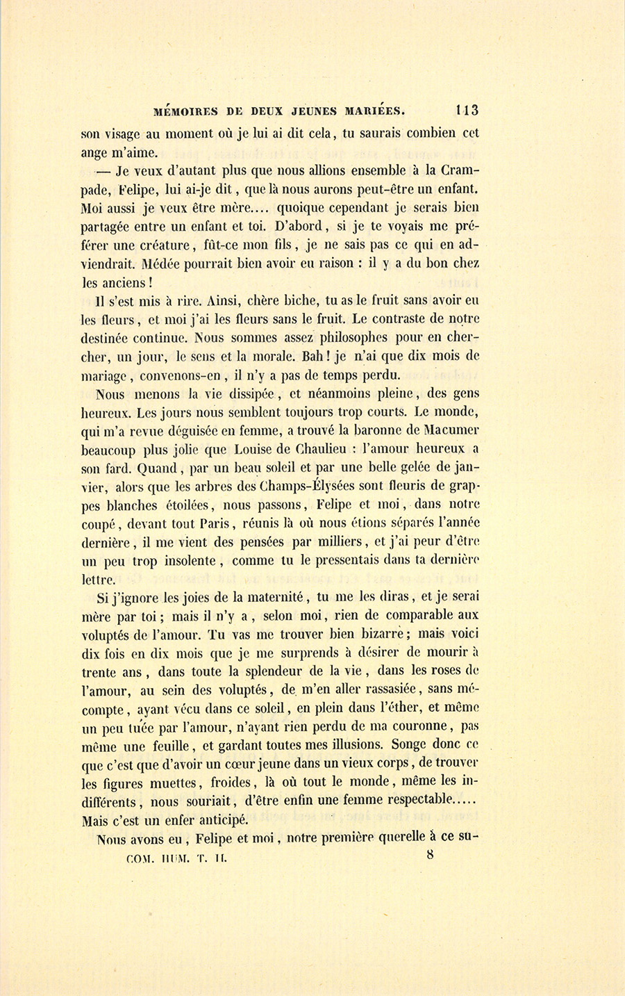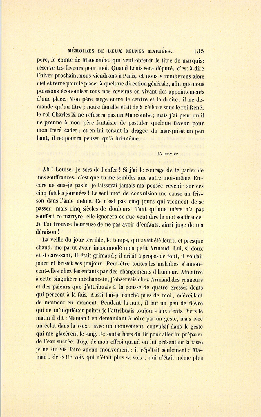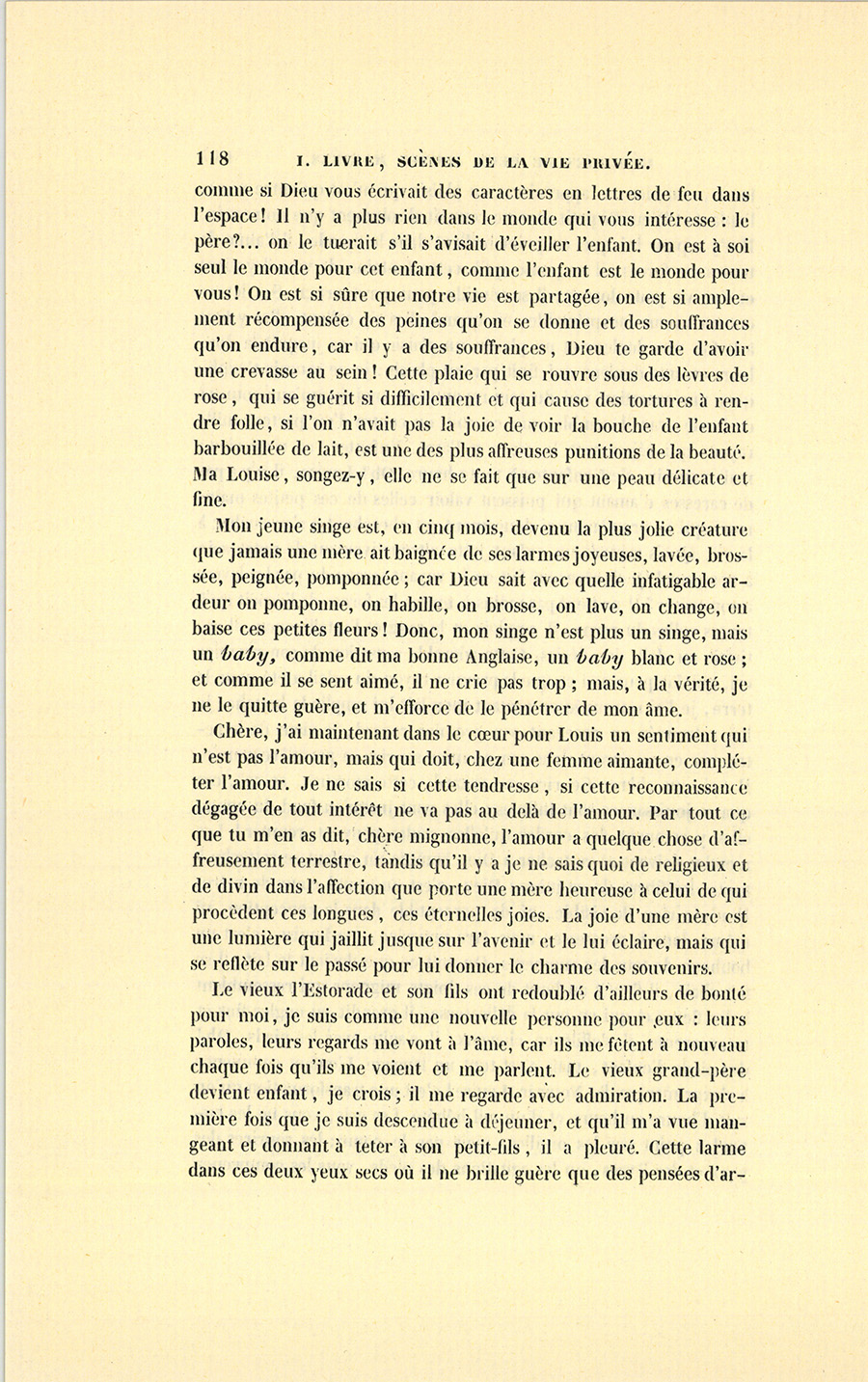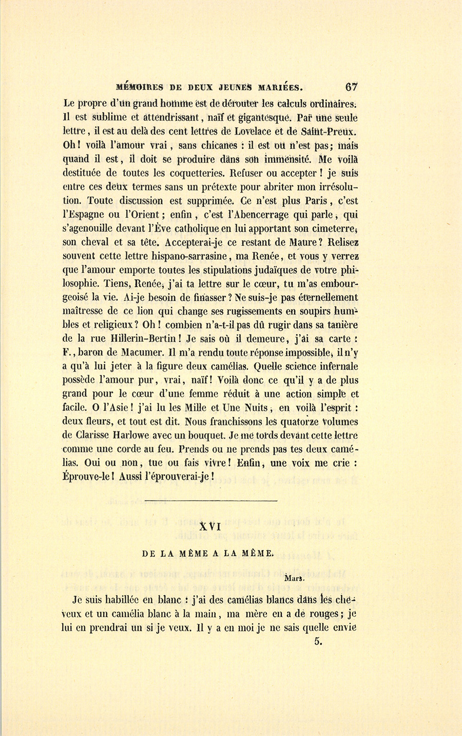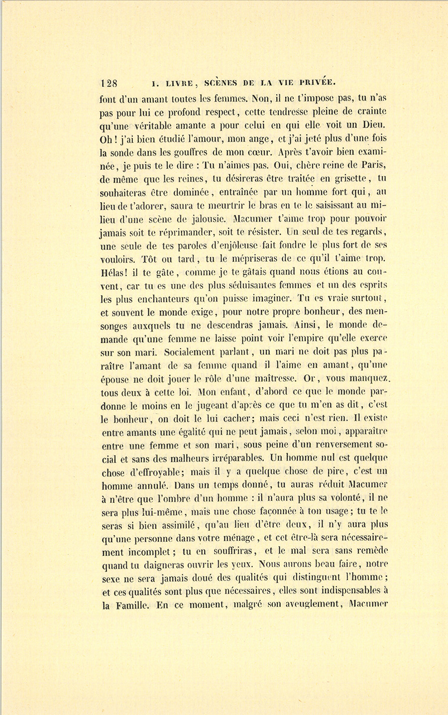 Ma chère Louise, avant de t’écrire, j’ai dû attendre ; mais maintenant je sais bien des choses, ou, pour mieux dire, je les ai apprises, et je dois te les dire pour ton bonheur à venir. Il y a tant de différence entre une jeune fille et une femme mariée, que la jeune fille ne peut pas plus la concevoir que la femme mariée ne {p. 53} peut redevenir jeune fille. J’ai mieux aimé être mariée à Louis de l’Estorade que de retourner au couvent. Voilà qui est clair. Après avoir deviné que si je n’épousais pas Louis je retournerais au couvent, j’ai dû, en termes de jeune fille, me résigner. Résignée, je me suis mise à examiner ma situation afin d’en tirer le meilleur parti possible.