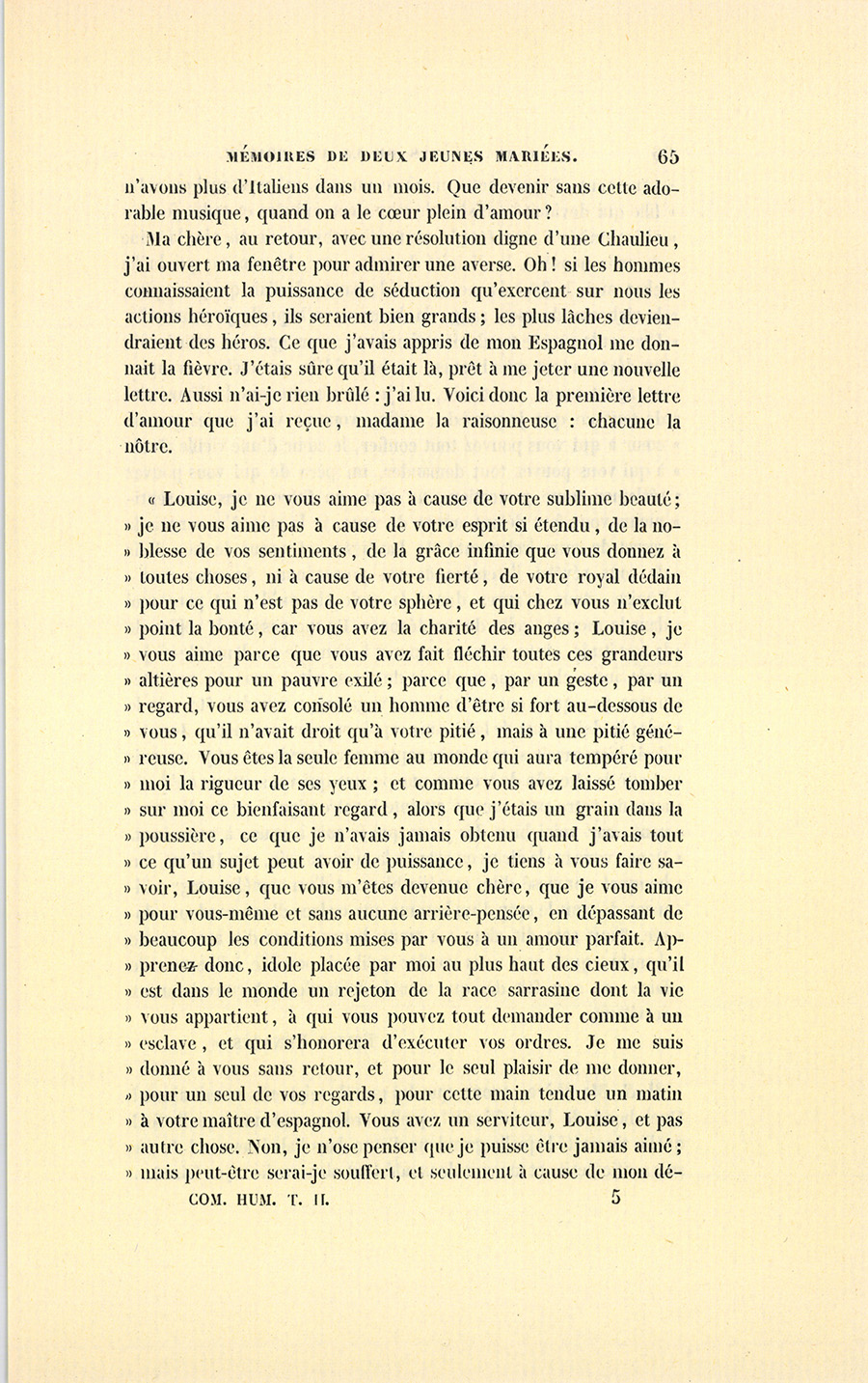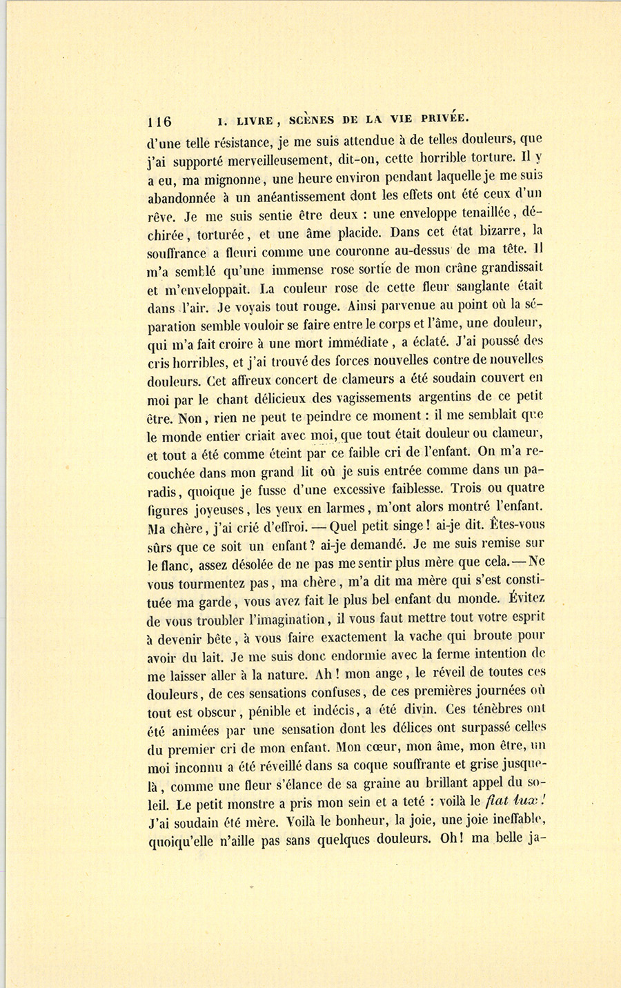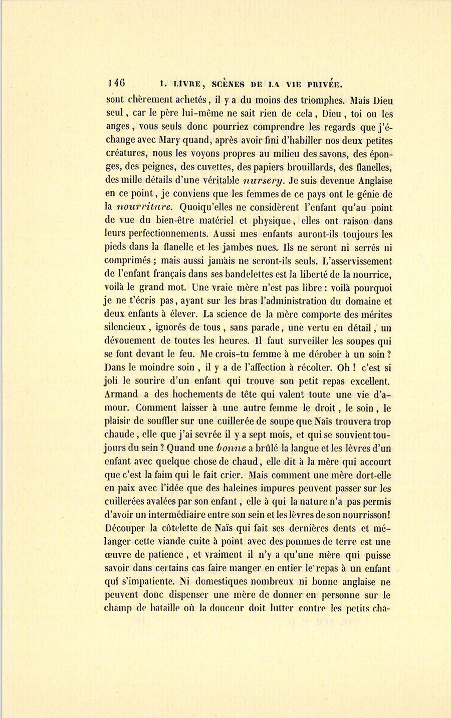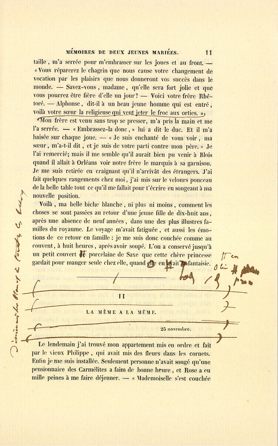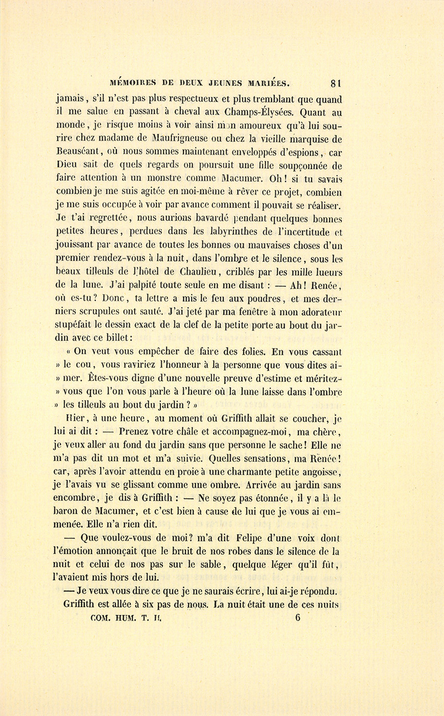 Ma chère Louise, avant de t’écrire, j’ai dû attendre ; mais maintenant je sais bien des choses, ou, pour mieux dire, je les ai apprises, et je dois te les dire pour ton bonheur à venir. Il y a tant de différence entre une jeune fille et une femme mariée, que la jeune fille ne peut pas plus la concevoir que la femme mariée ne {p. 53} peut redevenir jeune fille. J’ai mieux aimé être mariée à Louis de l’Estorade que de retourner au couvent. Voilà qui est clair. Après avoir deviné que si je n’épousais pas Louis je retournerais au couvent, j’ai dû, en termes de jeune fille, me résigner. Résignée, je me suis mise à examiner ma situation afin d’en tirer le meilleur parti possible.