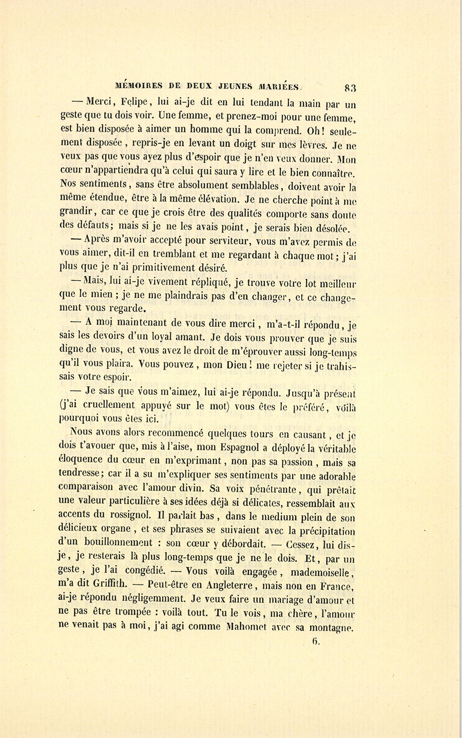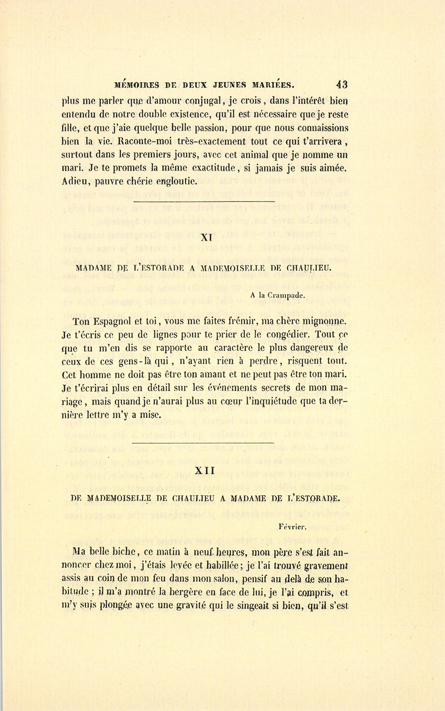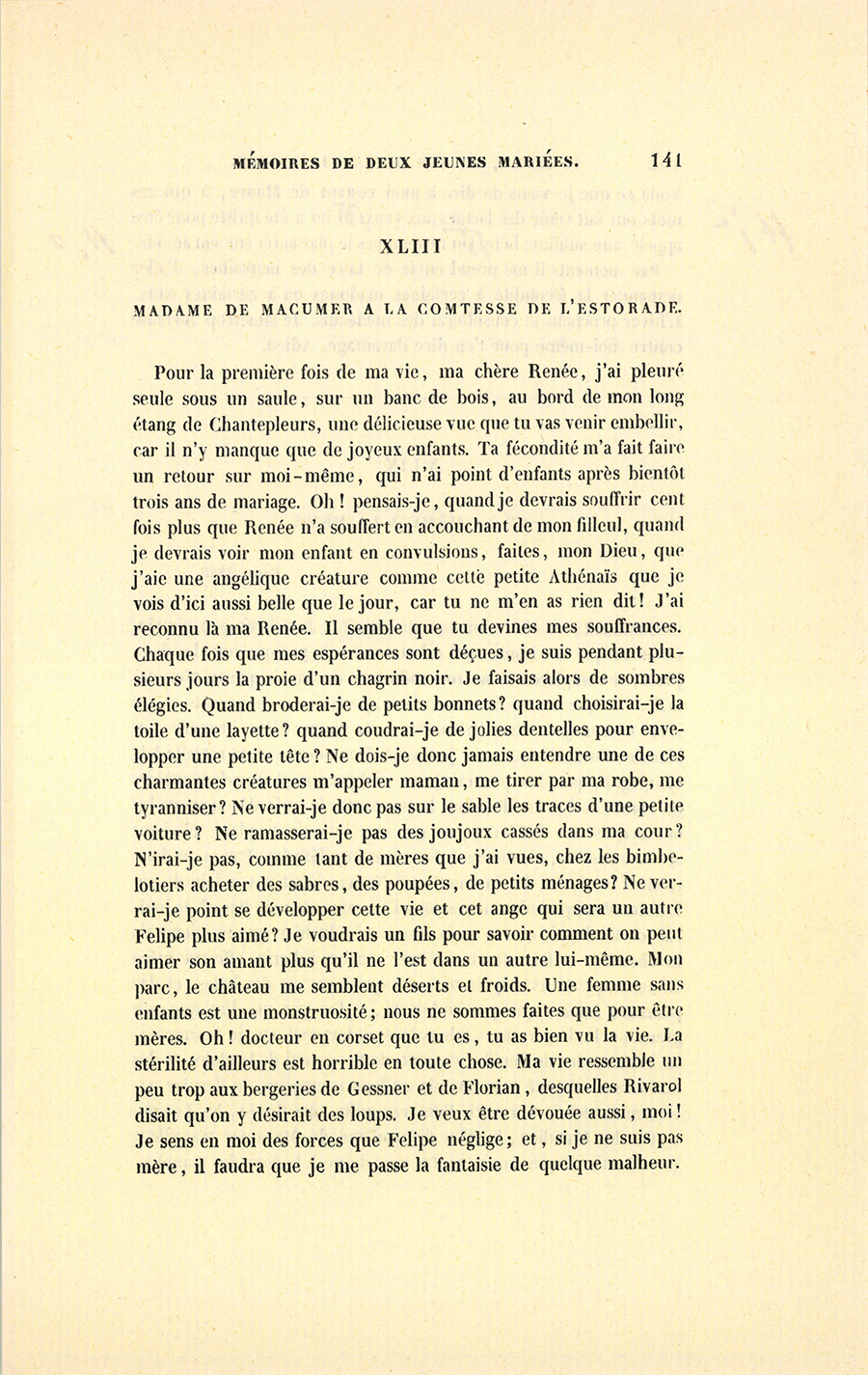 L’amour est, je crois, un poème entièrement personnel. Il n’y a rien qui ne soit à la fois vrai et faux dans tout ce que les auteurs nous en écrivent. En vérité, ma chère belle, comme tu ne peux {p. 43} plus me parler que d’amour conjugal, je crois, dans l’intérêt bien entendu de notre double existence, qu’il est nécessaire que je reste fille, et que j’aie quelque belle passion, pour que nous connaissions bien la vie. Raconte-moi très-exactement tout ce qui t’arrivera, surtout dans les premiers jours, avec cet animal que je nomme un mari. Je te promets la même exactitude, si jamais je suis aimée. Adieu, pauvre chérie engloutie.