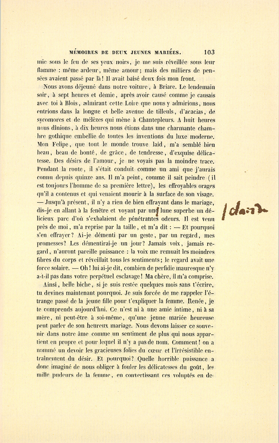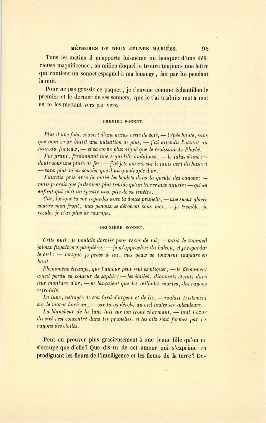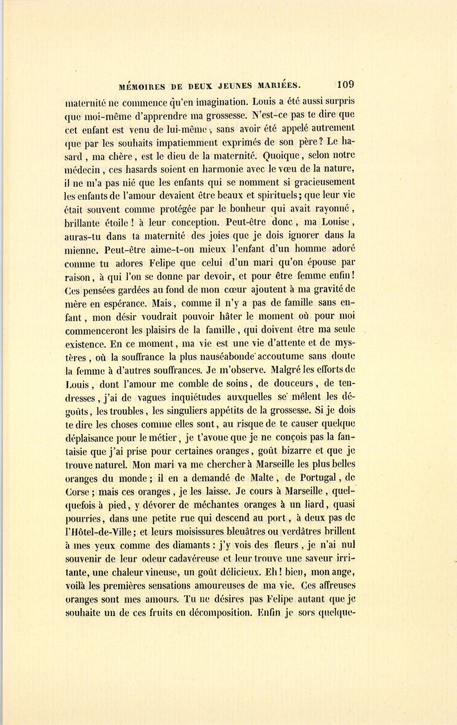 L’amour est, je crois, un poème entièrement personnel. Il n’y a rien qui ne soit à la fois vrai et faux dans tout ce que les auteurs nous en écrivent. En vérité, ma chère belle, comme tu ne peux {p. 43} plus me parler que d’amour conjugal, je crois, dans l’intérêt bien entendu de notre double existence, qu’il est nécessaire que je reste fille, et que j’aie quelque belle passion, pour que nous connaissions bien la vie. Raconte-moi très-exactement tout ce qui t’arrivera, surtout dans les premiers jours, avec cet animal que je nomme un mari. Je te promets la même exactitude, si jamais je suis aimée. Adieu, pauvre chérie engloutie.