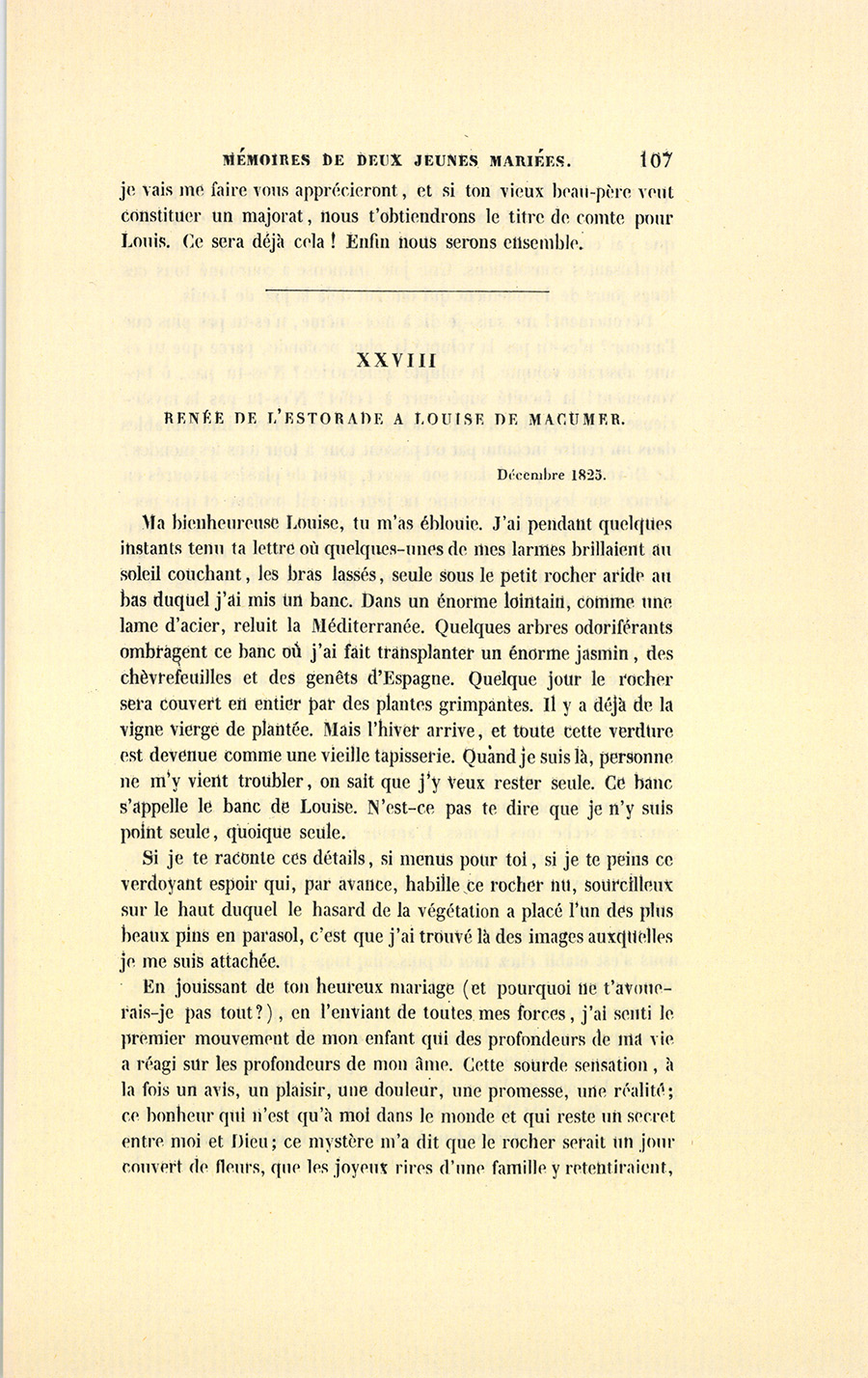 Combien ta lettre m’a émue ! émue surtout par la comparaison de nos destinées. Dans quel monde brillant tu vas vivre ! dans quelle paisible retraite achèverai-je mon obscure carrière ! Quinze jours après mon arrivée au château de Maucombe, duquel je t’ai trop parlé pour t’en parler encore, et où j’ai retrouvé ma chambre à peu près dans l’état où je l’avais laissée, mais d’où j’ai pu comprendre le sublime paysage de la vallée de Gémenos, {p. 23} qu’enfant je regardais sans y rien voir, mon père et ma mère, accompagnés de mes deux frères, m’ont menée dîner chez un de nos voisins, un vieux monsieur de l’Estorade, gentilhomme devenu très-riche comme on devient riche en province, par les soins de l’avarice. Ce vieillard n’avait pu soustraire son fils unique à la rapacité de Buonaparte ; après l’avoir sauvé de la conscription, il avait été forcé de l’envoyer à l’armée, en 1813, en qualité de garde d’honneur : depuis Leipsick, le vieux baron de l’Estorade n’en avait plus eu de nouvelles. Monsieur de Montriveau, que monsieur de l’Estorade alla voir en 1814, lui affirma l’avoir vu prendre par les Russes. Madame de l’Estorade mourut de chagrin en faisant faire d’inutiles recherches en Russie. Le baron, vieillard très-chrétien, pratiquait cette belle vertu théologale que nous cultivions à Blois : l’Espérance ! elle lui faisait voir son fils en rêve, et il accumulait ses revenus pour ce fils ; il prenait soin des parts de ce fils dans les successions qui lui venaient de la famille de feu madame de l’Estorade. Personne n’avait le courage de plaisanter ce vieillard. J’ai fini par deviner que le retour inespéré de ce fils était la cause du mien. Qui nous eût dit que pendant les courses vagabondes de notre pensée, mon futur cheminait lentement à pied à travers la Russie, la Pologne et l’Allemagne ? Sa mauvaise destinée n’a cessé qu’à Berlin, où le ministre français lui a facilité son retour en France. Monsieur de l’Estorade le père, petit gentilhomme de Provence, riche d’environ dix mille livres de rentes, n’a pas un nom assez européen pour qu’on s’intéressât au chevalier de l’Estorade, dont le nom sentait singulièrement son aventurier.