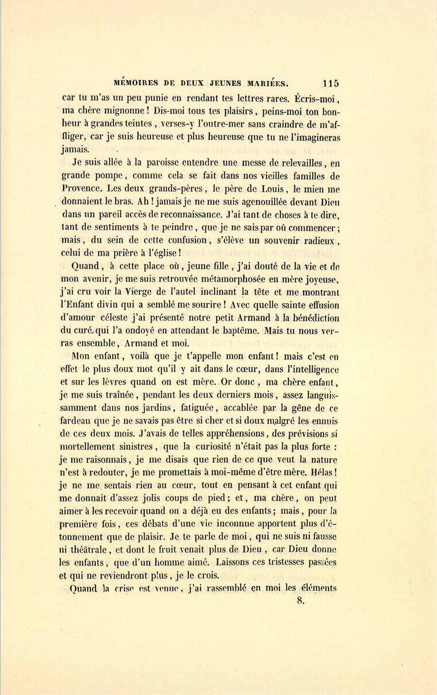 {p. 153} Je te trace ces lignes à la hâte au milieu de mes préparatifs, de mes enfants, et d’Armand qui me crie : – Marraine ! marraine ! allons la voir ! à me rendre jalouse : c’est presque ton fils !
