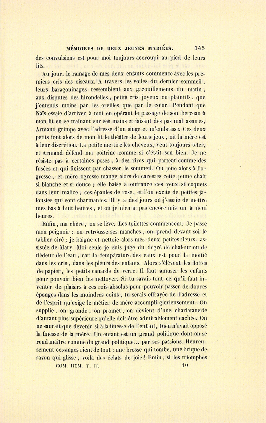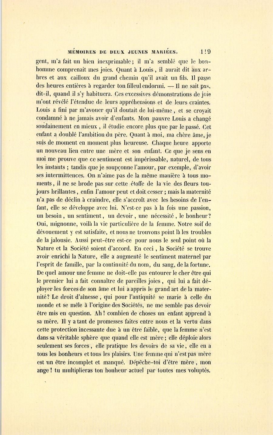 J’ai trente ans, voici le plus fort de la chaleur du jour passé, le plus difficile du chemin fini. Dans quelques années, je serai vieille femme, aussi puisé-je une force immense au sentiment des devoirs accomplis. On dirait que ces trois petits êtres connaissent ma pensée et s’y conforment. Il existe entre eux, qui ne m’ont jamais quittée, et moi, des rapports mystérieux. Enfin, ils m’accablent de jouissances, comme s’ils savaient tout ce qu’ils me doivent de dédommagements.