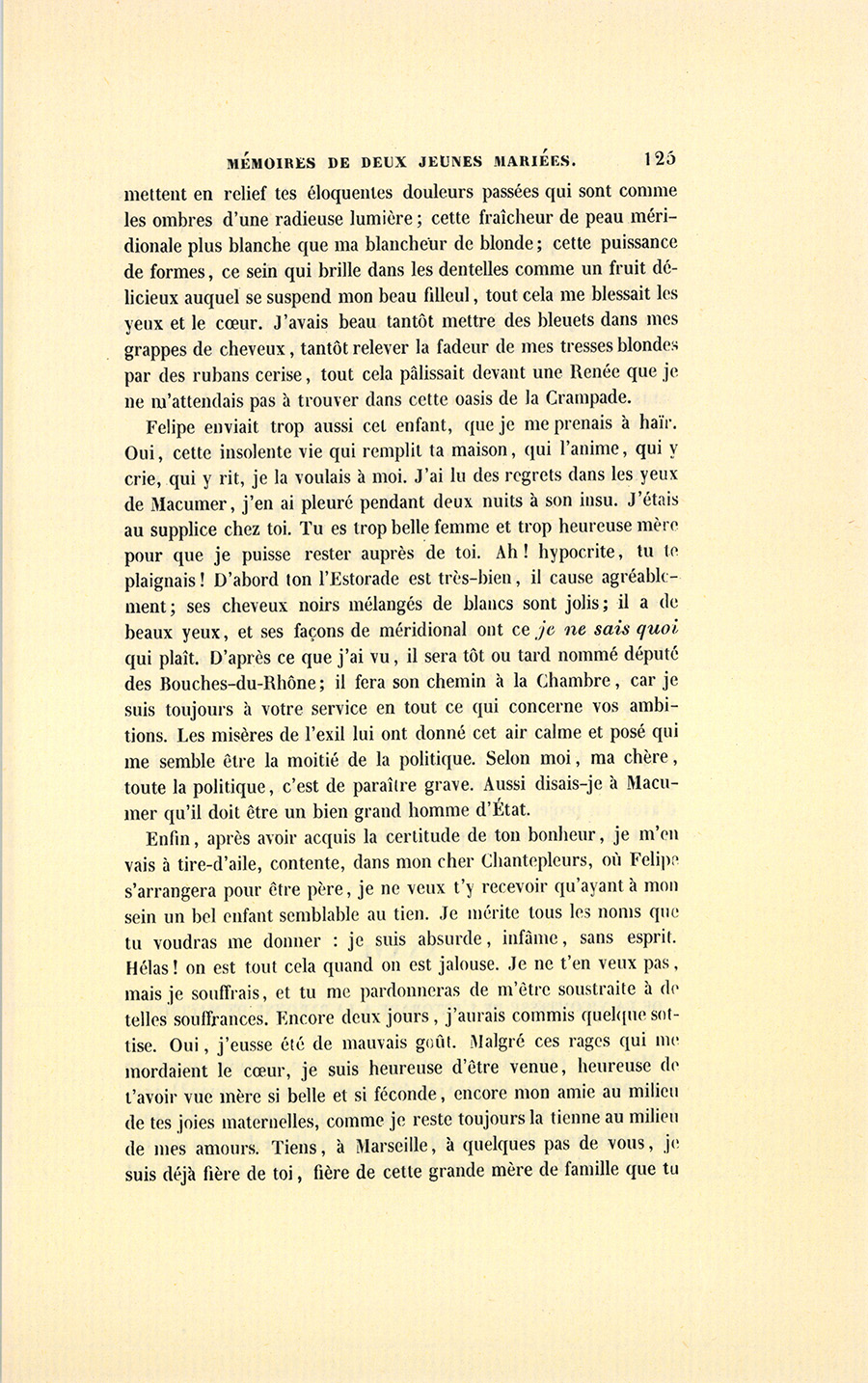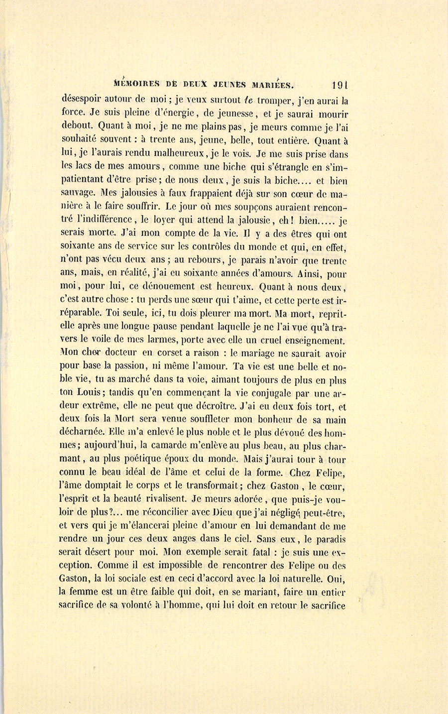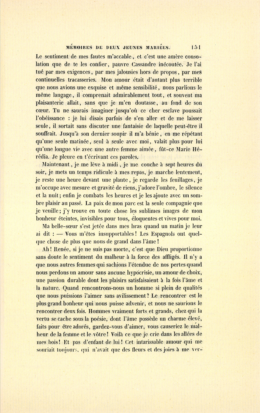 En ce moment j’ai la certitude d’être aimée autant qu’une femme peut être aimée sur cette terre, et j’ai foi dans cette adorable vie conjugale où j’apporte un amour que je ne connaissais pas… Oui, j’éprouve enfin le plaisir de la passion ressentie. Ce que toutes les femmes demandent aujourd’hui à l’amour, le mariage me le donne. Je sens en moi pour Gaston l’adoration que j’inspirais à mon pauvre Felipe ! je ne suis pas maîtresse de moi, je tremble devant cet enfant comme l’Abencerrage tremblait devant moi. Enfin, j’aime plus que je ne suis aimée ; j’ai peur de toute chose, j’ai les frayeurs les plus ridicules, j’ai peur d’être quittée, je tremble d’être vieille et laide quand Gaston sera toujours jeune et beau, je tremble de ne pas lui plaire assez ! Cependant je crois posséder les facultés, le dévouement, l’esprit nécessaires pour, non pas entretenir, mais faire croître cet amour loin du monde et dans la solitude. Si j’échouais, si le magnifique poème de cet amour secret devait avoir une fin, que dis-je une fin ! si Gaston m’aimait un jour moins que la veille, si je m’en aperçois, Renée, sache-le, ce n’est pas à lui, mais à moi que je m’en prendrai. Ce ne sera pas sa faute, ce sera la mienne. Je me connais, je suis plus amante que mère. Aussi te le dis-je d’avance, je mourrais quand même j’aurais des enfants. Avant de me lier avec moi-même, ma Renée, je te supplie donc, si ce malheur m’atteignait, de servir de mère à mes enfants, je te les aurai légués. Ton fanatisme pour le devoir, tes précieuses qualités, ton amour pour les enfants, ta tendresse pour moi, tout ce que je sais de toi me rendra la mort moins amère, je n’ose dire douce. Ce parti pris avec moi-même ajoute je ne sais quoi de terrible à la solennité de ce mariage ; aussi n’y veux-je point de témoins qui me connaissent ; aussi mon mariage sera-t-il célébré secrètement. Je pourrai trembler à mon aise, je ne verrai pas dans tes chers yeux une inquiétude, et moi seule saurai qu’en signant un nouvel acte de mariage je puis avoir signé mon arrêt de mort.
