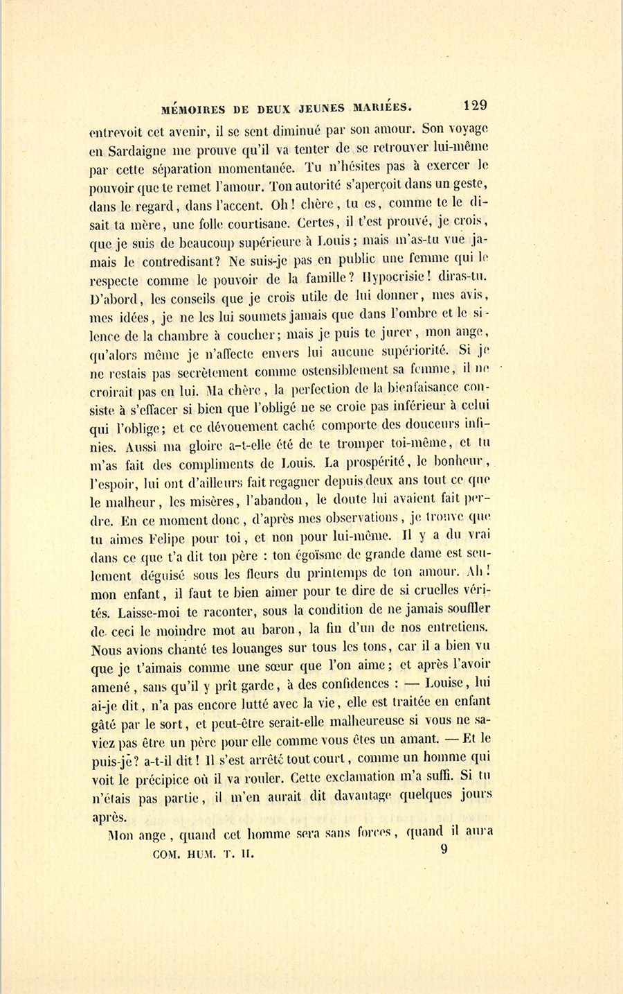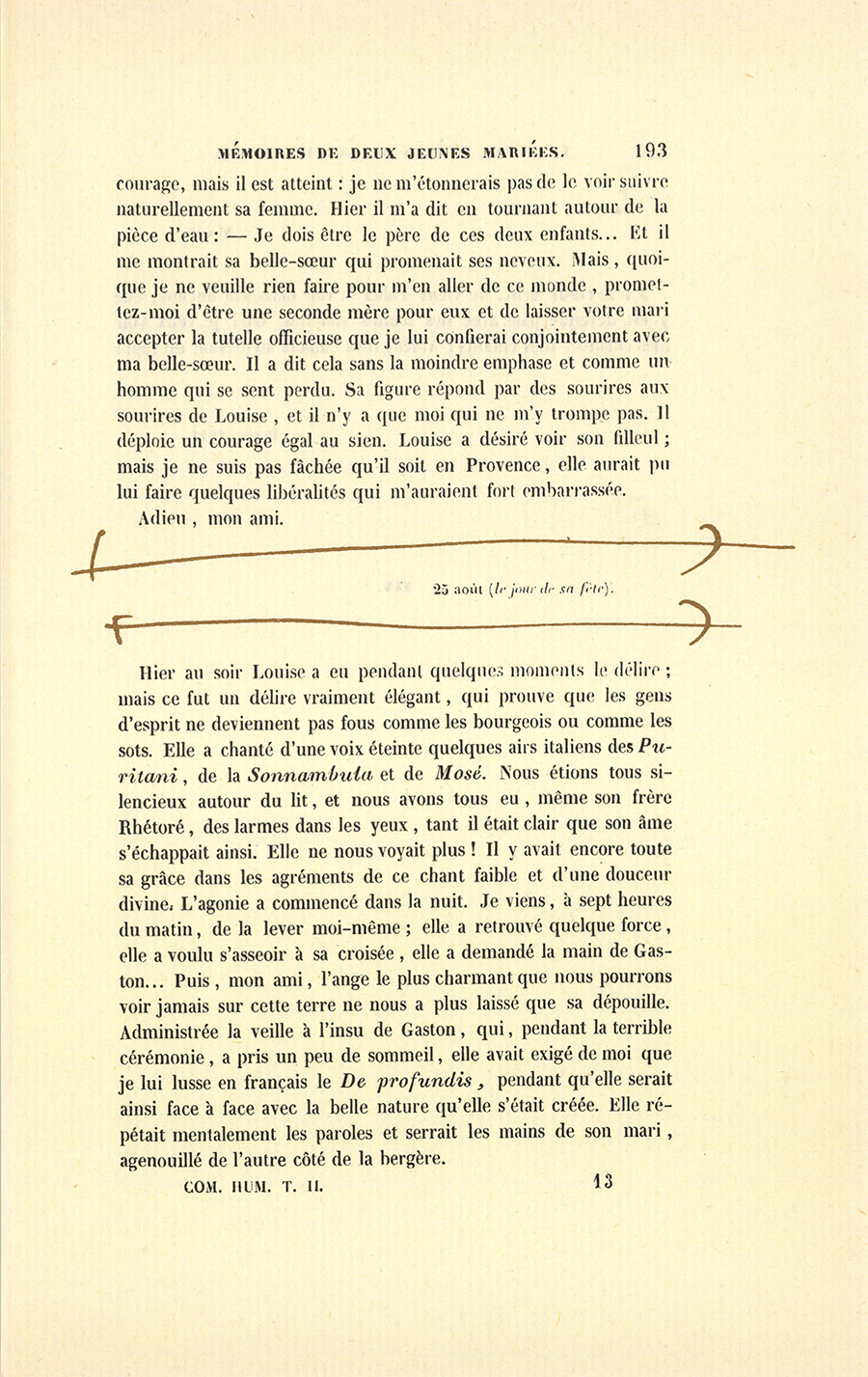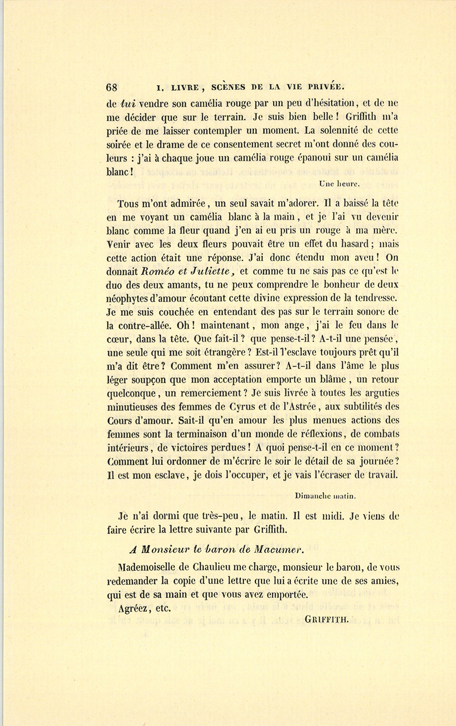 {p. 52} Ceci, ma chère madame de l’Estorade, s’est passé depuis quinze jours, et voilà quinze jours que je n’ai vu cet homme qui m’aime, car cet homme m’aime. Que fait-il ? Je voudrais être mouche, souris, moineau. Je voudrais pouvoir le voir, seul, chez lui, sans qu’il m’aperçût. Nous avons un homme à qui je puis dire : Allez mourir pour moi !… Et il est de caractère à y aller, je le crois du moins. Enfin, il y a dans Paris un homme à qui je pense, et dont le regard m’inonde intérieurement de lumière. Oh ! c’est un ennemi que je dois fouler aux pieds. Comment, il y aurait un homme sans lequel je ne pourrais vivre, qui me serait nécessaire ! Tu te maries et j’aime ! Au bout de quatre mois, ces deux colombes qui s’élevaient si haut sont tombées dans les marais de la réalité.