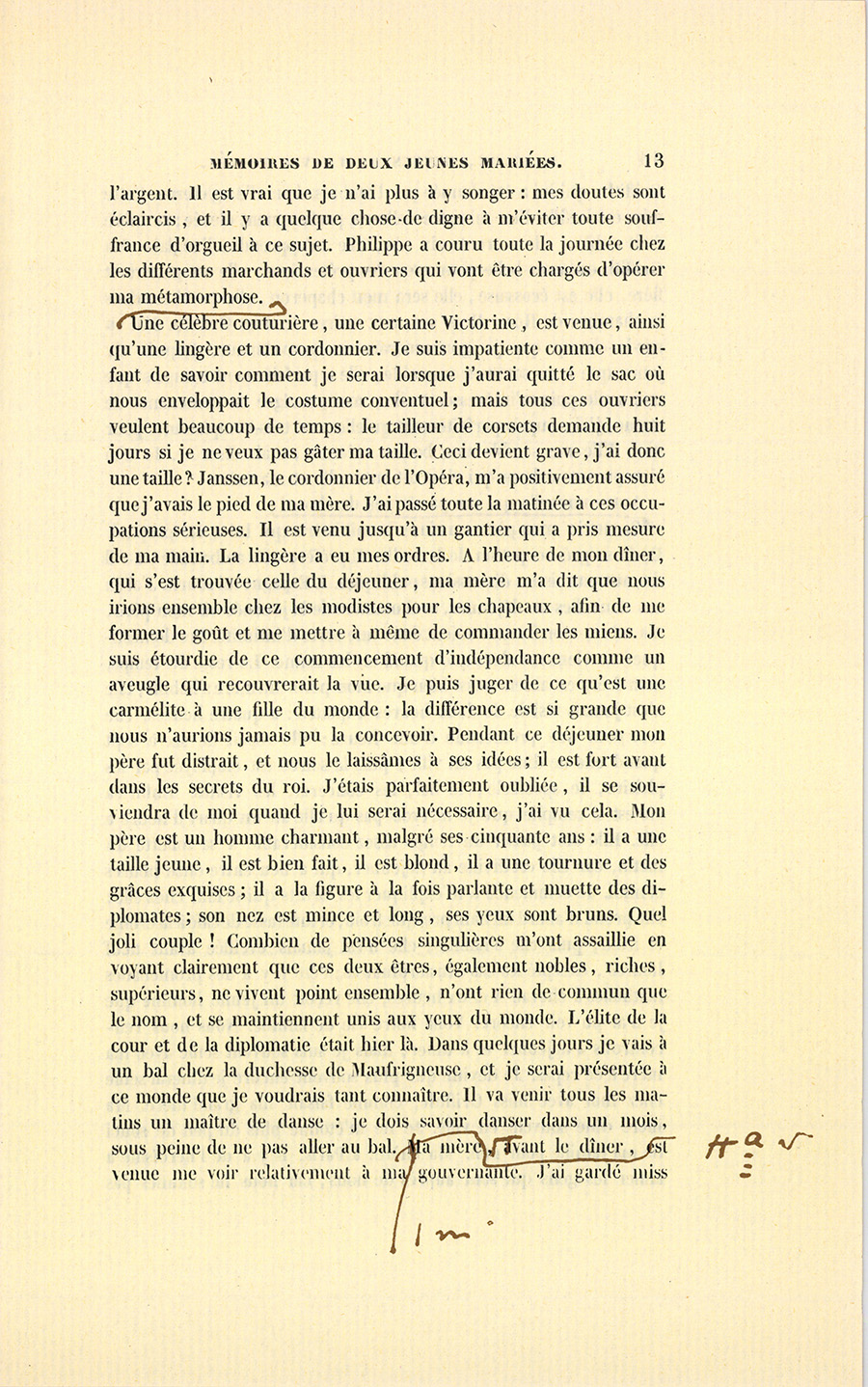 Je suis restée assise sur le sofa de ma grand’mère, les yeux sur la bourse que mon père avait laissée sur la cheminée, à la fois satisfaite et mécontente de cette attention qui maintenait ma pensée sur {p. 13} l’argent. Il est vrai que je n’ai plus à y songer : mes doutes sont éclaircis, et il y a quelque chose de digne à m’éviter toute souffrance d’orgueil à ce sujet. Philippe a couru toute la journée chez les différents marchands et ouvriers qui vont être chargés d’opérer ma métamorphose. Une célèbre couturière, une certaine Victorine, est venue, ainsi qu’une lingère et un cordonnier. Je suis impatiente comme un enfant de savoir comment je serai lorsque j’aurai quitté le sac où nous enveloppait le costume conventuel ; mais tous ces ouvriers veulent beaucoup de temps : le tailleur de corsets demande huit jours si je ne veux pas gâter ma taille. Ceci devient grave, j’ai donc une taille ? Janssen, le cordonnier de l’Opéra, m’a positivement assuré que j’avais le pied de ma mère. J’ai passé toute la matinée à ces occupations sérieuses. Il est venu jusqu’à un gantier qui a pris mesure de ma main. La lingère a eu mes ordres. À l’heure de mon dîner, qui s’est trouvée celle du déjeuner, ma mère m’a dit que nous irions ensemble chez les modistes pour les chapeaux, afin de me former le goût et me mettre à même de commander les miens. Je suis étourdie de ce commencement d’indépendance comme un aveugle qui recouvrerait la vue. Je puis juger de ce qu’est une carmélite à une fille du monde : la différence est si grande que nous n’aurions jamais pu la concevoir. Pendant ce déjeuner mon père fut distrait, et nous le laissâmes à ses idées ; il est fort avant dans les secrets du roi. J’étais parfaitement oubliée, il se souviendra de moi quand je lui serai nécessaire, j’ai vu cela. Mon père est un homme charmant, malgré ses cinquante ans : il a une taille jeune, il est bien fait, il est blond, il a une tournure et des grâces exquises ; il a la figure à la fois parlante et muette des diplomates ; son nez est mince et long, ses yeux sont bruns. Quel joli couple ! Combien de pensées singulières m’ont assaillie en voyant clairement que ces deux êtres, également nobles, riches, supérieurs, ne vivent point ensemble, n’ont rien de commun que le nom, et se maintiennent unis aux yeux du monde. L’élite de la cour et de la diplomatie était hier là. Dans quelques jours je vais à un bal chez la duchesse de Maufrigneuse, et je serai présentée à ce monde que je voudrais tant connaître. Il va venir tous les matins un maître de danse : je dois savoir danser dans un mois, sous peine de ne pas aller au bal. Avant le dîner, ma mère est venue me voir relativement à ma gouvernante. J’ai gardé miss {p. 14} Griffith, qui lui a été donnée par l’ambassadeur d’Angleterre. Cette miss est la fille d’un ministre : elle est parfaitement élevée ; sa mère était noble, elle a trente-six ans, elle m’apprendra l’anglais. Ma Griffith est assez belle pour avoir des prétentions ; elle est pauvre et fière, elle est écossaise, elle sera mon chaperon, elle couchera dans la chambre de Rose. Rose sera aux ordres de miss Griffith. J’ai vu sur-le-champ que je gouvernerais ma gouvernante. Depuis six jours que nous sommes ensemble, elle a parfaitement compris que moi seule puis m’intéresser à elle ; moi, malgré sa contenance de statue, j’ai compris parfaitement qu’elle sera très-complaisante pour moi. Elle me semble une bonne créature, mais discrète. Je n’ai rien pu savoir de ce qui s’est dit entre elle et ma mère.