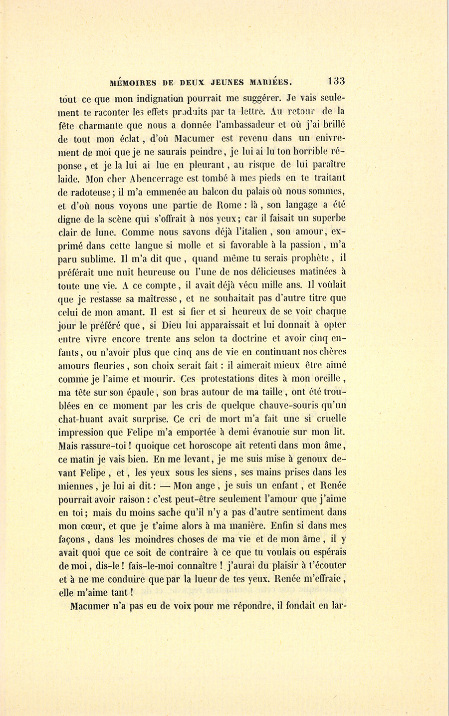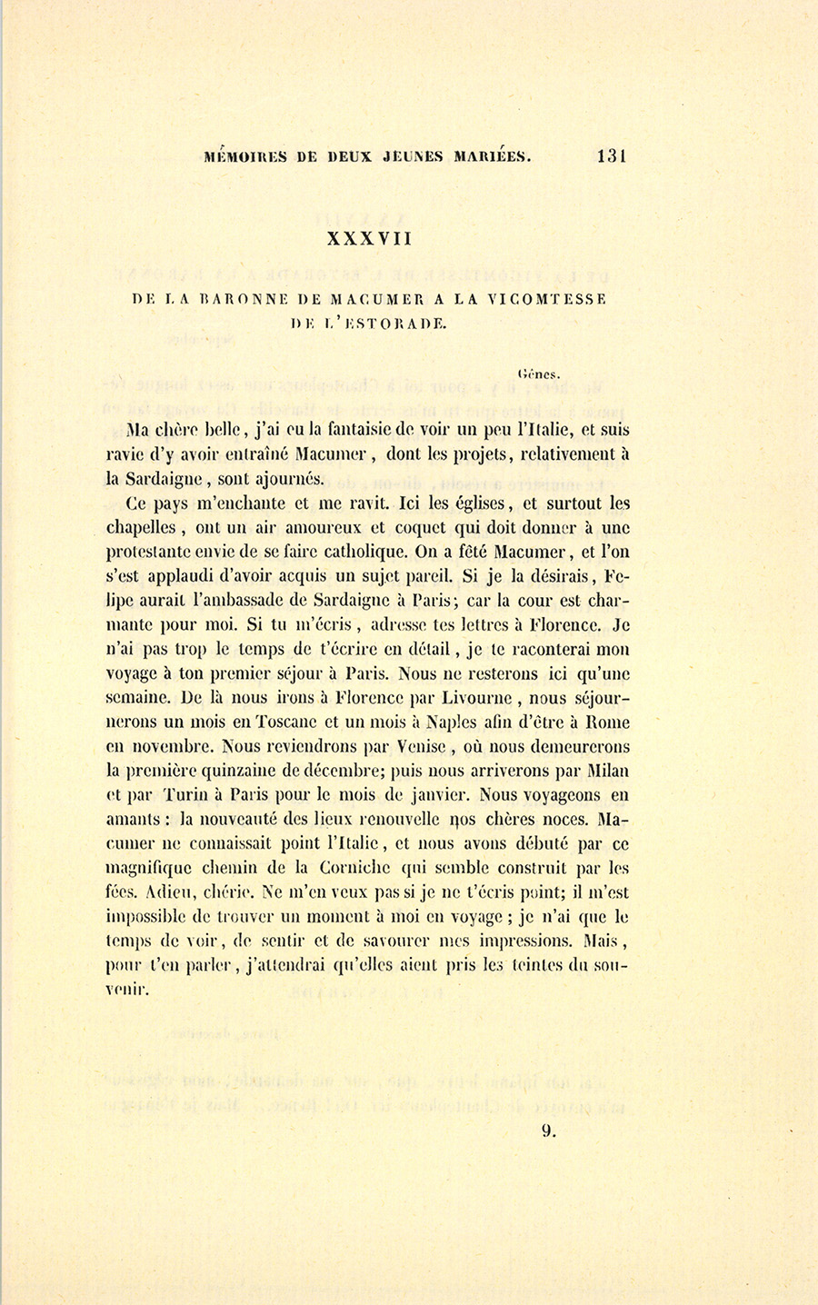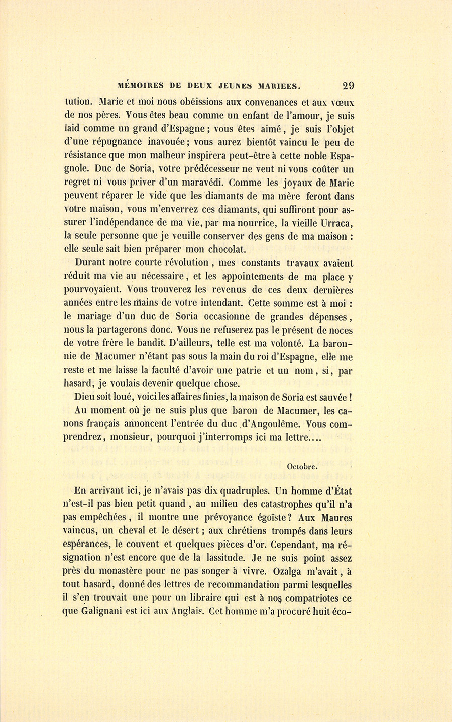 Au moment où je ne suis plus que baron de Macumer, les canons français annoncent l’entrée du duc d’Angoulême. Vous comprendrez, monsieur, pourquoi j’interromps ici ma lettre…