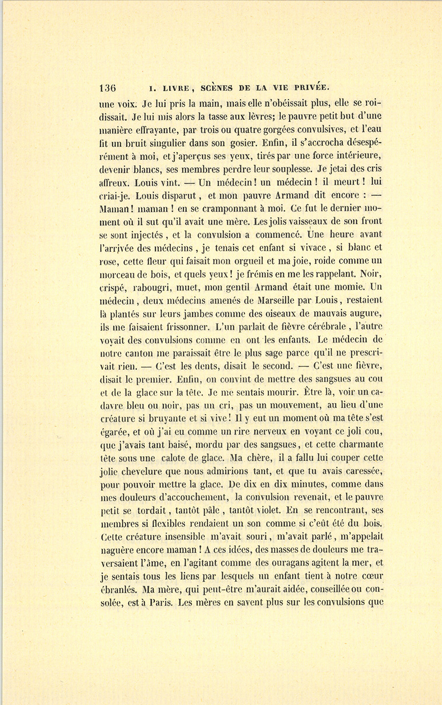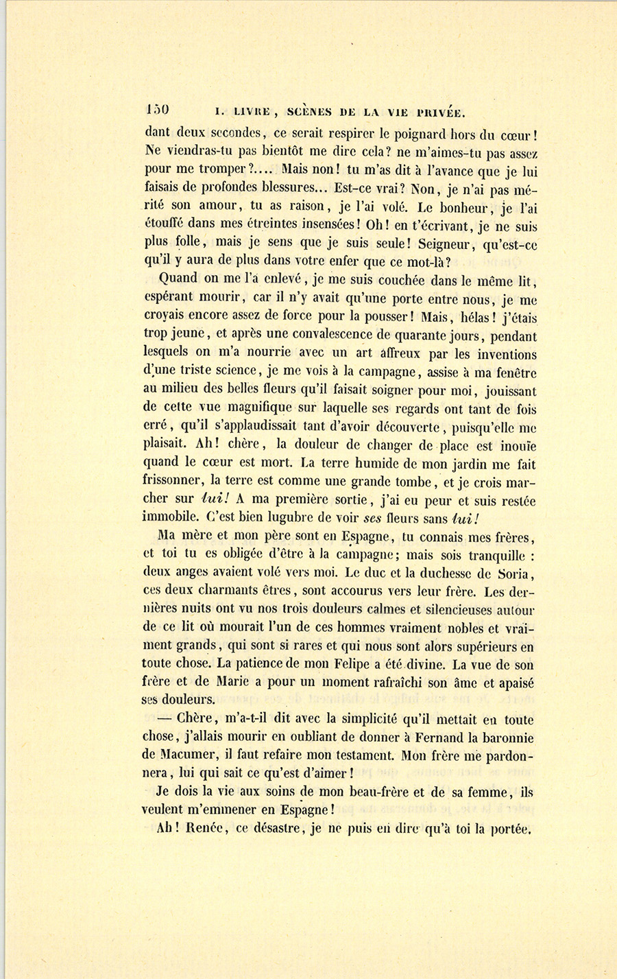 Oh ! Renée, dans la solitude, une pensée ravageuse vous conduit au suicide. Ces délicieux jardins, cette nuit étoilée, cette {p. 180} fraîcheur qui m’envoyait par bouffées l’encens de toutes nos fleurs, notre vallée, nos collines, tout me semblait sombre, noir et désert. J’étais comme au fond d’un précipice au milieu des serpents, des plantes vénéneuses ; je ne voyais plus de Dieu dans le ciel. Après une nuit pareille une femme a vieilli.