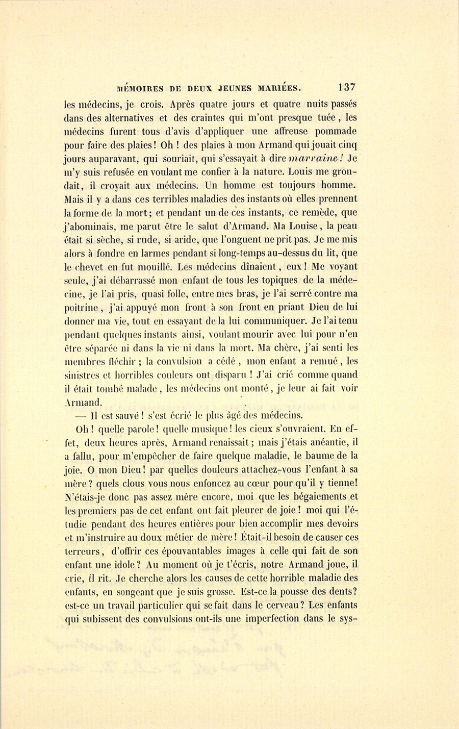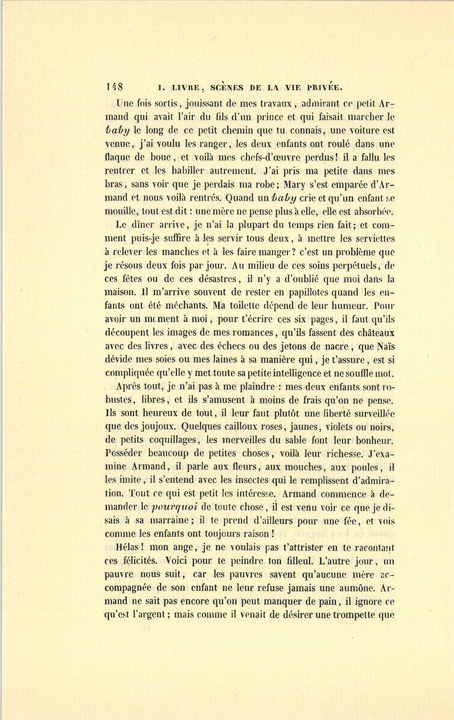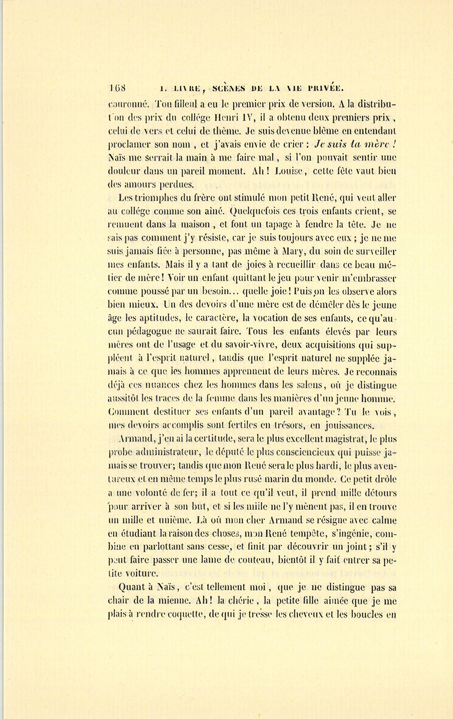 Ah ! Louise, je suis une bienheureuse mère ! Mes enfants continuent à me donner des joies sans ombre. (Senza brama sicura richezza.) Armand est au collége Henri IV. Je me suis décidée pour l’éducation publique sans pouvoir me décider néanmoins à m’en séparer, et j’ai fait comme faisait le duc d’Orléans avant d’être et peut-être pour devenir Louis-Philippe. Tous les matins, Lucas, ce vieux domestique que tu connais, mène Armand au collége à l’heure de la première étude, et me le ramène à quatre heures et demie. Un vieux et savant répétiteur, qui loge chez moi, le fait travailler le soir et le réveille le matin à l’heure où les collégiens se lèvent. Lucas lui porte une collation à midi pendant la récréation. Ainsi, je le vois pendant le dîner, le soir avant son coucher, et j’assiste le matin à son départ. Armand est toujours le charmant enfant plein de cœur et de dévouement que tu aimes ; son répétiteur est content de lui. J’ai ma Naïs avec moi et le petit qui bourdonnent sans cesse, mais je suis aussi enfant qu’eux. Je n’ai pas pu me résoudre à perdre la douceur des caresses de mes chers enfants. Il y a pour moi dans la possibilité de courir, dès que je le désire, au lit d’Armand, pour le voir pendant son sommeil, ou pour aller {p. 167} prendre, demander, recevoir un baiser de cet ange, une nécessité de mon existence.