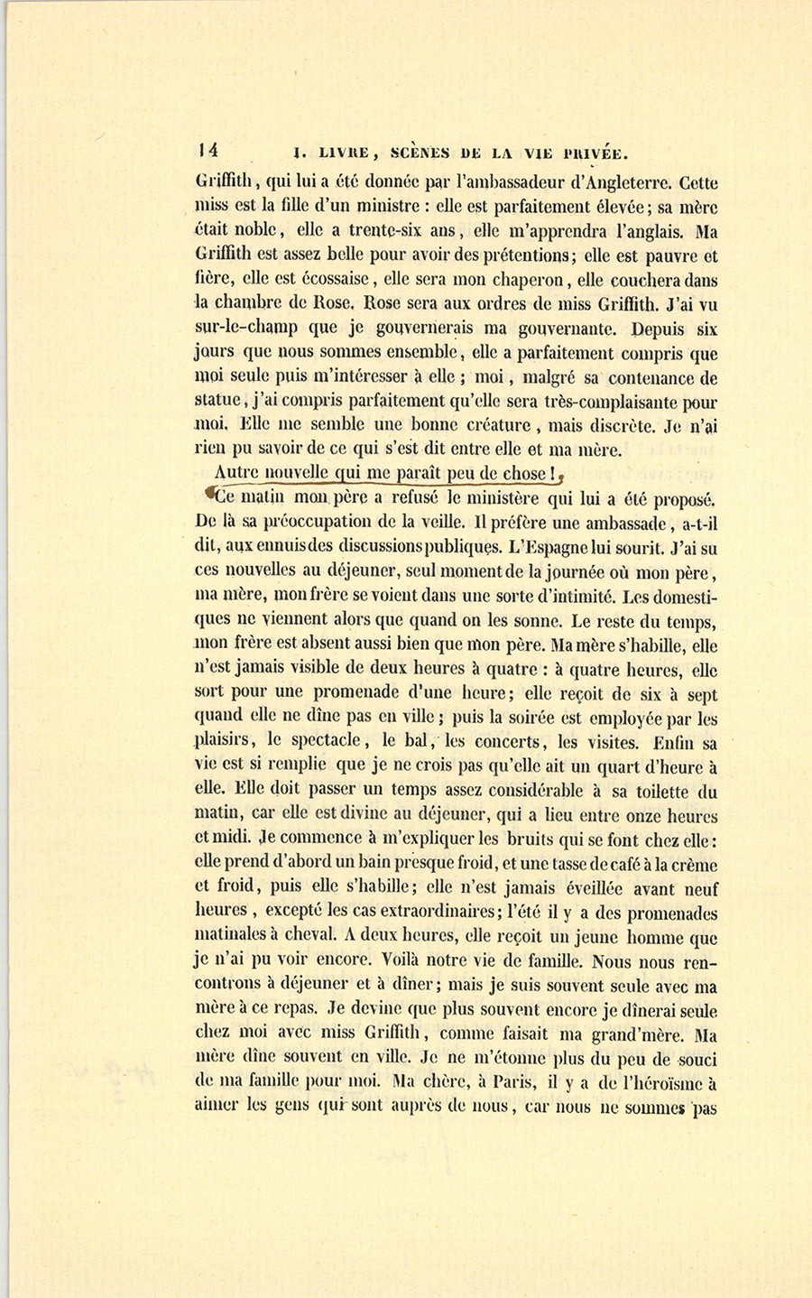 Ma chère, tu ne vois là rien que de simple, et néanmoins il y a là des choses monstrueuses : en quinze jours, j’ai découvert les secrets de la maison. Ma mère suivrait mon père à Madrid, s’il voulait prendre monsieur de Canalis en qualité de secrétaire d’ambassade ; mais le roi désigne les secrétaires, le duc n’ose pas contrarier le roi qui est fort absolu, ni fâcher ma mère ; et ce grand politique croit avoir tranché les difficultés en laissant ici la duchesse. Monsieur de Canalis, le grand poète du jour, est le jeune homme qui cultive la société de ma mère, et qui étudie sans doute avec elle la diplomatie de trois heures à cinq heures. La diplomatie doit être une belle chose, car il est assidu comme un joueur à la Bourse. Monsieur le duc de Rhétoré, notre aîné, solennel, froid et fantasque, serait écrasé par son père à Madrid, il reste à Paris. Miss Griffith sait d’ailleurs qu’Alphonse aime une danseuse de l’Opéra. Comment peut-on aimer des jambes et des pirouettes ? Nous avons remarqué que mon frère assiste aux représentations quand y danse Tullia, il applaudit les pas de cette créature et sort après. Je crois que deux filles dans une maison y font plus de ravages que n’en ferait la peste. Quant à mon second frère, il est à son régiment, je ne l’ai pas {p. 34} encore vu. Voilà comment je suis destinée à être l’Antigone d’un ambassadeur de Sa Majesté. Peut-être me marierai-je en Espagne, et peut-être la pensée de mon père est-elle de m’y marier sans dot, absolument comme on te marie à ce reste de vieux garde d’honneur. Mon père m’a proposé de le suivre et m’a offert son maître d’espagnol. – Vous voulez, lui ai-je dit, me faire faire des mariages en Espagne ? Il m’a, pour toute réponse, honorée d’un fin regard. Il aime depuis quelques jours à m’agacer au déjeuner, il m’étudie et je dissimule ; aussi l’ai-je, comme père et comme ambassadeur, in petto, cruellement mystifié. Ne me prenait-il pas pour une sotte ? Il me demandait ce que je pensais de tel jeune homme et de quelques demoiselles avec lesquels je me suis trouvée dans plusieurs maisons. Je lui ai répondu par la plus stupide discussion sur la couleur des cheveux, sur la différence des tailles, sur la physionomie des jeunes gens. Mon père parut désappointé de me trouver si niaise, il se blâma intérieurement de m’avoir interrogée. – Cependant, mon père, ajoutai-je, je ne dis pas ce que je pense réellement : ma mère m’a dernièrement fait peur d’être inconvenante en parlant de mes impressions. – En famille, vous pouvez vous expliquer sans crainte, répondit ma mère. – Eh bien ! repris-je, les jeunes gens m’ont jusqu’à présent paru être plus intéressés qu’intéressants, plus occupés d’eux que de nous ; mais ils sont, à la vérité, très-peu dissimulés : ils quittent à l’instant la physionomie qu’ils ont prise pour nous parler, et s’imaginent sans doute que nous ne savons point nous servir de nos yeux. L’homme qui nous parle est l’amant, l’homme qui ne nous parle plus est le mari. Quant aux jeunes personnes, elles sont si fausses qu’il est impossible de deviner leur caractère autrement que par celui de leur danse, il n’y a que leur taille et leurs mouvements qui ne mentent point. J’ai surtout été effrayée de la brutalité du beau monde. Quand il s’agit de souper, il se passe, toutes proportions gardées, des choses qui me donnent une image des émeutes populaires. La politesse cache très-imparfaitement l’égoïsme général. Je me figurais le monde autrement. Les femmes y sont comptées pour peu de chose, et peut-être est-ce un reste des doctrines de Bonaparte. – Armande fait d’étonnants progrès, a dit ma mère. – Ma mère, croyez-vous que je vous demanderai toujours si madame de Staël est morte ? Mon père sourit et se leva.