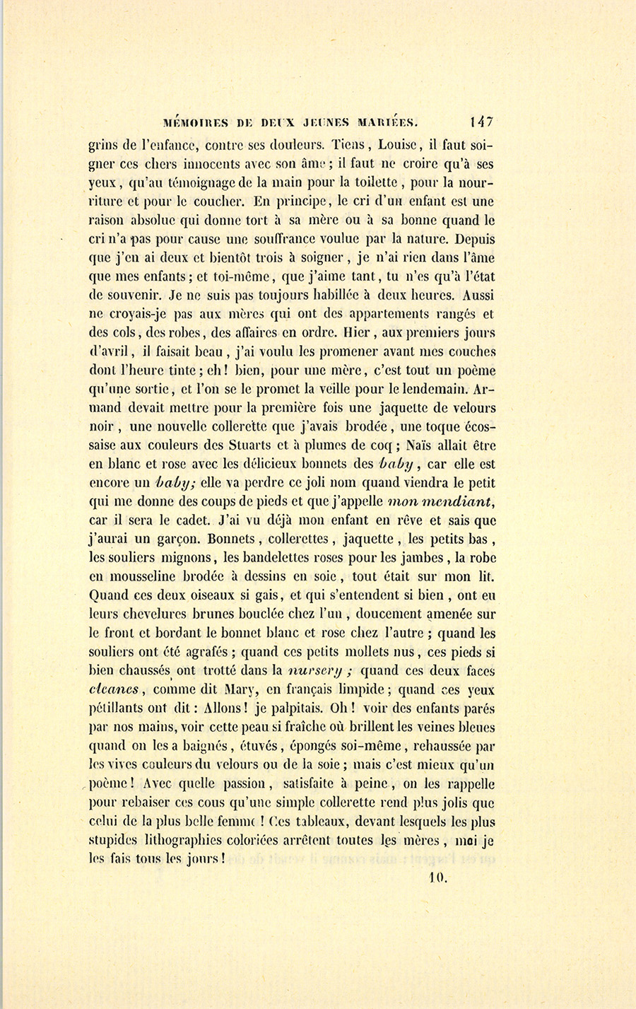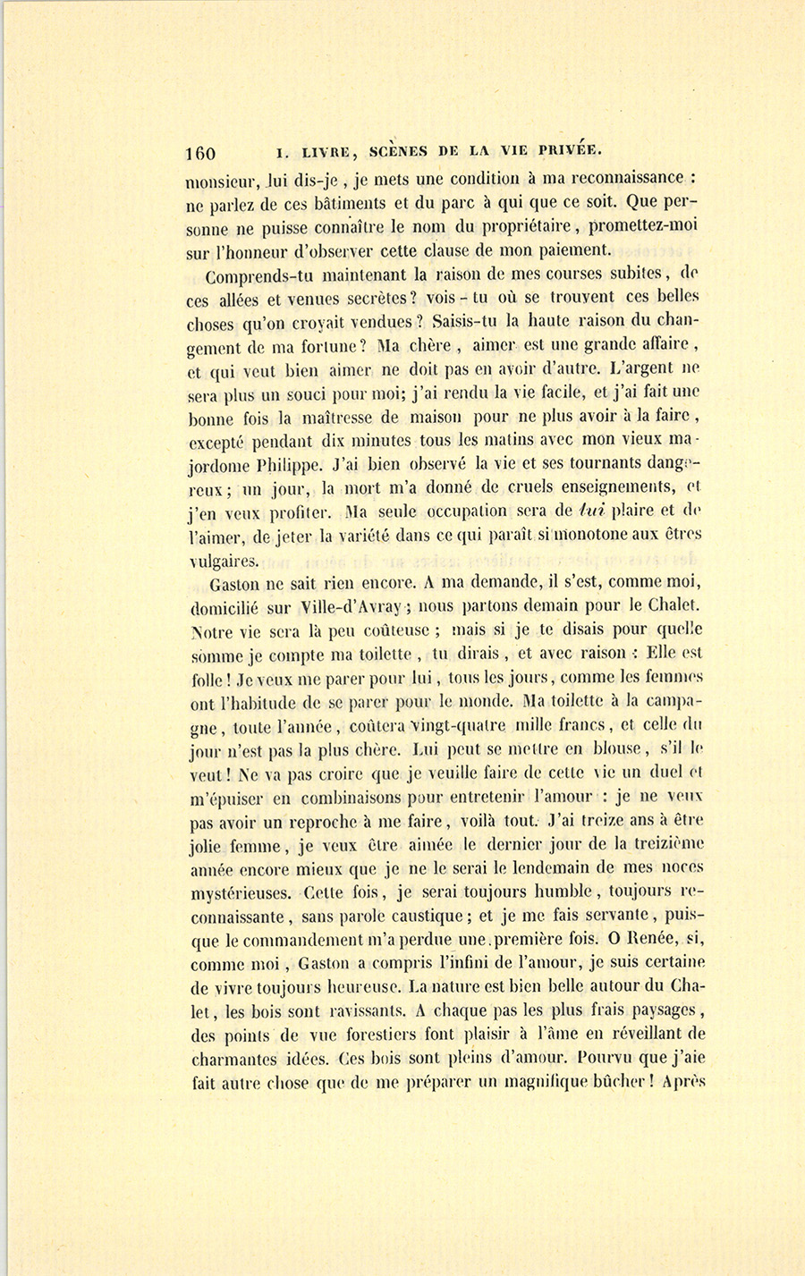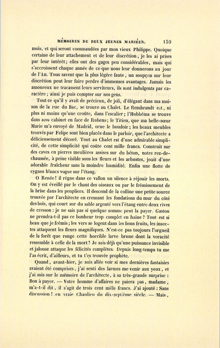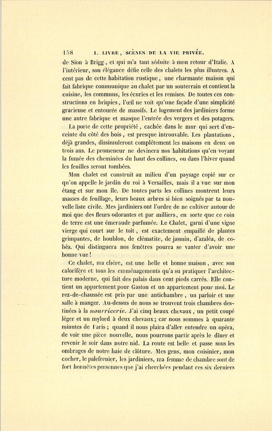 Ce chalet, ma chère, est une belle et bonne maison, avec son calorifère et tous les emménagements qu’a su pratiquer l’architecture moderne, qui fait des palais dans cent pieds carrés. Elle contient un appartement pour Gaston et un appartement pour moi. Le rez-de-chaussée est pris par une antichambre, un parloir et une salle à manger. Au-dessus de nous se trouvent trois chambres destinées à la nourricerie. J’ai cinq beaux chevaux, un petit coupé léger et un mylord à deux chevaux ; car nous sommes à quarante minutes de Paris ; quand il nous plaira d’aller entendre un opéra, de voir une pièce nouvelle, nous pourrons partir après le dîner et revenir le soir dans notre nid. La route est belle et passe sous les ombrages de notre haie de clôture. Mes gens, mon cuisinier, mon cocher, le palefrenier, les jardiniers, ma femme de chambre sont de fort honnêtes personnes que j’ai cherchées pendant ces six derniers {p. 159} mois, et qui seront commandées par mon vieux Philippe. Quoique certaine de leur attachement et de leur discrétion, je les ai prises par leur intérêt ; elles ont des gages peu considérables, mais qui s’accroissent chaque année de ce que nous leur donnerons au jour de l’An. Tous savent que la plus légère faute, un soupçon sur leur discrétion peut leur faire perdre d’immenses avantages. Jamais les amoureux ne tracassent leurs serviteurs, ils sont indulgents par caractère ; ainsi je puis compter sur nos gens.