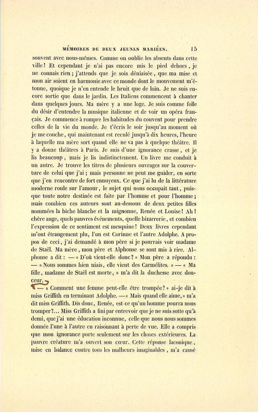 Autre nouvelle qui me paraît peu de chose ! Ce matin mon père a refusé le ministère qui lui a été proposé. De là sa préoccupation de la veille. Il préfère une ambassade, a-t-il dit, aux ennuis des discussions publiques. L’Espagne lui sourit. J’ai su ces nouvelles au déjeuner, seul moment de la journée où mon père, ma mère, mon frère se voient dans une sorte d’intimité. Les domestiques ne viennent alors que quand on les sonne. Le reste du temps, mon frère est absent aussi bien que mon père. Ma mère s’habille, elle n’est jamais visible de deux heures à quatre : à quatre heures, elle sort pour une promenade d’une heure ; elle reçoit de six à sept quand elle ne dîne pas en ville ; puis la soirée est employée par les plaisirs, le spectacle, le bal, les concerts, les visites. Enfin sa vie est si remplie que je ne crois pas qu’elle ait un quart d’heure à elle. Elle doit passer un temps assez considérable à sa toilette du matin, car elle est divine au déjeuner, qui a lieu entre onze heures et midi. Je commence à m’expliquer les bruits qui se font chez elle : elle prend d’abord un bain presque froid, et une tasse de café à la crème et froid, puis elle s’habille ; elle n’est jamais éveillée avant neuf heures, excepté les cas extraordinaires ; l’été il y a des promenades matinales à cheval. À deux heures, elle reçoit un jeune homme que je n’ai pu voir encore. Voilà notre vie de famille. Nous nous rencontrons à déjeuner et à dîner ; mais je suis souvent seule avec ma mère à ce repas. Je devine que plus souvent encore je dînerai seule chez moi avec miss Griffith, comme faisait ma grand’mère. Ma mère dîne souvent en ville. Je ne m’étonne plus du peu de souci de ma famille pour moi. Ma chère, à Paris, il y a de l’héroïsme à aimer les gens qui sont auprès de nous, car nous ne sommes pas {p. 15} souvent avec nous-mêmes. Comme on oublie les absents dans cette ville ! Et cependant je n’ai pas encore mis le pied dehors, je ne connais rien ; j’attends que je sois déniaisée, que ma mise et mon air soient en harmonie avec ce monde dont le mouvement m’étonne, quoique je n’en entende le bruit que de loin. Je ne suis encore sortie que dans le jardin. Les Italiens commencent à chanter dans quelques jours. Ma mère y a une loge. Je suis comme folle du désir d’entendre la musique italienne et de voir un opéra français. Je commence à rompre les habitudes du couvent pour prendre celles de la vie du monde. Je t’écris le soir jusqu’au moment où je me couche, qui maintenant est reculé jusqu’à dix heures, l’heure à laquelle ma mère sort quand elle ne va pas à quelque théâtre. Il y a douze théâtres à Paris. Je suis d’une ignorance crasse, et je lis beaucoup, mais je lis indistinctement. Un livre me conduit à un autre. Je trouve les titres de plusieurs ouvrages sur la couverture de celui que j’ai ; mais personne ne peut me guider, en sorte que j’en rencontre de fort ennuyeux. Ce que j’ai lu de la littérature moderne roule sur l’amour, le sujet qui nous occupait tant, puisque toute notre destinée est faite par l’homme et pour l’homme ; mais combien ces auteurs sont au-dessous de deux petites filles nommées la biche blanche et la mignonne, Renée et Louise ! Ah ! chère ange, quels pauvres événements, quelle bizarrerie, et combien l’expression de ce sentiment est mesquine ! Deux livres cependant m’ont étrangement plu, l’un est Corinne et l’autre Adolphe. À propos de ceci, j’ai demandé à mon père si je pourrais voir madame de Staël. Ma mère, mon père et Alphonse se sont mis à rire. Alphonse a dit : – « D’où vient-elle donc ? » Mon père a répondu : – « Nous sommes bien niais, elle vient des Carmélites. » – « Ma fille, madame de Staël est morte », m’a dit la duchesse avec douceur. – « Comment une femme peut-elle être trompée ? » ai-je dit à miss Griffith en terminant Adolphe. – « Mais quand elle aime », m’a dit miss Griffith. Dis donc, Renée, est-ce qu’un homme pourra nous tromper ?… Miss Griffith a fini par entrevoir que je ne suis sotte qu’à demi, que j’ai une éducation inconnue, celle que nous nous sommes donnée l’une à l’autre en raisonnant à perte de vue. Elle a compris que mon ignorance porte seulement sur les choses extérieures. La pauvre créature m’a ouvert son cœur. Cette réponse laconique, mise en balance contre tous les malheurs imaginables, m’a causé {p. 16} un léger frisson. La Griffith me répéta de ne me laisser éblouir par rien dans le monde et de me défier de tout, principalement de ce qui me plaira le plus. Elle ne sait et ne peut rien me dire de plus. Ce discours est trop monotone. Elle se rapproche en ceci de la nature de l’oiseau qui n’a qu’un cri.