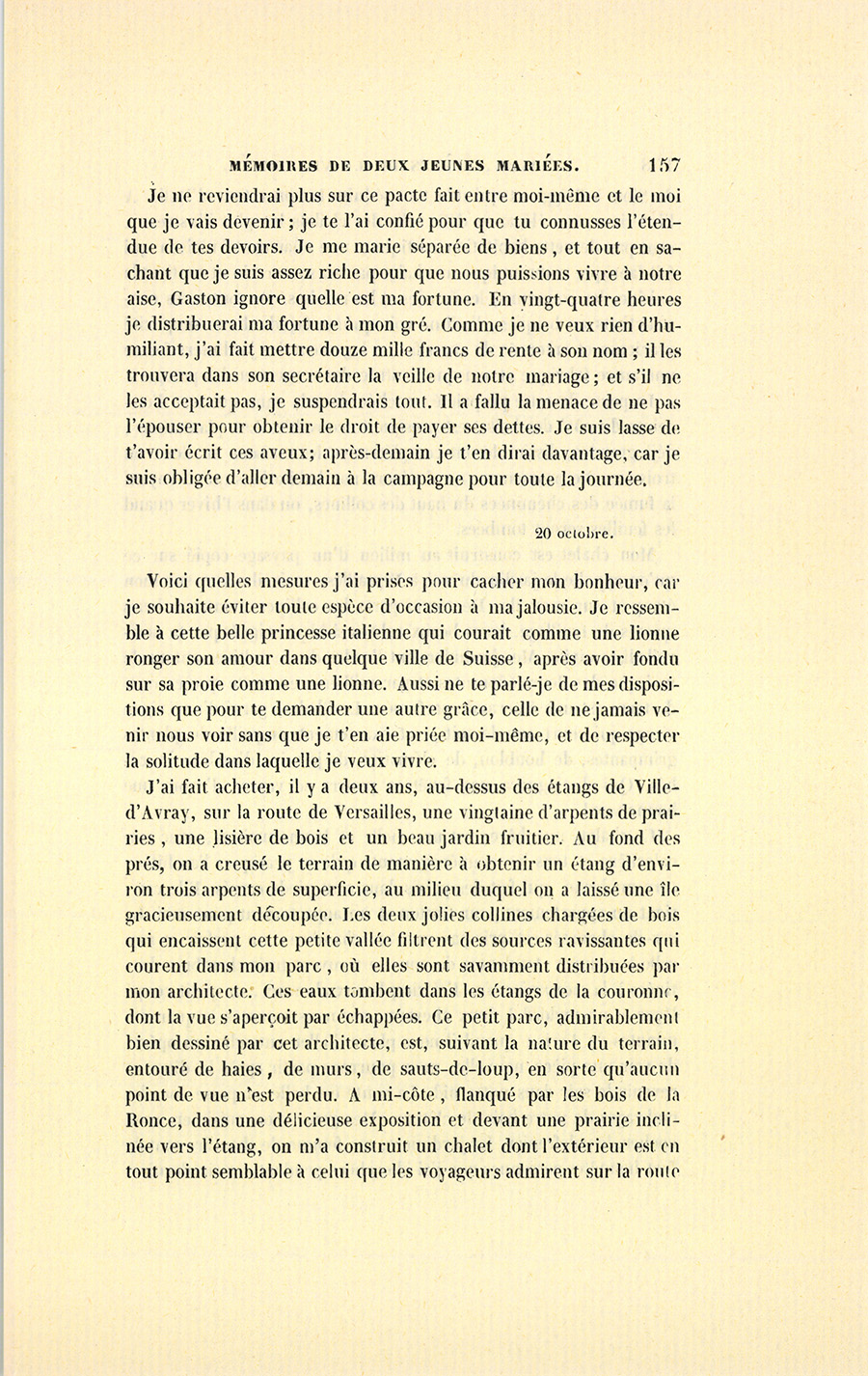 {p. 157} Je ne reviendrai plus sur ce pacte fait entre moi-même et le moi que je vais devenir ; je te l’ai confié pour que tu connusses l’étendue de tes devoirs. Je me marie séparée de biens, et tout en sachant que je suis assez riche pour que nous puissions vivre à notre aise, Gaston ignore quelle est ma fortune. En vingt-quatre heures je distribuerai ma fortune à mon gré. Comme je ne veux rien d’humiliant, j’ai fait mettre douze mille francs de rente à son nom ; il les trouvera dans son secrétaire la veille de notre mariage ; et s’il ne les acceptait pas, je suspendrais tout. Il a fallu la menace de ne pas l’épouser pour obtenir le droit de payer ses dettes. Je suis lasse de t’avoir écrit ces aveux ; après-demain je t’en dirai davantage, car je suis obligée d’aller demain à la campagne pour toute la journée.