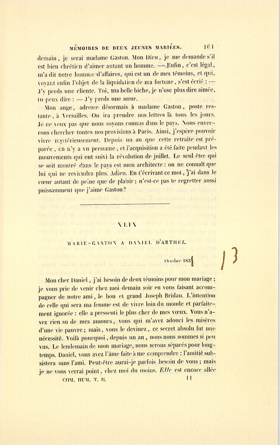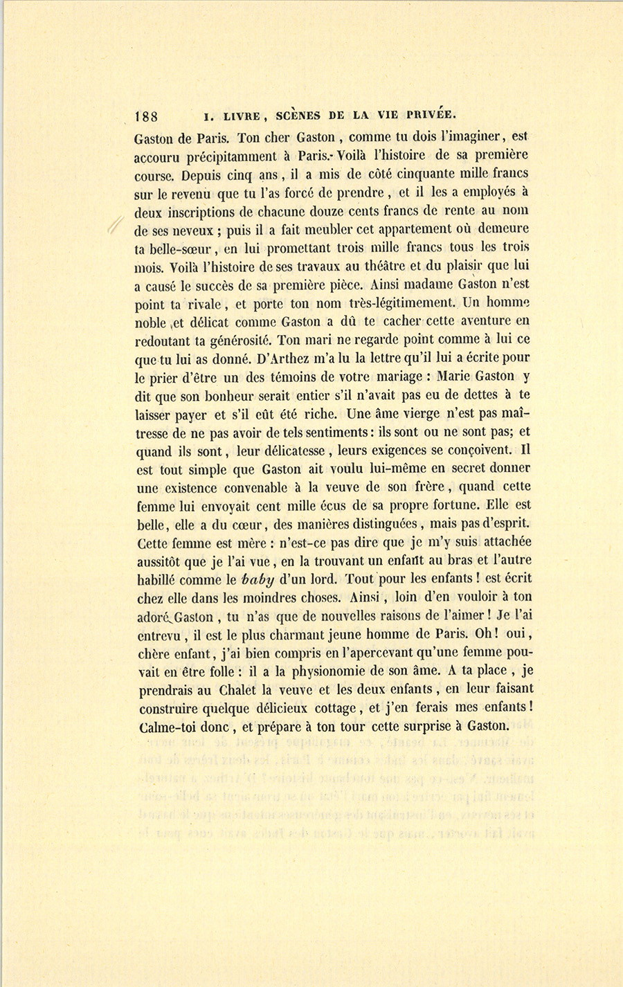 Mon ange, adresse désormais à madame Gaston, poste restante, à Versailles. On ira prendre nos lettres là tous les jours. Je ne veux pas que nous soyons connus dans le pays. Nous enverrons chercher toutes nos provisions à Paris. Ainsi, j’espère pouvoir vivre mystérieusement. Depuis un an que cette retraite est préparée, on n’y a vu personne, et l’acquisition a été faite pendant les mouvements qui ont suivi la révolution de juillet. Le seul être qui se soit montré dans le pays est mon architecte : on ne connaît que lui qui ne reviendra plus. Adieu. En t’écrivant ce mot, j’ai dans le cœur autant de peine que de plaisir ; n’est-ce pas te regretter aussi puissamment que j’aime Gaston ?