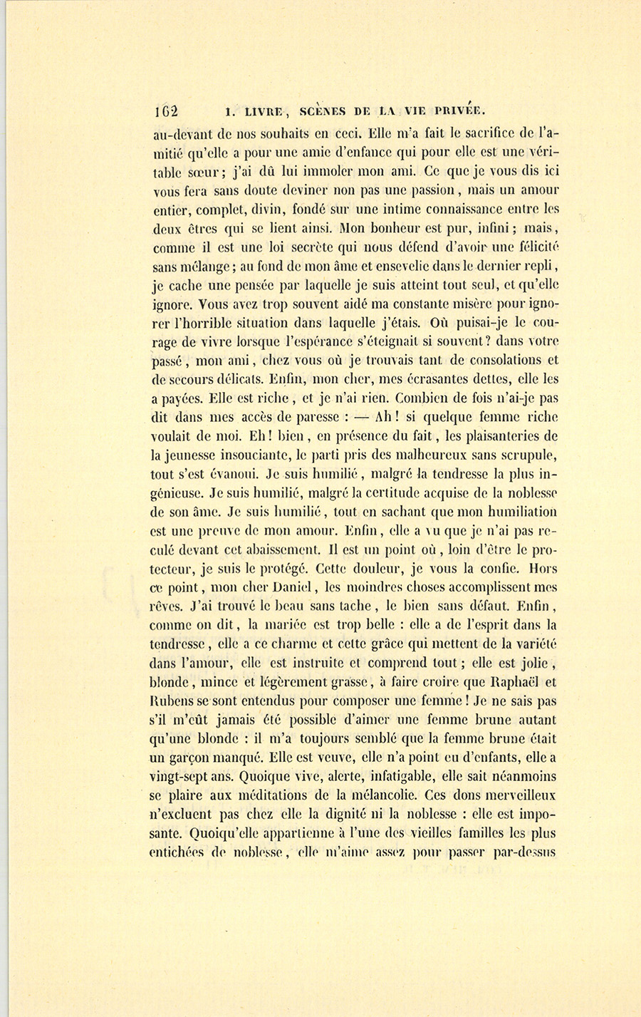Mon cher Daniel, j’ai besoin de deux témoins pour mon mariage ; je vous prie de venir chez moi demain soir en vous faisant accompagner de notre ami, le bon et grand Joseph Bridau. L’intention de celle qui sera ma femme est de vivre loin du monde et parfaitement ignorée : elle a pressenti le plus cher de mes vœux. Vous n’avez rien su de mes amours, vous qui m’avez adouci les misères d’une vie pauvre ; mais, vous le devinez, ce secret absolu fut une nécessité. Voilà pourquoi, depuis un an, nous nous sommes si peu vus. Le lendemain de mon mariage, nous serons séparés pour long-temps. Daniel, vous avez l’âme faite à me comprendre : l’amitié subsistera sans l’ami. Peut-être aurai-je parfois besoin de vous ; mais je ne vous verrai point, chez moi du moins. Elle est encore allée {p. 162} au-devant de nos souhaits en ceci. Elle m’a fait le sacrifice de l’amitié qu’elle a pour une amie d’enfance qui pour elle est une véritable sœur ; j’ai dû lui immoler mon ami. Ce que je vous dis ici vous fera sans doute deviner non pas une passion, mais un amour entier, complet, divin, fondé sur une intime connaissance entre les deux êtres qui se lient ainsi. Mon bonheur est pur, infini ; mais, comme il est une loi secrète qui nous défend d’avoir une félicité sans mélange, au fond de mon âme et ensevelie dans le dernier repli, je cache une pensée par laquelle je suis atteint tout seul, et qu’elle ignore. Vous avez trop souvent aidé ma constante misère pour ignorer l’horrible situation dans laquelle j’étais. Où puisai-je le courage de vivre lorsque l’espérance s’éteignait si souvent ? dans votre passé, mon ami, chez vous où je trouvais tant de consolations et de secours délicats. Enfin, mon cher, mes écrasantes dettes, elle les a payées. Elle est riche, et je n’ai rien. Combien de fois n’ai-je pas dit dans mes accès de paresse : – Ah ! si quelque femme riche voulait de moi. Eh ! bien, en présence du fait, les plaisanteries de la jeunesse insouciante, le parti pris des malheureux sans scrupule, tout s’est évanoui. Je suis humilié, malgré la tendresse la plus ingénieuse. Je suis humilié, malgré la certitude acquise de la noblesse de son âme. Je suis humilié, tout en sachant que mon humiliation est une preuve de mon amour. Enfin, elle a vu que je n’ai pas reculé devant cet abaissement. Il est un point où, loin d’être le protecteur, je suis le protégé. Cette douleur, je vous la confie. Hors ce point, mon cher Daniel, les moindres choses accomplissent mes rêves. J’ai trouvé le beau sans tache, le bien sans défaut. Enfin, comme on dit, la mariée est trop belle : elle a de l’esprit dans la tendresse, elle a ce charme et cette grâce qui mettent de la variété dans l’amour, elle est instruite et comprend tout ; elle est jolie, blonde, mince et légèrement grasse, à faire croire que Raphaël et Rubens se sont entendus pour composer une femme ! Je ne sais pas s’il m’eût jamais été possible d’aimer une femme brune autant qu’une blonde : il m’a toujours semblé que la femme brune était un garçon manqué. Elle est veuve, elle n’a point eu d’enfants, elle a vingt-sept ans. Quoique vive, alerte, infatigable, elle sait néanmoins se plaire aux méditations de la mélancolie. Ces dons merveilleux n’excluent pas chez elle la dignité ni la noblesse : elle est imposante. Quoiqu’elle appartienne à l’une des vieilles familles les plus entichées de noblesse, elle m’aime assez pour passer par-dessus {p. 163} les malheurs de ma naissance. Nos amours secrets ont duré long-temps ; nous nous sommes éprouvés l’un l’autre ; nous sommes également jaloux ; nos pensées sont bien les deux éclats de la même foudre. Nous aimons tous deux pour la première fois, et ce délicieux printemps a renfermé dans ses joies toutes les scènes que l’imagination a décorées de ses plus riantes, de ses plus douces, de ses plus profondes conceptions. Le sentiment nous a prodigué ses fleurs. Chacune de ces journées a été pleine, et, quand nous nous quittions, nous nous écrivions des poèmes. Je n’ai jamais eu la pensée de ternir cette brillante saison par un désir, quoique mon âme en fût sans cesse troublée. Elle était veuve et libre, elle a merveilleusement compris toutes les flatteries de cette constante retenue ; elle en a souvent été touchée aux larmes. Tu entreverras donc, mon cher Daniel, une créature vraiment supérieure. Il n’y a pas même eu de premier baiser de l’amour : nous nous sommes craints l’un l’autre.