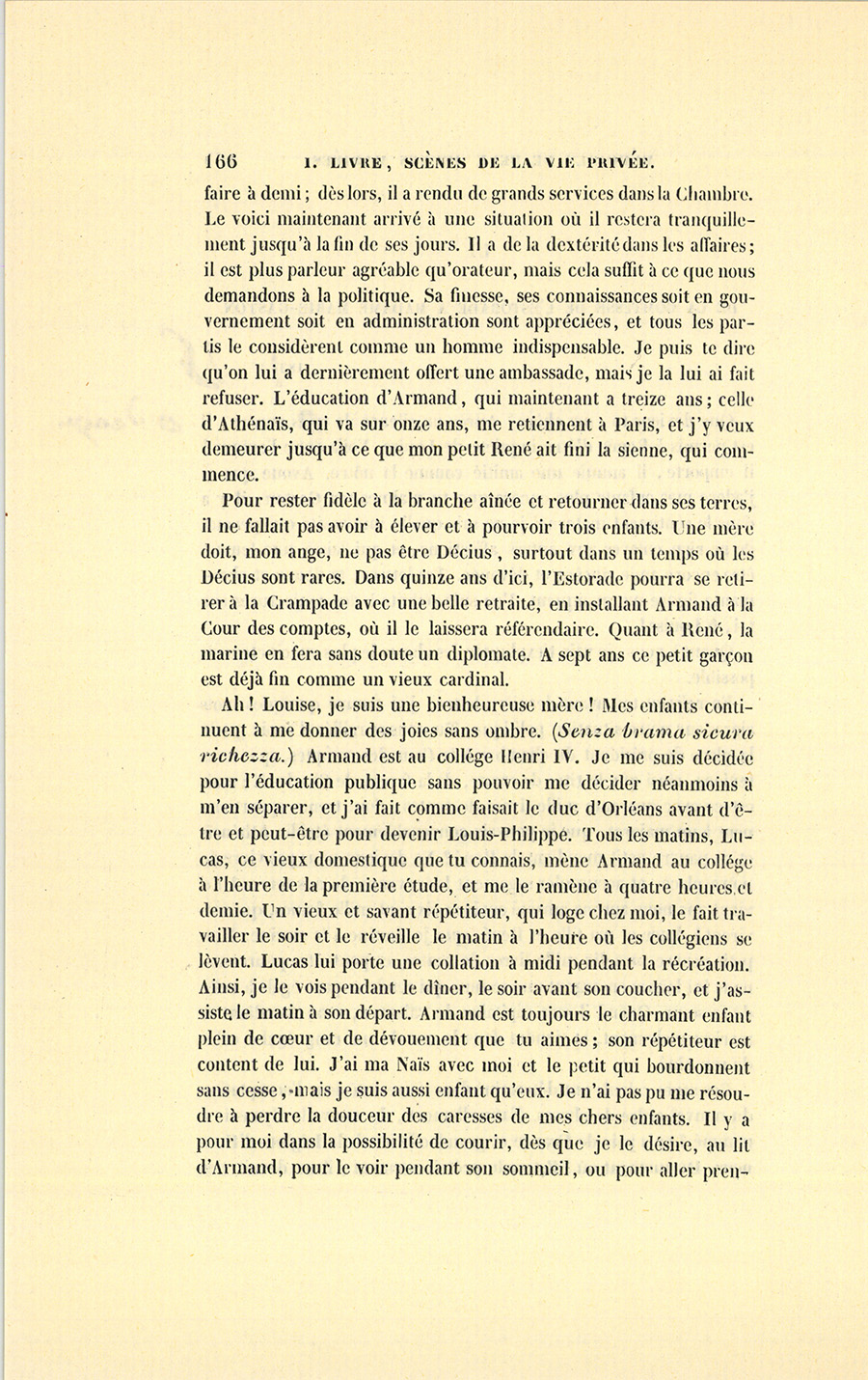 Ces sages calculs ont déterminé dans notre intérieur l’acceptation du nouvel ordre de choses. Naturellement, la nouvelle dynastie a nommé Louis pair de France et grand-officier de la Légion-d’Honneur. Du moment où l’Estorade prêtait serment, il ne devait rien {p. 166} faire à demi ; dès lors, il a rendu de grands services dans la Chambre. Le voici maintenant arrivé à une situation où il restera tranquillement jusqu’à la fin de ses jours. Il a de la dextérité dans les affaires ; il est plus parleur agréable qu’orateur, mais cela suffit à ce que nous demandons à la politique. Sa finesse, ses connaissances soit en gouvernement soit en administration sont appréciées, et tous les partis le considèrent comme un homme indispensable. Je puis te dire qu’on lui a dernièrement offert une ambassade, mais je la lui ai fait refuser. L’éducation d’Armand, qui maintenant a treize ans ; celle d’Athénaïs, qui va sur onze ans, me retiennent à Paris, et j’y veux demeurer jusqu’à ce que mon petit René ait fini la sienne, qui commence.