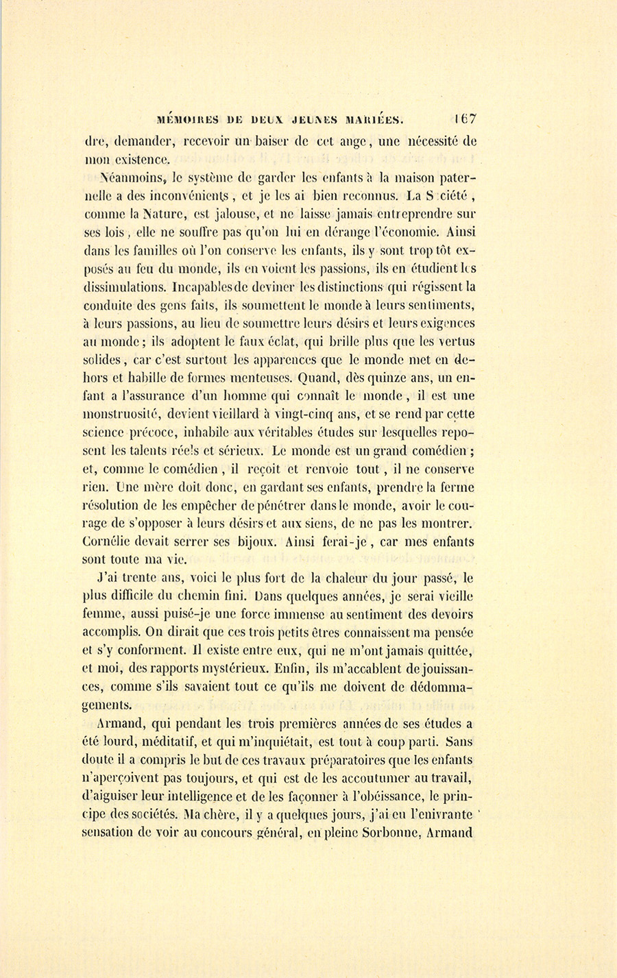Néanmoins, le système de garder les enfants à la maison paternelle a des inconvénients, et je les ai bien reconnus. La Société, comme la Nature, est jalouse, et ne laisse jamais entreprendre sur ses lois, elle ne souffre pas qu’on lui en dérange l’économie. Ainsi dans les familles où l’on conserve les enfants, ils y sont trop tôt exposés au feu du monde, ils en voient les passions, ils en étudient les dissimulations. Incapables de deviner les distinctions qui régissent la conduite des gens faits, ils soumettent le monde à leurs sentiments, à leurs passions, au lieu de soumettre leurs désirs et leurs exigences au monde ; ils adoptent le faux éclat, qui brille plus que les vertus solides, car c’est surtout les apparences que le monde met en dehors et habille de formes menteuses. Quand, dès quinze ans, un enfant a l’assurance d’un homme qui connaît le monde, il est une monstruosité, devient vieillard à vingt-cinq ans, et se rend par cette science précoce, inhabile aux véritables études sur lesquelles reposent les talents réels et sérieux. Le monde est un grand comédien ; et, comme le comédien, il reçoit et renvoie tout, il ne conserve rien. Une mère doit donc, en gardant ses enfants, prendre la ferme résolution de les empêcher de pénétrer dans le monde, avoir le courage de s’opposer à leurs désirs et aux siens, de ne pas les montrer. Cornélie devait serrer ses bijoux. Ainsi ferai-je, car mes enfants sont toute ma vie.