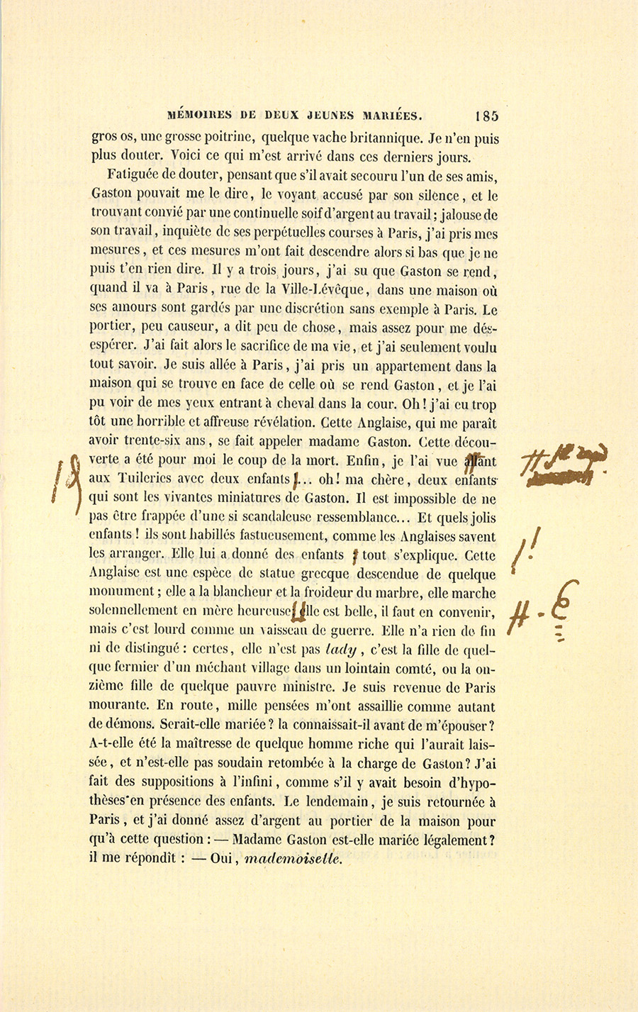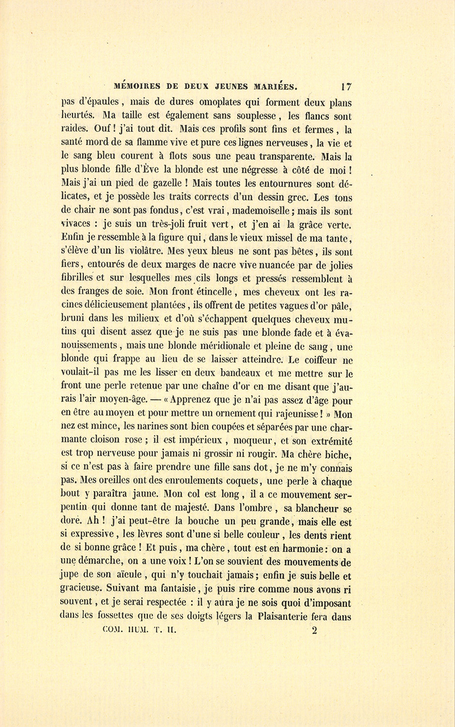 J’ai vu clair : je suis perdue. Oui, Renée, à trente ans, dans toute la gloire de la beauté, riche des ressources de mon esprit, parée des séductions de la toilette, toujours fraîche, élégante, je suis trahie, et pour qui ? pour une Anglaise qui a de gros pieds, de {p. 185} gros os, une grosse poitrine, quelque vache britannique. Je n’en puis plus douter. Voici ce qui m’est arrivé dans ces derniers jours.