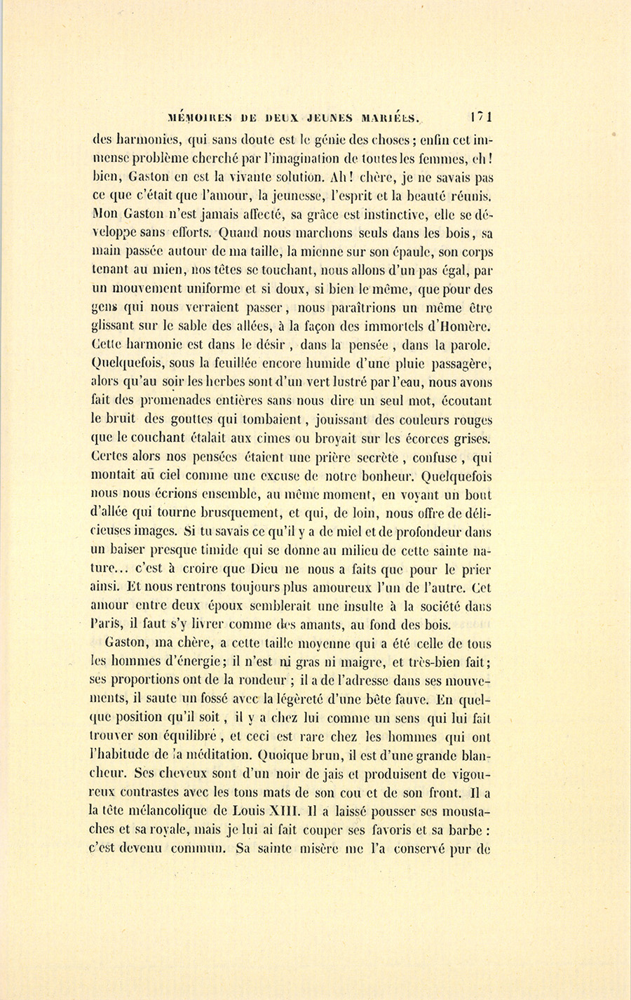 Gaston, ma chère, a cette taille moyenne qui a été celle de tous les hommes d’énergie ; il n’est ni gras ni maigre, et très-bien fait ; ses proportions ont de la rondeur ; il a de l’adresse dans ses mouvements, il saute un fossé avec la légèreté d’une bête fauve. En quelque position qu’il soit, il y a chez lui comme un sens qui lui fait trouver son équilibre, et ceci est rare chez les hommes qui ont l’habitude de la méditation. Quoique brun, il est d’une grande blancheur. Ses cheveux sont d’un noir de jais et produisent de vigoureux contrastes avec les tons mats de son cou et de son front. Il a la tête mélancolique de Louis XIII. Il a laissé pousser ses moustaches et sa royale, mais je lui ai fait couper ses favoris et sa barbe : c’est devenu commun. Sa sainte misère me l’a conservé pur de {p. 172} toutes ces souillures qui gâtent tant de jeunes gens. Il a des dents magnifiques, il est d’une santé de fer. Son regard bleu si vif, mais pour moi d’une douceur magnétique, s’allume et brille comme un éclair quand son âme est agitée. Semblable à tous les gens forts et d’une puissante intelligence, il est d’une égalité de caractère qui te surprendrait comme elle m’a surprise. J’ai entendu bien des femmes me confier les chagrins de leur intérieur ; mais ces variations de vouloir, ces inquiétudes des hommes mécontents d’eux-mêmes, qui ne veulent pas ou ne savent pas vieillir, qui ont je ne sais quels reproches éternels de leur folle jeunesse, et dont les veines charrient des poisons, dont le regard a toujours un fond de tristesse, qui se font taquins pour cacher leurs défiances, qui vous vendent une heure de tranquillité pour des matinées mauvaises, qui se vengent sur nous de ne pouvoir être aimables, et qui prennent nos beautés en une haine secrète, toutes ces douleurs la jeunesse ne les connaît point, elles sont l’attribut des mariages disproportionnés. Oh ! ma chère, ne marie Athénaïs qu’avec un jeune homme. Si tu savais combien je me repais de ce sourire constant que varie sans cesse un esprit fin et délicat, de ce sourire qui parle, qui dans le coin des lèvres renferme des pensées d’amour, de muets remerciements, et qui relie toujours les joies passées aux présentes ! Il n’y a jamais rien d’oublié entre nous. Nous avons fait des moindres choses de la nature des complices de nos félicités : tout est vivant, tout nous parle de nous dans ces bois ravissants. Un vieux chêne moussu, près de la maison du garde sur la route, nous dit que nous nous sommes assis fatigués sous son ombre, et que Gaston m’a expliqué là les mousses qui étaient à nos pieds, m’a fait leur histoire, et que de ces mousses nous avons monté, de science en science, jusqu’aux fins du monde. Nos deux esprits ont quelque chose de si fraternel, que je crois que c’est deux éditions du même ouvrage. Tu le vois, je suis devenue littéraire. Nous avons tous deux l’habitude ou le don de voir chaque chose dans son étendue, d’y tout apercevoir, et la preuve que nous nous donnons constamment à nous-mêmes de cette pureté du sens intérieur, est un plaisir toujours nouveau. Nous en sommes arrivés à regarder cette entente de l’esprit comme un témoignage d’amour ; et si jamais elle nous manquait, ce serait pour nous ce qu’est une infidélité pour les autres ménages.