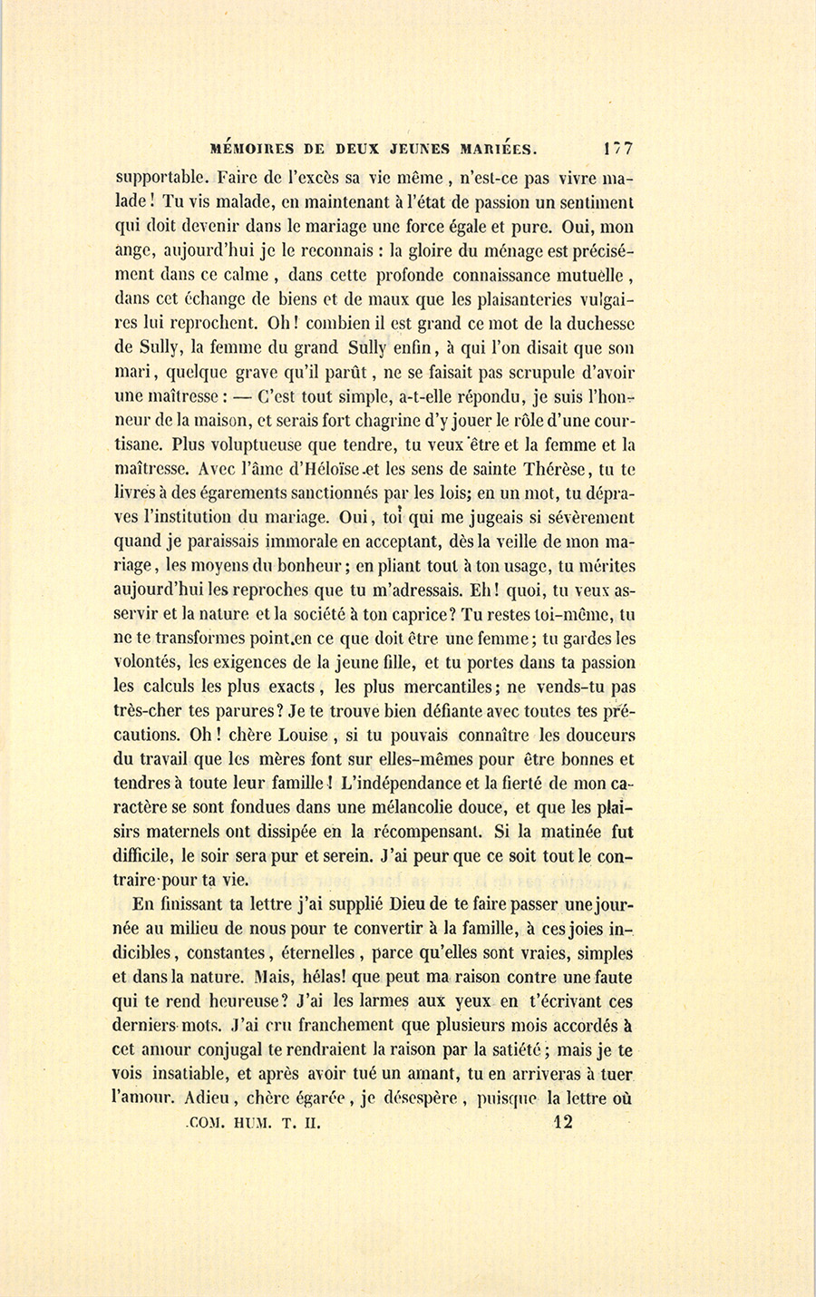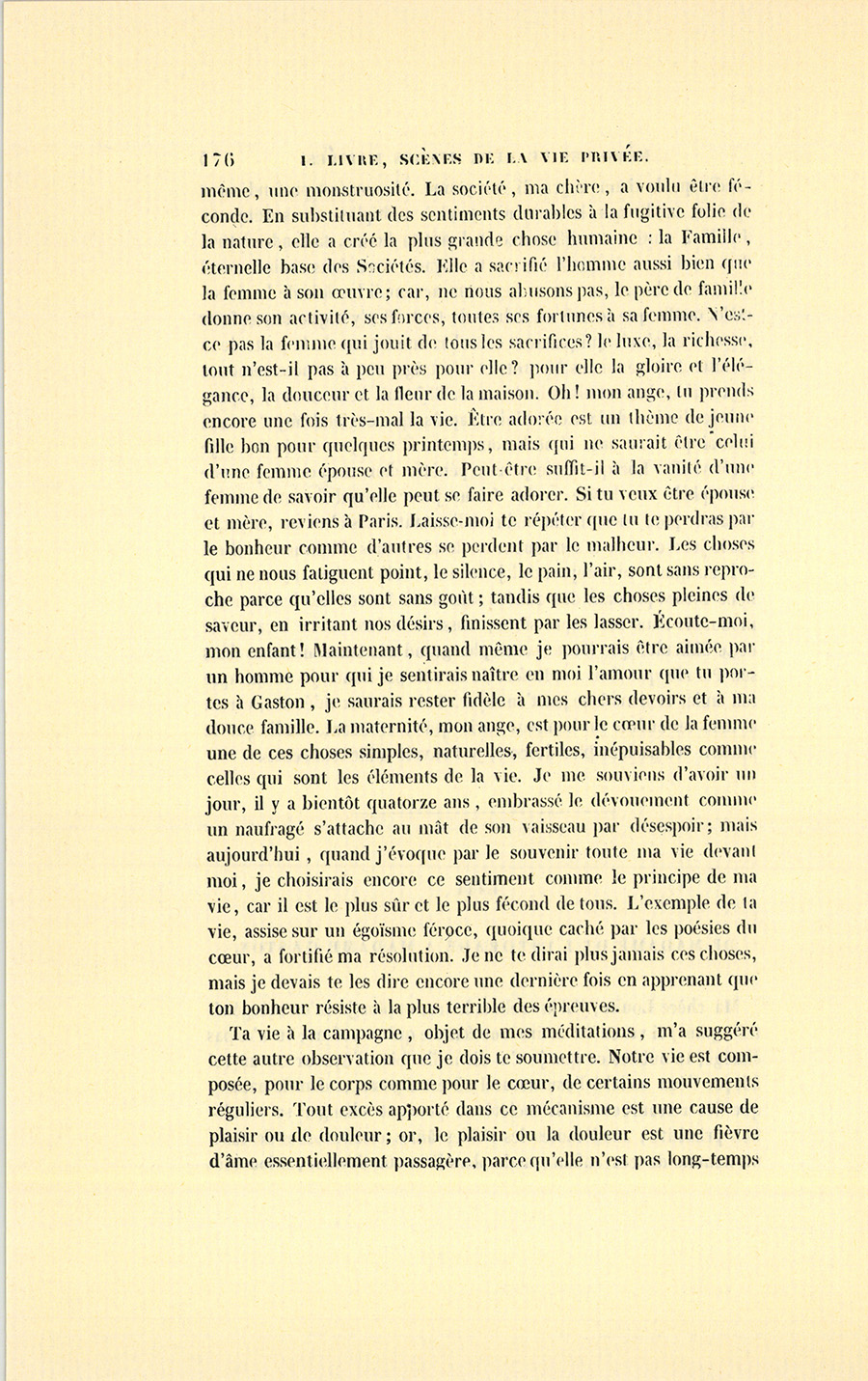 En finissant ta lettre j’ai supplié Dieu de te faire passer une journée au milieu de nous pour te convertir à la famille, à ces joies indicibles, constantes, éternelles, parce qu’elles sont vraies, simples et dans la nature. Mais, hélas ! que peut ma raison contre une faute qui te rend heureuse ? J’ai les larmes aux yeux en t’écrivant ces derniers mots. J’ai cru franchement que plusieurs mois accordés à cet amour conjugal te rendraient la raison par la satiété ; mais je te vois insatiable, et après avoir tué un amant, tu en arriveras à tuer l’amour. Adieu, chère égarée, je désespère, puisque la lettre où {p. 178} j’espérais te rendre à la vie sociale par la peinture de mon bonheur n’a servi qu’à la glorification de ton égoïsme. Oui, il n’y a que toi dans ton amour, et tu aimes Gaston bien plus pour toi que pour lui-même.
