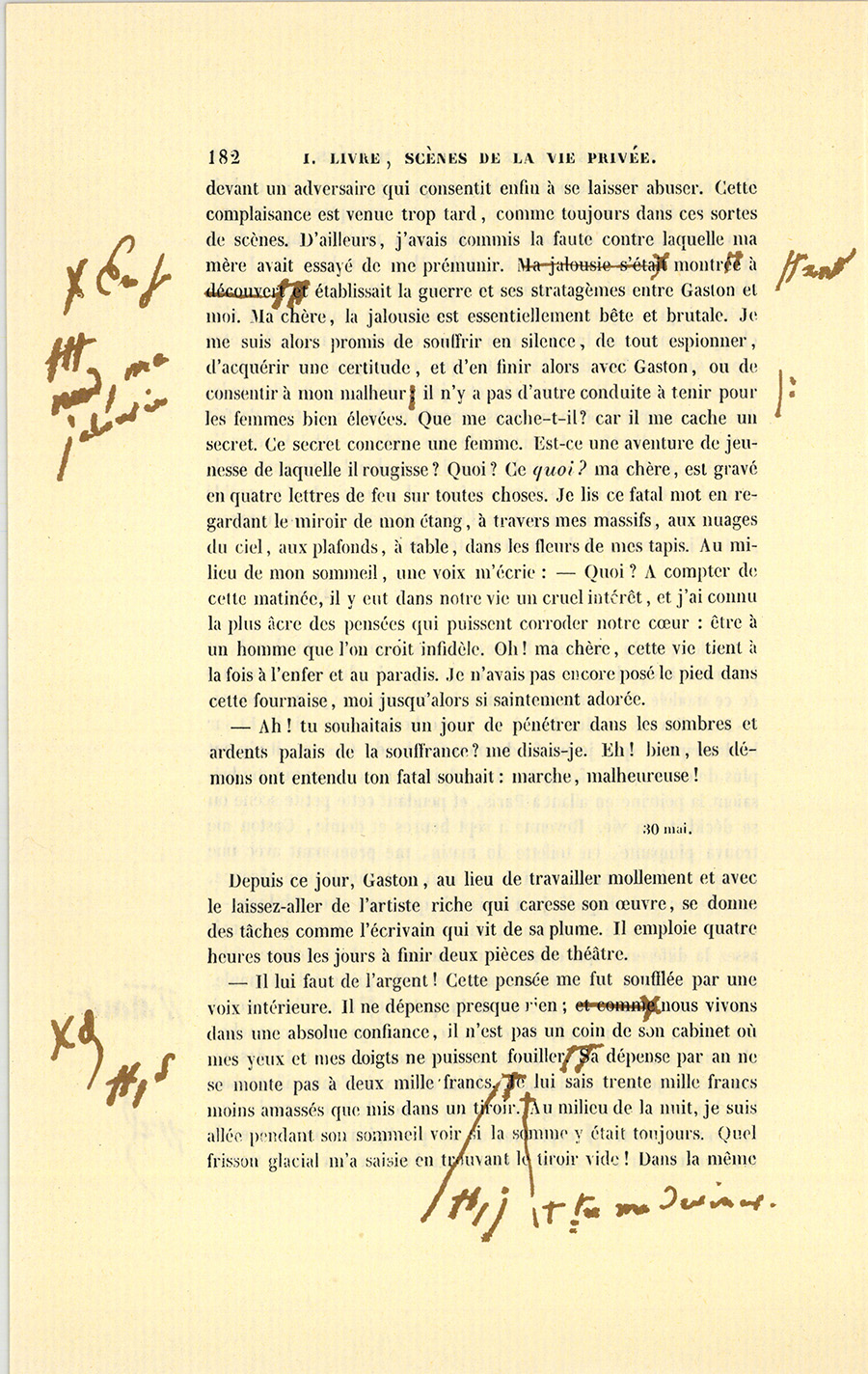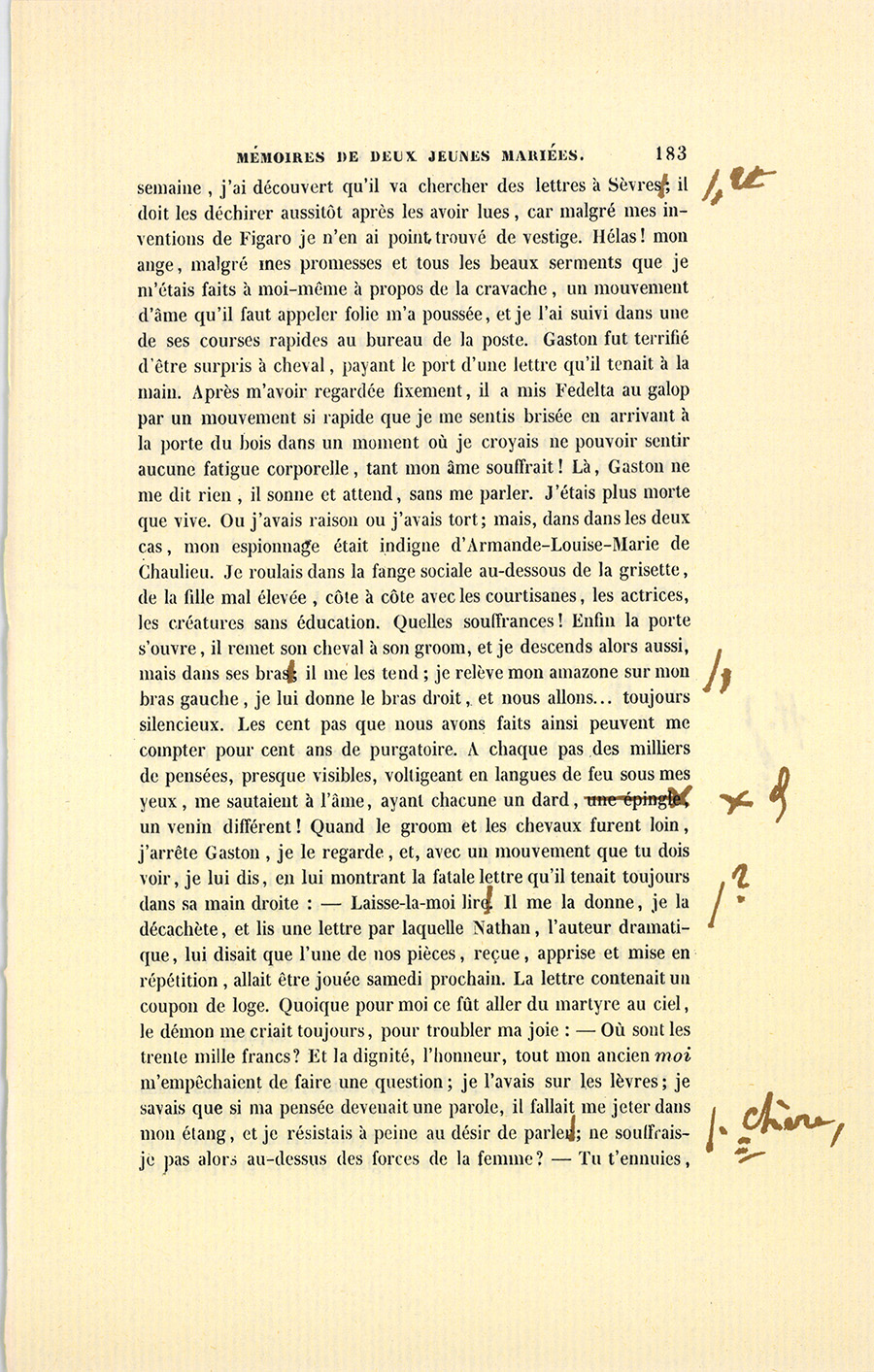 – Il lui faut de l’argent ! Cette pensée me fut soufflée par une voix intérieure. Il ne dépense presque rien ; nous vivons dans une absolue confiance, il n’est pas un coin de son cabinet où mes yeux et mes doigts ne puissent fouiller, sa dépense par an ne se monte pas à deux mille francs, je lui sais trente mille francs moins amassés que mis dans un tiroir. Tu me devines. Au milieu de la nuit, je suis allée pendant son sommeil voir si la somme y était toujours. Quel frisson glacial m’a saisie en trouvant le tiroir vide ! Dans la même {p. 183} semaine, j’ai découvert qu’il va chercher des lettres à Sèvres, et il doit les déchirer aussitôt après les avoir lues, car malgré mes inventions de Figaro je n’en ai point trouvé de vestige. Hélas ! mon ange, malgré mes promesses et tous les beaux serments que je m’étais faits à moi-même à propos de la cravache, un mouvement d’âme qu’il faut appeler folie m’a poussée, et je l’ai suivi dans une de ses courses rapides au bureau de la poste. Gaston fut terrifié d’être surpris à cheval, payant le port d’une lettre qu’il tenait à la main. Après m’avoir regardée fixement, il a mis Fedelta au galop par un mouvement si rapide que je me sentis brisée en arrivant à la porte du bois dans un moment où je croyais ne pouvoir sentir aucune fatigue corporelle, tant mon âme souffrait ! Là, Gaston ne me dit rien, il sonne et attend, sans me parler. J’étais plus morte que vive. Ou j’avais raison ou j’avais tort ; mais, dans10 les deux cas, mon espionnage était indigne d’Armande-Louise-Marie de Chaulieu. Je roulais dans la fange sociale au-dessous de la grisette, de la fille mal élevée, côte à côte avec les courtisanes, les actrices, les créatures sans éducation. Quelles souffrances ! Enfin la porte s’ouvre, il remet son cheval à son groom, et je descends alors aussi, mais dans ses bras, il me les tend ; je relève mon amazone sur mon bras gauche, je lui donne le bras droit, et nous allons… toujours silencieux. Les cent pas que nous avons faits ainsi peuvent me compter pour cent ans de purgatoire. À chaque pas des milliers de pensées, presque visibles, voltigeant en langues de feu sous mes yeux, me sautaient à l’âme, ayant chacune un dard, un venin différent ! Quand le groom et les chevaux furent loin, j’arrête Gaston, je le regarde, et, avec un mouvement que tu dois voir, je lui dis, en lui montrant la fatale lettre qu’il tenait toujours dans sa main droite : – Laisse-la-moi lire ? Il me la donne, je la décachète, et lis une lettre par laquelle Nathan, l’auteur dramatique, lui disait que l’une de nos pièces, reçue, apprise et mise en répétition, allait être jouée samedi prochain. La lettre contenait un coupon de loge. Quoique pour moi ce fût aller du martyre au ciel, le démon me criait toujours, pour troubler ma joie : – Où sont les trente mille francs ? Et la dignité, l’honneur, tout mon ancien moi m’empêchaient de faire une question ; je l’avais sur les lèvres ; je savais que si ma pensée devenait une parole, il fallait me jeter dans mon étang, et je résistais à peine au désir de parler. Chère, ne souffrais-je pas alors au-dessus des forces de la femme ? – Tu t’ennuies, {p. 184} mon pauvre Gaston, lui dis-je en lui rendant la lettre. Si tu veux, nous reviendrons à Paris. – À Paris, pourquoi ? dit-il. J’ai voulu savoir si j’avais du talent, et goûter au punch du succès !