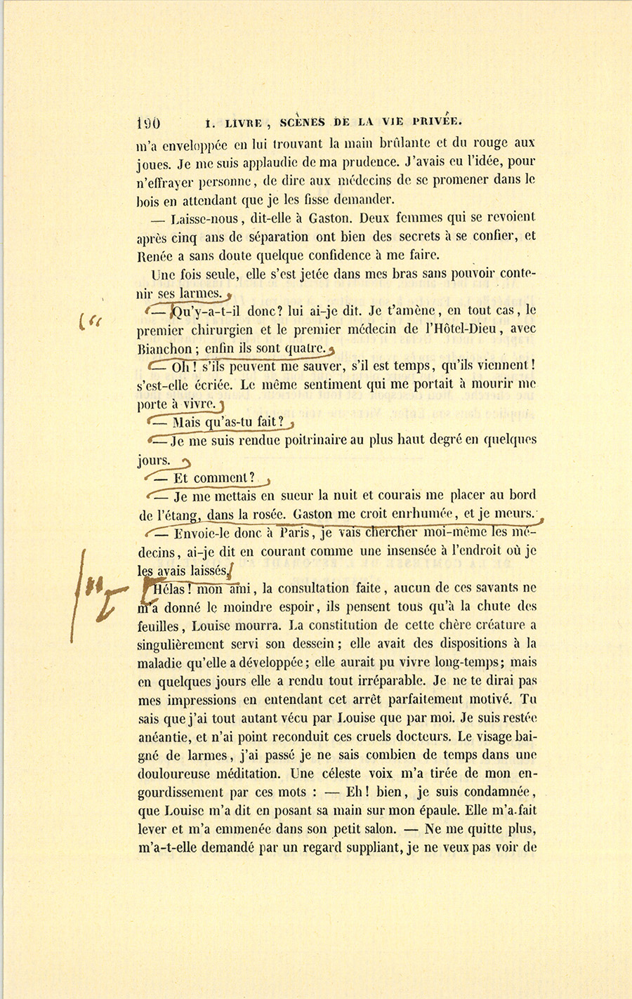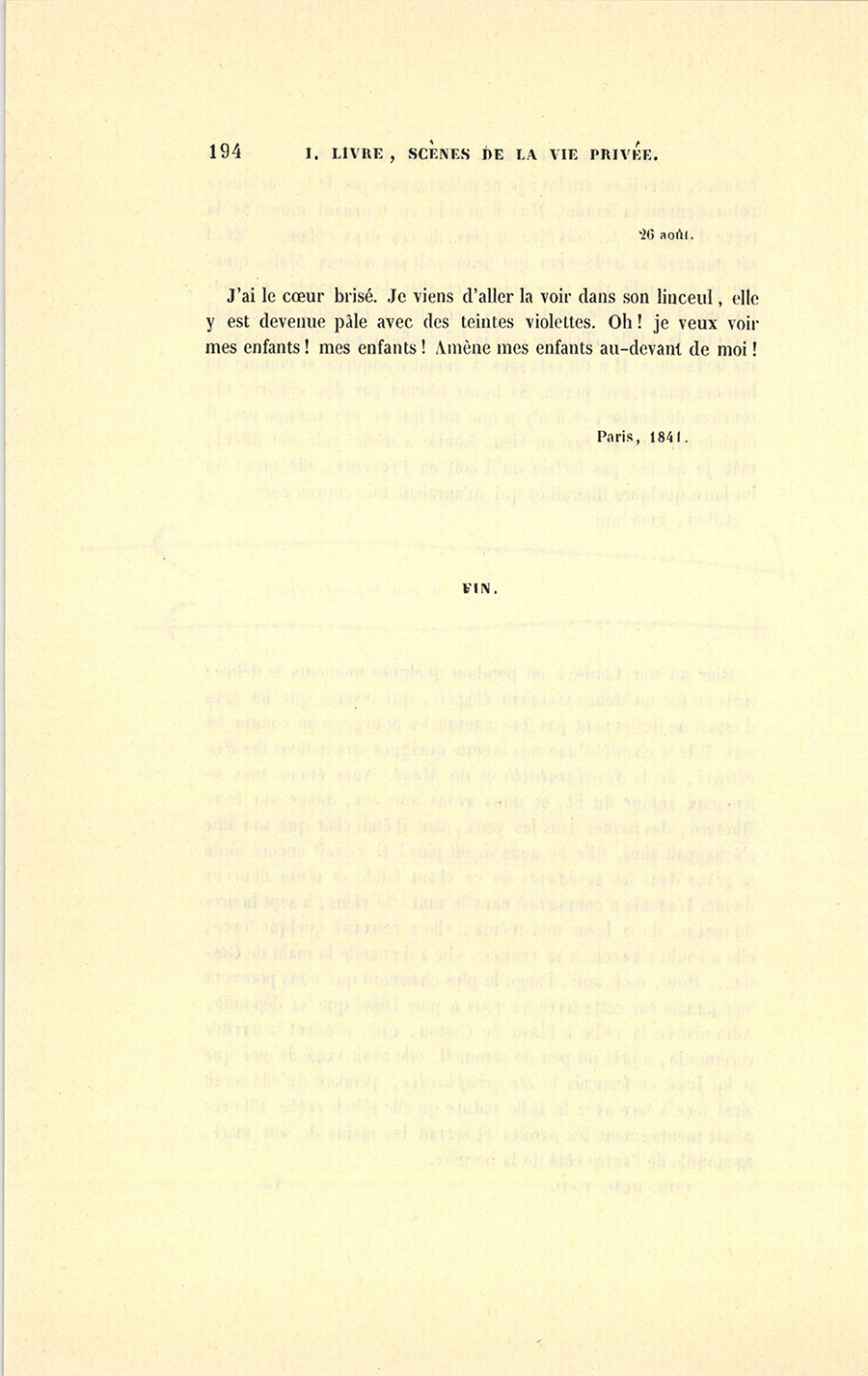Une fois seule, elle s’est jetée dans mes bras sans pouvoir contenir ses larmes. – « Qu’y a-t-il donc ? lui ai-je dit. Je t’amène, en tout cas, le premier chirurgien et le premier médecin de l’Hôtel-Dieu, avec Bianchon ; enfin ils sont quatre. – Oh ! s’ils peuvent me sauver, s’il est temps, qu’ils viennent ! s’est-elle écriée. Le même sentiment qui me portait à mourir me porte à vivre. – Mais qu’as-tu fait ? – Je me suis rendue poitrinaire au plus haut degré en quelques jours. – Et comment ? – Je me mettais en sueur la nuit et courais me placer au bord de l’étang, dans la rosée. Gaston me croit enrhumée, et je meurs. – Envoie-le donc à Paris, je vais chercher moi-même les médecins, ai-je dit en courant comme une insensée à l’endroit où je les avais laissés. »