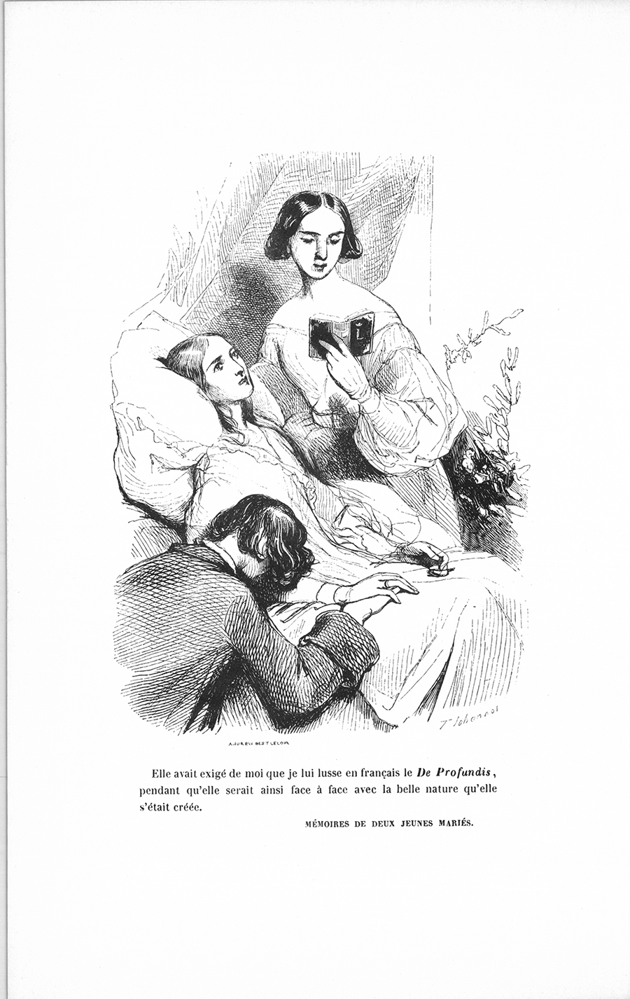 Hier au soir Louise a eu pendant quelques moments le délire ; mais ce fut un délire vraiment élégant, qui prouve que les gens d’esprit ne deviennent pas fous comme les bourgeois ou comme les sots. Elle a chanté d’une voix éteinte quelques airs italiens des Puritani, de la Sonnambula et de Mosé. Nous étions tous silencieux autour du lit, et nous avons tous eu, même son frère Rhétoré, des larmes dans les yeux, tant il était clair que son âme s’échappait ainsi. Elle ne nous voyait plus ! Il y avait encore toute sa grâce dans les agréments de ce chant faible et d’une douceur divine. L’agonie a commencé dans la nuit. Je viens, à sept heures du matin, de la lever moi-même ; elle a retrouvé quelque force, elle a voulu s’asseoir à sa croisée, elle a demandé la main de Gaston… Puis, mon ami, l’ange le plus charmant que nous pourrons voir jamais sur cette terre ne nous a plus laissé que sa dépouille. Administrée la veille à l’insu de Gaston, qui, pendant la terrible cérémonie, a pris un peu de sommeil, elle avait exigé de moi que je lui lusse en français le De profundis, pendant qu’elle serait ainsi face à face avec la belle nature qu’elle s’était créée. [ill.] Elle répétait mentalement les paroles et serrait les mains de son mari, agenouillé de l’autre côté de la bergère.