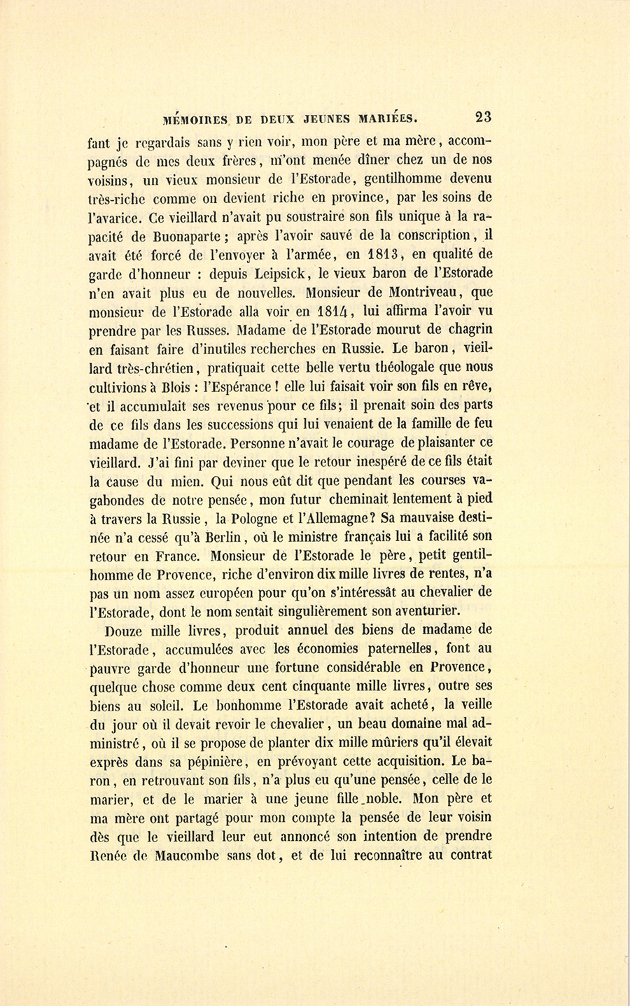 Douze mille livres, produit annuel des biens de madame de l’Estorade, accumulées avec les économies paternelles, font au pauvre garde d’honneur une fortune considérable en Provence, quelque chose comme deux cent cinquante mille livres, outre ses biens au soleil. Le bonhomme l’Estorade avait acheté, la veille du jour où il devait revoir le chevalier, un beau domaine mal administré, où il se propose de planter dix mille mûriers qu’il élevait exprès dans sa pépinière, en prévoyant cette acquisition. Le baron, en retrouvant son fils, n’a plus eu qu’une pensée, celle de le marier, et de le marier à une jeune fille noble. Mon père et ma mère ont partagé pour mon compte la pensée de leur voisin dès que le vieillard leur eut annoncé son intention de prendre Renée de Maucombe sans dot, et de lui reconnaître au contrat {p. 24} toute la somme qui doit revenir à ladite Renée dans leurs successions. Dès sa majorité, mon frère cadet, Jean de Maucombe, a reconnu avoir reçu de ses parents un avancement d’hoirie équivalant au tiers de l’héritage. Voilà comment les familles nobles de la Provence éludent l’infâme Code civil du sieur de Buonaparte, qui fera mettre au couvent autant de filles nobles qu’il en a fait marier. La noblesse française est, d’après le peu que j’ai entendu dire à ce sujet, très-divisée sur ces graves matières.