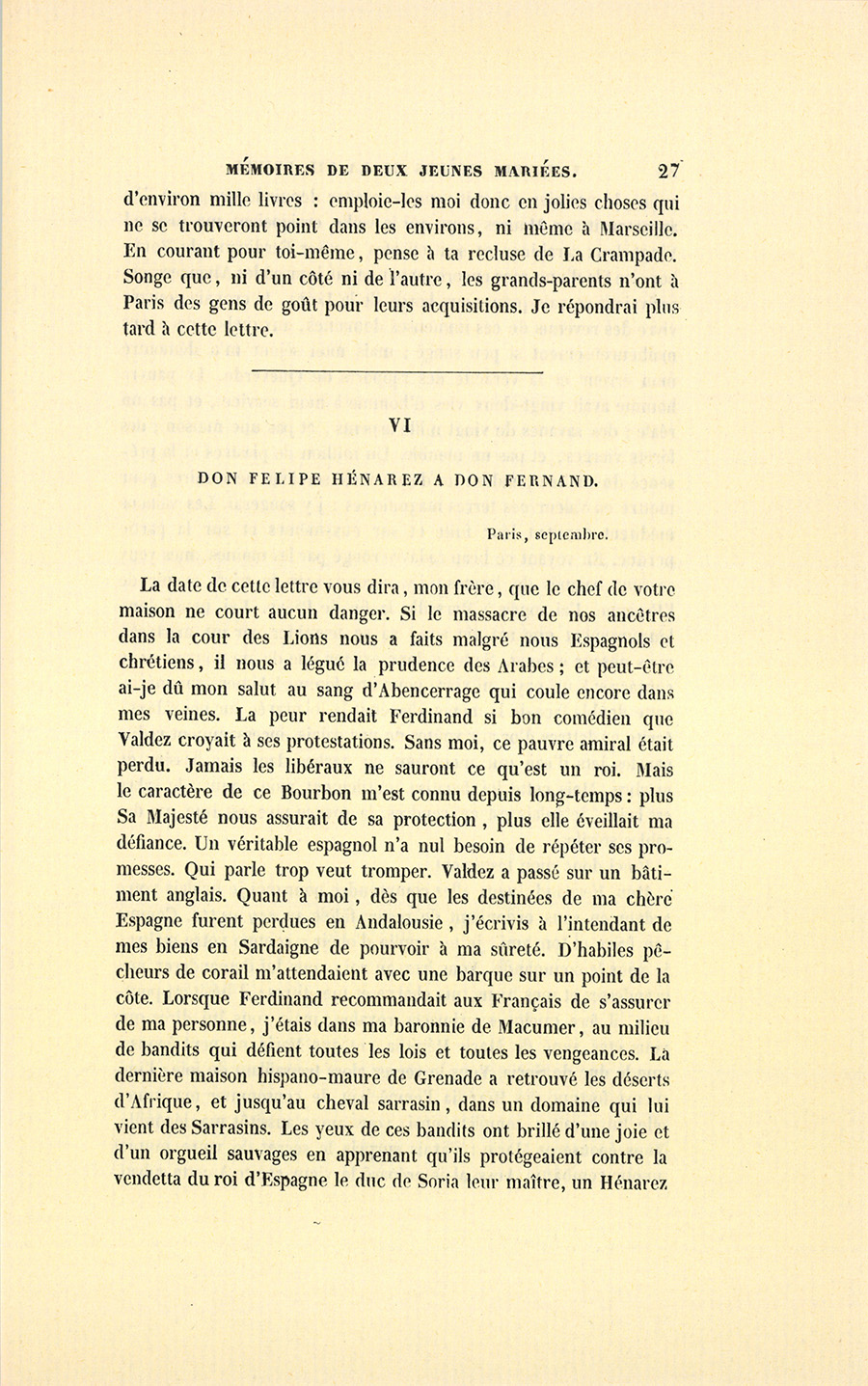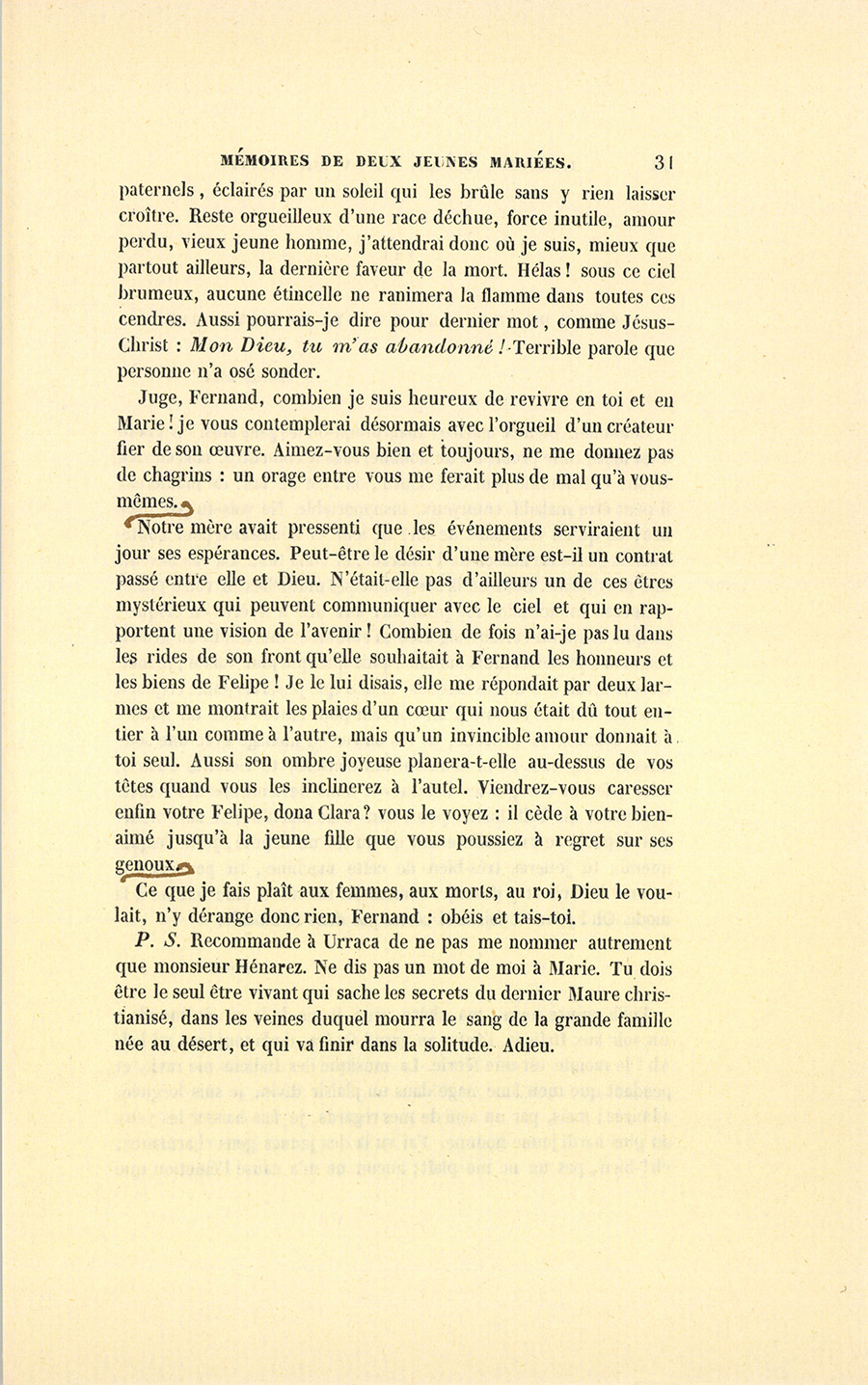P. S. Recommande à Urraca de ne pas me nommer autrement que monsieur Hénarez. Ne dis pas un mot de moi à Marie. Tu dois être le seul être vivant qui sache les secrets du dernier Maure christianisé, dans les veines duquel mourra le sang de la grande famille née au désert, et qui va finir dans la solitude. Adieu.
