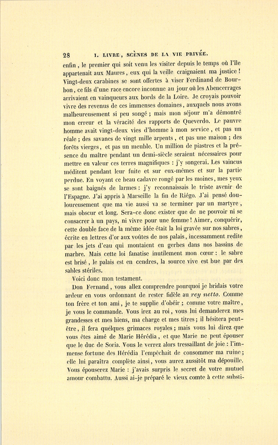 Don Fernand, vous allez comprendre pourquoi je bridais votre ardeur en vous ordonnant de rester fidèle au rey netto. Comme ton frère et ton ami, je te supplie d’obéir ; comme votre maître, je vous le commande. Vous irez au roi, vous lui demanderez mes grandesses et mes biens, ma charge et mes titres ; il hésitera peut-être, il fera quelques grimaces royales ; mais vous lui direz que vous êtes aimé de Marie Hérédia, et que Marie ne peut épouser que le duc de Soria. Vous le verrez alors tressaillant de joie : l’immense fortune des Hérédia l’empêchait de consommer ma ruine ; elle lui paraîtra complète ainsi, vous aurez aussitôt ma dépouille. Vous épouserez Marie : j’avais surpris le secret de votre mutuel amour combattu. Aussi ai-je préparé le vieux comte à cette {p. 29} substitution. Marie et moi nous obéissions aux convenances et aux vœux de nos pères. Vous êtes beau comme un enfant de l’amour, je suis laid comme un grand d’Espagne ; vous êtes aimé, je suis l’objet d’une répugnance inavouée ; vous aurez bientôt vaincu le peu de résistance que mon malheur inspirera peut-être à cette noble Espagnole. Duc de Soria, votre prédécesseur ne veut ni vous coûter un regret ni vous priver d’un maravédi. Comme les joyaux de Marie peuvent réparer le vide que les diamants de ma mère feront dans votre maison, vous m’enverrez ces diamants, qui suffiront pour assurer l’indépendance de ma vie, par ma nourrice, la vieille Urraca, la seule personne que je veuille conserver des gens de ma maison : elle seule sait bien préparer mon chocolat.
