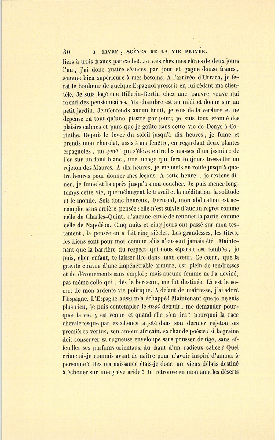 En arrivant ici, je n’avais pas dix quadruples. Un homme d’État n’est-il pas bien petit quand, au milieu des catastrophes qu’il n’a pas empêchées, il montre une prévoyance égoïste ? Aux Maures vaincus, un cheval et le désert ; aux chrétiens trompés dans leurs espérances, le couvent et quelques pièces d’or. Cependant, ma résignation n’est encore que de la lassitude. Je ne suis point assez près du monastère pour ne pas songer à vivre. Ozalga m’avait, à tout hasard, donné des lettres de recommandation parmi lesquelles il s’en trouvait une pour un libraire qui est à nos compatriotes ce que Galignani est ici aux Anglais. Cet homme m’a procuré huit {p. 30} écoliers à trois francs par cachet. Je vais chez mes élèves de deux jours l’un, j’ai donc quatre séances par jour et gagne douze francs, somme bien supérieure à mes besoins. À l’arrivée d’Urraca, je ferai le bonheur de quelque Espagnol proscrit en lui cédant ma clientèle. Je suis logé rue Hillerin-Bertin chez une pauvre veuve qui prend des pensionnaires. Ma chambre est au midi et donne sur un petit jardin. Je n’entends aucun bruit, je vois de la verdure et ne dépense en tout qu’une piastre par jour ; je suis tout étonné des plaisirs calmes et purs que je goûte dans cette vie de Denys à Corinthe. Depuis le lever du soleil jusqu’à dix heures, je fume et prends mon chocolat, assis à ma fenêtre, en regardant deux plantes espagnoles, un genêt qui s’élève entre les masses d’un jasmin : de l’or sur un fond blanc, une image qui fera toujours tressaillir un rejeton des Maures. À dix heures, je me mets en route jusqu’à quatre heures pour donner mes leçons. À cette heure, je reviens dîner, je fume et lis après jusqu’à mon coucher. Je puis mener long-temps cette vie, que mélangent le travail et la méditation, la solitude et le monde. Sois donc heureux, Fernand, mon abdication est accomplie sans arrière-pensée ; elle n’est suivie d’aucun regret comme celle de Charles-Quint, d’aucune envie de renouer la partie comme celle de Napoléon. Cinq nuits et cinq jours ont passé sur mon testament, la pensée en a fait cinq siècles. Les grandesses, les titres, les biens sont pour moi comme s’ils n’eussent jamais été. Maintenant que la barrière du respect qui nous séparait est tombée, je puis, cher enfant, te laisser lire dans mon cœur. Ce cœur, que la gravité couvre d’une impénétrable armure, est plein de tendresses et de dévouements sans emploi ; mais aucune femme ne l’a deviné, pas même celle qui, dès le berceau, me fut destinée. Là est le secret de mon ardente vie politique. À défaut de maîtresse, j’ai adoré l’Espagne. L’Espagne aussi m’a échappé ! Maintenant que je ne suis plus rien, je puis contempler le moi détruit, me demander pourquoi la vie y est venue et quand elle s’en ira ? pourquoi la race chevaleresque par excellence a jeté dans son dernier rejeton ses premières vertus, son amour africain, sa chaude poésie ? si la graine doit conserver sa rugueuse enveloppe sans pousser de tige, sans effeuiller ses parfums orientaux du haut d’un radieux calice ? Quel crime ai-je commis avant de naître pour n’avoir inspiré d’amour à personne ? Dès ma naissance étais-je donc un vieux débris destiné à échouer sur une grève aride ? Je retrouve en mon âme les déserts {p. 31} paternels, éclairés par un soleil qui les brûle sans y rien laisser croître. Reste orgueilleux d’une race déchue, force inutile, amour perdu, vieux jeune homme, j’attendrai donc où je suis, mieux que partout ailleurs, la dernière faveur de la mort. Hélas ! sous ce ciel brumeux, aucune étincelle ne ranimera la flamme dans toutes ces cendres. Aussi pourrais-je dire pour dernier mot, comme Jésus-Christ : Mon Dieu, tu m’as abandonné ! Terrible parole que personne n’a osé sonder.