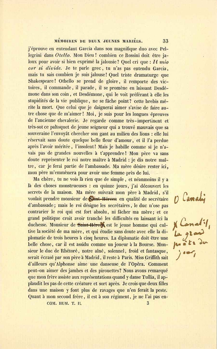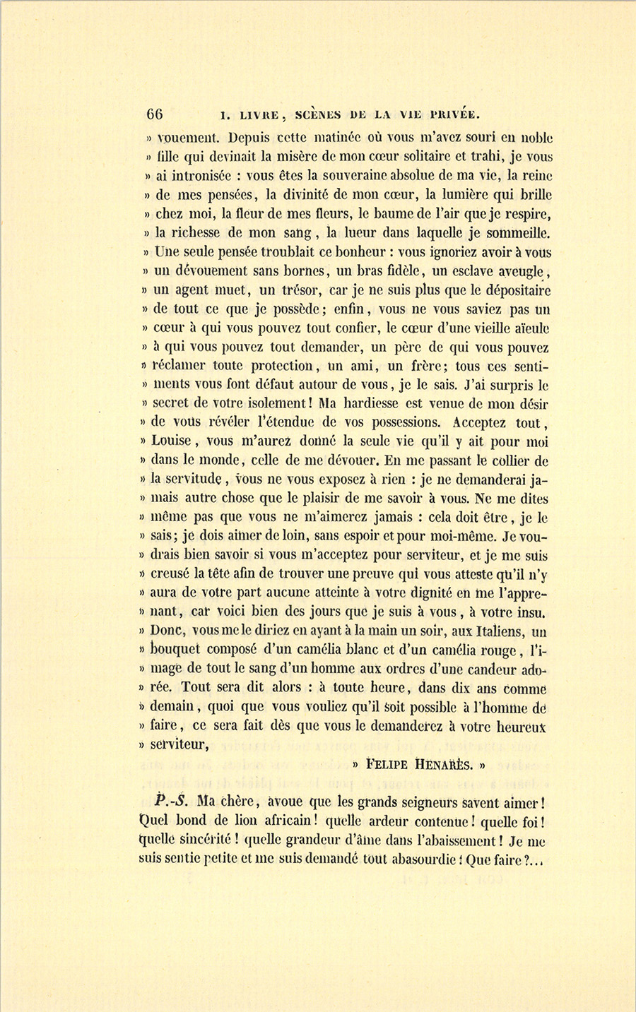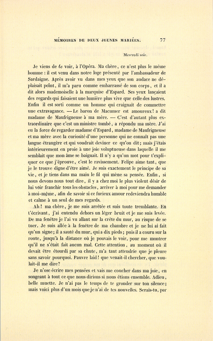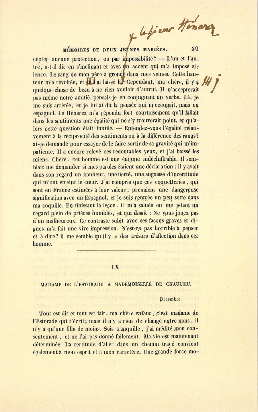 Hier, aux Italiens, je me suis sentie regardée, mes yeux ont été magiquement attirés par deux yeux de feu qui brillaient comme deux escarboucles dans un coin obscur de l’orchestre. [ill.] Hénarez n’a pas détaché ses yeux de dessus moi. Le monstre a cherché la seule place d’où il pouvait me voir, et il y est. Je ne sais pas ce qu’il est en politique ; mais il a le génie de l’amour.