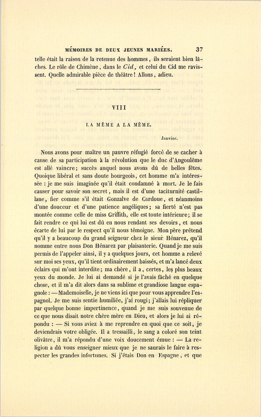 Le soir, je suis allée au bal chez la duchesse de Lenoncourt, le prince de Talleyrand s’y trouvait. Je lui ai fait demander, par monsieur de Vandenesse, un charmant jeune homme, s’il y avait parmi ses hôtes en 1809, à sa terre, un Hénarez. – Hénarez est le nom maure de la famille de Soria, qui sont, disent-ils, des Abencerrages convertis au christianisme. Le vieux duc et ses deux fils accompagnèrent le roi. L’aîné, le duc de Soria d’aujourd’hui, vient d’être dépouillé de tous ses biens, honneurs et grandesses par {p. 49} le roi Ferdinand, qui venge une vieille inimitié. Le duc a fait une faute immense en acceptant le ministère constitutionnel avec Valdez. Heureusement, il s’est sauvé de Cadix avant l’entrée de monseigneur le duc d’Angoulême, qui, malgré sa bonne volonté, ne l’aurait pas préservé de la colère du roi.