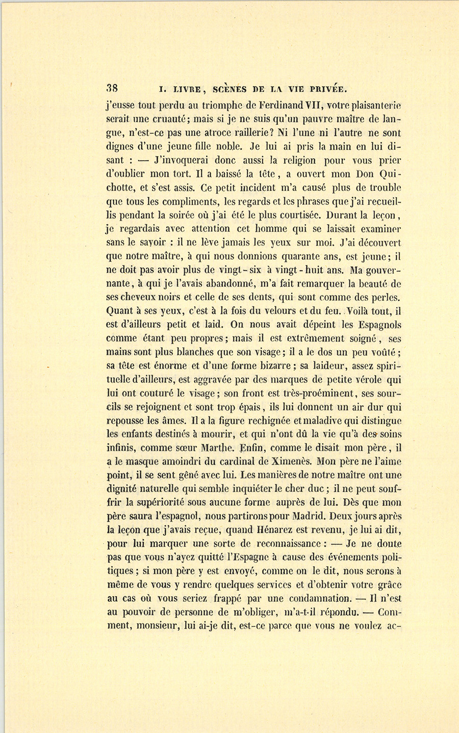 Nous avons pour maître un pauvre réfugié forcé de se cacher à cause de sa participation à la révolution que le duc d’Angoulême est allé vaincre ; succès auquel nous avons dû de belles fêtes. Quoique libéral et sans doute bourgeois, cet homme m’a intéressée : je me suis imaginée qu’il était condamné à mort. Je le fais causer pour savoir son secret, mais il est d’une taciturnité castillane, fier comme s’il était Gonzalve de Cordoue, et néanmoins d’une douceur et d’une patience angéliques ; sa fierté n’est pas montée comme celle de miss Griffith, elle est toute intérieure ; il se fait rendre ce qui lui est dû en nous rendant ses devoirs, et nous écarte de lui par le respect qu’il nous témoigne. Mon père prétend qu’il y a beaucoup du grand seigneur chez le sieur Hénarez, qu’il nomme entre nous Don Hénarez par plaisanterie. Quand je me suis permis de l’appeler ainsi, il y a quelques jours, cet homme a relevé sur moi ses yeux, qu’il tient ordinairement baissés, et m’a lancé deux éclairs qui m’ont interdite ; ma chère, il a, certes, les plus beaux yeux du monde. Je lui ai demandé si je l’avais fâché en quelque chose, et il m’a dit alors dans sa sublime et grandiose langue espagnole : – Mademoiselle, je ne viens ici que pour vous apprendre l’espagnol. Je me suis sentie humiliée, j’ai rougi ; j’allais lui répliquer par quelque bonne impertinence, quand je me suis souvenue de ce que nous disait notre chère mère en Dieu, et alors je lui ai répondu : [ill.] – Si vous aviez à me reprendre en quoi que ce soit, je deviendrais votre obligée. Il a tressailli, le sang a coloré son teint olivâtre, il m’a répondu d’une voix doucement émue : – La religion a dû vous enseigner mieux que je ne saurais le faire à respecter les grandes infortunes. Si j’étais Don en Espagne, et que {p. 38} j’eusse tout perdu au triomphe de Ferdinand VII, votre plaisanterie serait une cruauté ; mais si je ne suis qu’un pauvre maître de langue, n’est-ce pas une atroce raillerie ? Ni l’une ni l’autre ne sont dignes d’une jeune fille noble. Je lui ai pris la main en lui disant : – J’invoquerai donc aussi la religion pour vous prier d’oublier mon tort. Il a baissé la tête, a ouvert mon Don Quichotte, et s’est assis. Ce petit incident m’a causé plus de trouble que tous les compliments, les regards et les phrases que j’ai recueillis pendant la soirée où j’ai été le plus courtisée. Durant la leçon, je regardais avec attention cet homme qui se laissait examiner sans le savoir : il ne lève jamais les yeux sur moi. J’ai découvert que notre maître, à qui nous donnions quarante ans, est jeune ; il ne doit pas avoir plus de vingt-six à vingt-huit ans. Ma gouvernante, à qui je l’avais abandonné, m’a fait remarquer la beauté de ses cheveux noirs et celle de ses dents, qui sont comme des perles. Quant à ses yeux, c’est à la fois du velours et du feu. Voilà tout, il est d’ailleurs petit et laid. On nous avait dépeint les Espagnols comme étant peu propres ; mais il est extrêmement soigné, ses mains sont plus blanches que son visage ; il a le dos un peu voûté ; sa tête est énorme et d’une forme bizarre ; sa laideur, assez spirituelle d’ailleurs, est aggravée par des marques de petite vérole qui lui ont couturé le visage ; son front est très-proéminent, ses sourcils se rejoignent et sont trop épais, ils lui donnent un air dur qui repousse les âmes. Il a la figure rechignée et maladive qui distingue les enfants destinés à mourir, et qui n’ont dû la vie qu’à des soins infinis, comme sœur Marthe. Enfin, comme le disait mon père, il a le masque amoindri du cardinal de Ximenès. Mon père ne l’aime point, il se sent gêné avec lui. Les manières de notre maître ont une dignité naturelle qui semble inquiéter le cher duc ; il ne peut souffrir la supériorité sous aucune forme auprès de lui. Dès que mon père saura l’espagnol, nous partirons pour Madrid. Deux jours après la leçon que j’avais reçue, quand Hénarez est revenu, je lui ai dit, pour lui marquer une sorte de reconnaissance : – Je ne doute pas que vous n’ayez quitté l’Espagne à cause des événements politiques ; si mon père y est envoyé, comme on le dit, nous serons à même de vous y rendre quelques services et d’obtenir votre grâce au cas où vous seriez frappé par une condamnation. – Il n’est au pouvoir de personne de m’obliger, m’a-t-il répondu. – Comment, monsieur, lui ai-je dit, est-ce parce que vous ne voulez {p. 39} accepter aucune protection, ou par impossibilité ? – L’un et l’autre, a-t-il dit en s’inclinant et avec un accent qui m’a imposé silence. Le sang de mon père a grondé dans mes veines. Cette hauteur m’a révoltée, et j’ai laissé là le sieur Hénarez. Cependant, ma chère, il y a quelque chose de beau à ne rien vouloir d’autrui. Il n’accepterait pas même notre amitié, pensais-je en conjuguant un verbe. Là, je me suis arrêtée, et je lui ai dit la pensée qui m’occupait, mais en espagnol. Le Hénarez m’a répondu fort courtoisement qu’il fallait dans les sentiments une égalité qui ne s’y trouverait point, et qu’alors cette question était inutile. – Entendez-vous l’égalité relativement à la réciprocité des sentiments ou à la différence des rangs ? ai-je demandé pour essayer de le faire sortir de sa gravité qui m’impatiente. Il a encore relevé ses redoutables yeux, et j’ai baissé les miens. Chère, cet homme est une énigme indéchiffrable. Il semblait me demander si mes paroles étaient une déclaration : il y avait dans son regard un bonheur, une fierté, une angoisse d’incertitude qui m’ont étreint le cœur. J’ai compris que ces coquetteries, qui sont en France estimées à leur valeur, prenaient une dangereuse signification avec un Espagnol, et je suis rentrée un peu sotte dans m