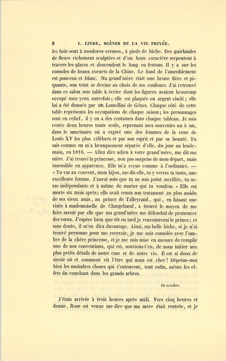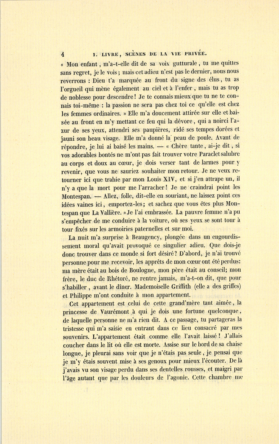 Cet appartement est celui de cette grand’mère tant aimée, la princesse de Vaurémont à qui je dois une fortune quelconque, de laquelle personne ne m’a rien dit. À ce passage, tu partageras la tristesse qui m’a saisie en entrant dans ce lieu consacré par mes souvenirs. L’appartement était comme elle l’avait laissé ! J’allais coucher dans le lit où elle est morte. Assise sur le bord de sa chaise longue, je pleurai sans voir que je n’étais pas seule, je pensai que je m’y étais souvent mise à ses genoux pour mieux l’écouter. De là j’avais vu son visage perdu dans ses dentelles rousses, et maigri par l’âge autant que par les douleurs de l’agonie. Cette chambre me {p. 5} semblait encore chaude de la chaleur qu’elle y entretenait. Comment se fait-il que mademoiselle Armande-Louise-Marie de Chaulieu soit obligée, comme une paysanne, de se coucher dans le lit de sa mère, presque le jour de sa mort ? car il me semblait que la princesse, morte en 1817, avait expiré la veille. Cette chambre m’offrait des choses qui ne devaient pas s’y trouver, et qui prouvaient combien les gens occupés des affaires du royaume sont insouciants des leurs, et combien, une fois morte, on a peu pensé à cette noble femme, qui sera l’une des grandes figures féminines du dix-huitième siècle. Philippe a quasiment compris d’où venaient mes larmes. Il m’a dit que par son testament la princesse m’avait légué ses meubles. Mon père laissait d’ailleurs les grands appartements dans l’état où les avait mis la Révolution. Je me suis levée alors, Philippe m’a ouvert la porte du petit salon qui donne sur l’appartement de réception, et je l’ai retrouvé dans le délabrement que je connaissais : les dessus de portes qui contenaient des tableaux précieux montrent leurs trumeaux vides, les marbres sont cassés, les glaces ont été enlevées. Autrefois, j’avais peur de monter le grand escalier et de traverser la vaste solitude de ces hautes salles, j’allais chez la princesse par un petit escalier qui descend sous la voûte du grand et qui mène à la porte dérobée de son cabinet de toilette.