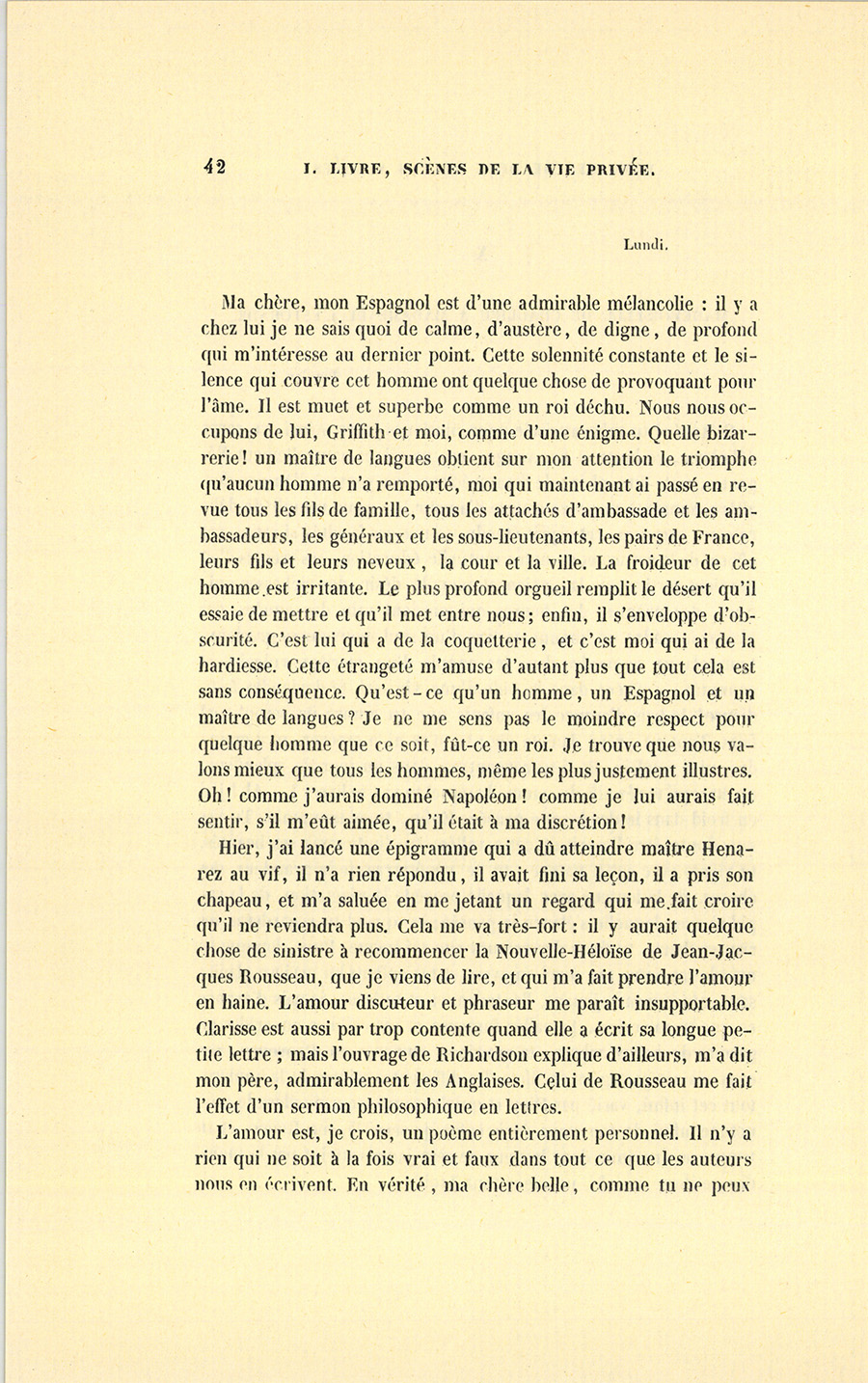 Ma chère, mon Espagnol est d’une admirable mélancolie : il y a chez lui je ne sais quoi de calme, d’austère, de digne, de profond qui m’intéresse au dernier point. Cette solennité constante et le silence qui couvre cet homme ont quelque chose de provoquant pour l’âme. Il est muet et superbe comme un roi déchu. Nous nous occupons de lui, Griffith et moi, comme d’une énigme. Quelle bizarrerie ! un maître de langues obtient sur mon attention le triomphe qu’aucun homme n’a remporté, moi qui maintenant ai passé en revue tous les fils de famille, tous les attachés d’ambassade et les ambassadeurs, les généraux et les sous-lieutenants, les pairs de France, leurs fils et leurs neveux, la cour et la ville. La froideur de cet homme est irritante. Le plus profond orgueil remplit le désert qu’il essaie de mettre et qu’il met entre nous ; enfin, il s’enveloppe d’obscurité. C’est lui qui a de la coquetterie, et c’est moi qui ai de la hardiesse. Cette étrangeté m’amuse d’autant plus que tout cela est sans conséquence. Qu’est-ce qu’un homme, un Espagnol et un maître de langues ? Je ne me sens pas le moindre respect pour quelque homme que ce soit, fût-ce un roi. Je trouve que nous valons mieux que tous les hommes, même les plus justement illustres. Oh ! comme j’aurais dominé Napoléon ! comme je lui aurais fait sentir, s’il m’eût aimée, qu’il était à ma discrétion !