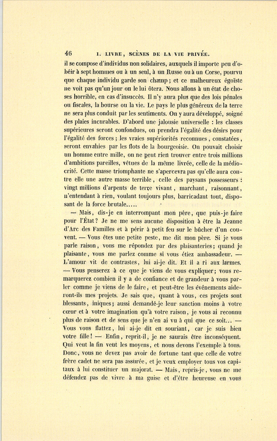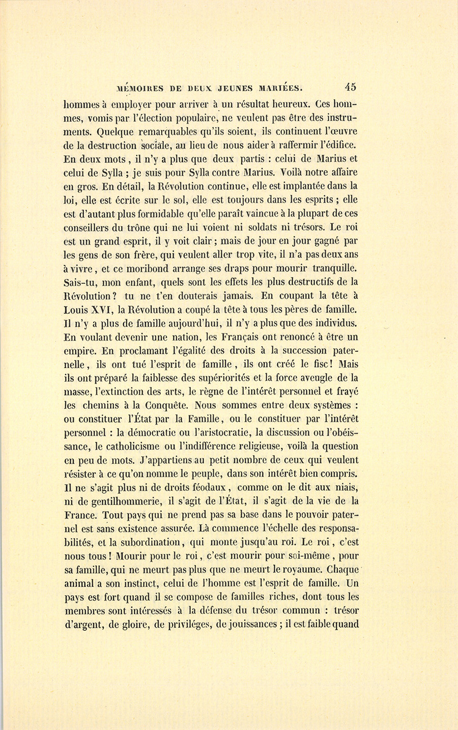 À cet exorde, ma biche, je suis devenue réellement sérieuse, et je lui ai dit : – Parlez, mon père. Or, voici ce que l’homme d’État a prononcé : – Mon enfant, la France est dans une situation précaire qui n’est connue que du roi et de quelques esprits élevés ; mais le roi est une tête sans bras ; puis les grands esprits qui sont dans le secret du danger n’ont aucune autorité sur les {p. 45} hommes à employer pour arriver à un résultat heureux. Ces hommes, vomis par l’élection populaire, ne veulent pas être des instruments. Quelque remarquables qu’ils soient, ils continuent l’œuvre de la destruction sociale, au lieu de nous aider à raffermir l’édifice. En deux mots, il n’y a plus que deux partis : celui de Marius et celui de Sylla ; je suis pour Sylla contre Marius. Voilà notre affaire en gros. En détail, la Révolution continue, elle est implantée dans la loi, elle est écrite sur le sol, elle est toujours dans les esprits ; elle est d’autant plus formidable qu’elle paraît vaincue à la plupart de ces conseillers du trône qui ne lui voient ni soldats ni trésors. Le roi est un grand esprit, il y voit clair ; mais de jour en jour gagné par les gens de son frère, qui veulent aller trop vite, il n’a pas deux ans à vivre, et ce moribond arrange ses draps pour mourir tranquille. Sais-tu, mon enfant, quels sont les effets les plus destructifs de la Révolution ? tu ne t’en douterais jamais. En coupant la tête à Louis XVI, la Révolution a coupé la tête à tous les pères de famille. Il n’y a plus de famille aujourd’hui, il n’y a plus que des individus. En voulant devenir une nation, les Français ont renoncé à être un empire. En proclamant l’égalité des droits à la succession paternelle, ils ont tué l’esprit de famille, ils ont créé le fisc ! Mais ils ont préparé la faiblesse des supériorités et la force aveugle de la masse, l’extinction des arts, le règne de l’intérêt personnel et frayé les chemins à la Conquête. Nous sommes entre deux systèmes : ou constituer l’État par la Famille, ou le constituer par l’intérêt personnel : la démocratie ou l’aristocratie, la discussion ou l’obéissance, le catholicisme ou l’indifférence religieuse, voilà la question en peu de mots. J’appartiens au petit nombre de ceux qui veulent résister à ce qu’on nomme le peuple, dans son intérêt bien compris. Il ne s’agit plus ni de droits féodaux, comme on le dit aux niais, ni de gentilhommerie, il s’agit de l’État, il s’agit de la vie de la France. Tout pays qui ne prend pas sa base dans le pouvoir paternel est sans existence assurée. Là commence l’échelle des responsabilités, et la subordination, qui monte jusqu’au roi. Le roi, c’est nous tous ! Mourir pour le roi, c’est mourir pour soi-même, pour sa famille, qui ne meurt pas plus que ne meurt le royaume. Chaque animal a son instinct, celui de l’homme est l’esprit de famille. Un pays est fort quand il se compose de familles riches, dont tous les membres sont intéressés à la défense du trésor commun : trésor d’argent, de gloire, de priviléges, de jouissances ; il est faible quand {p. 46} il se compose d’individus non solidaires, auxquels il importe peu d’obéir à sept hommes ou à un seul, à un Russe ou à un Corse, pourvu que chaque individu garde son champ ; et ce malheureux égoïste ne voit pas qu’un jour on le lui ôtera. Nous allons à un état de choses horrible, en cas d’insuccès. Il n’y aura plus que des lois pénales ou fiscales, la bourse ou la vie. Le pays le plus généreux de la terre ne sera plus conduit par les sentiments. On y aura développé, soigné des plaies incurables. D’abord une jalousie universelle : les classes supérieures seront confondues, on prendra l’égalité des désirs pour l’égalité des forces ; les vraies supériorités reconnues, constatées, seront envahies par les flots de la bourgeoisie. On pouvait choisir un homme entre mille, on ne peut rien trouver entre trois millions d’ambitions pareilles, vêtues de la même livrée, celle de la médiocrité. Cette masse triomphante ne s’apercevra pas qu’elle aura contre elle une autre masse terrible, celle des paysans possesseurs : vingt millions d’arpents de terre vivant, marchant, raisonnant, n’entendant à rien, voulant toujours plus, barricadant tout, disposant de la force brutale…
