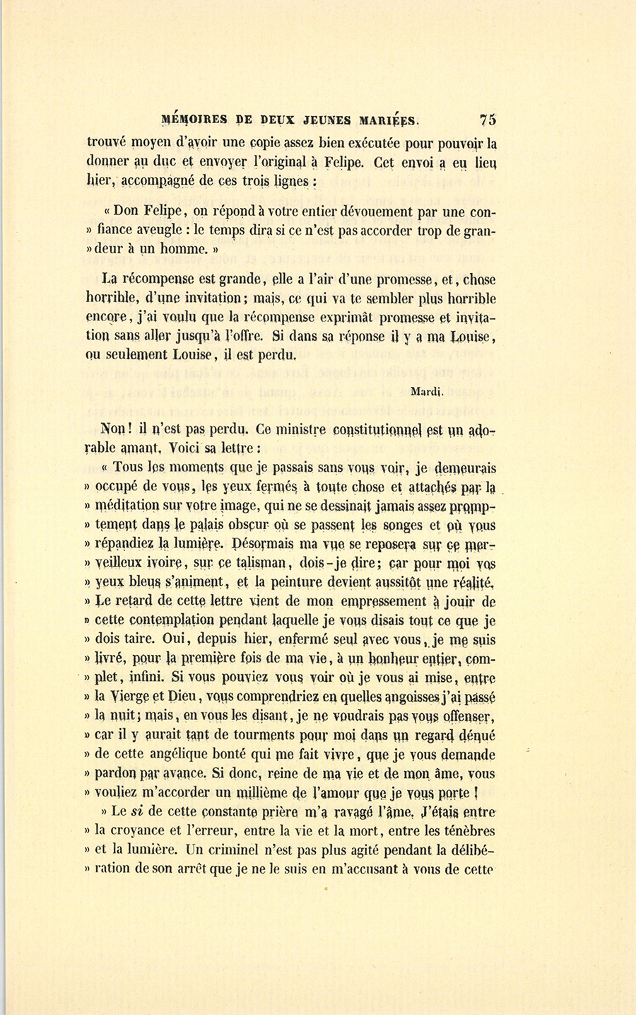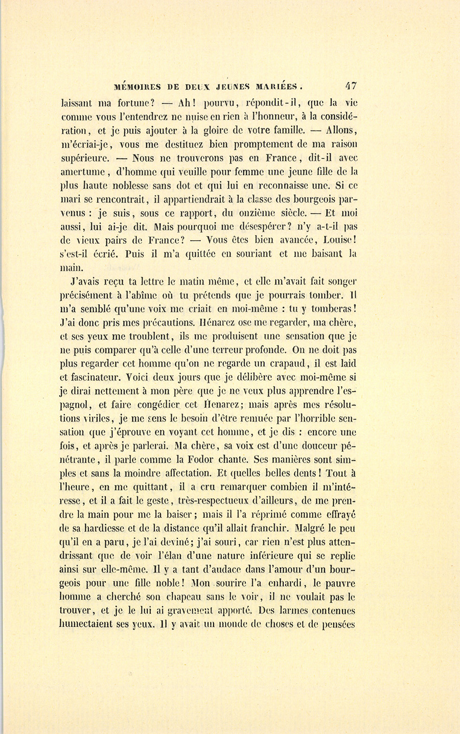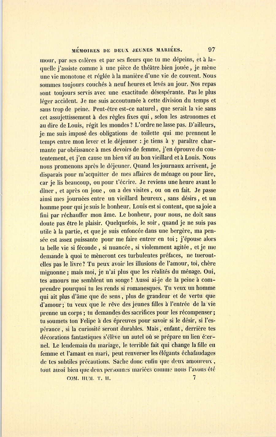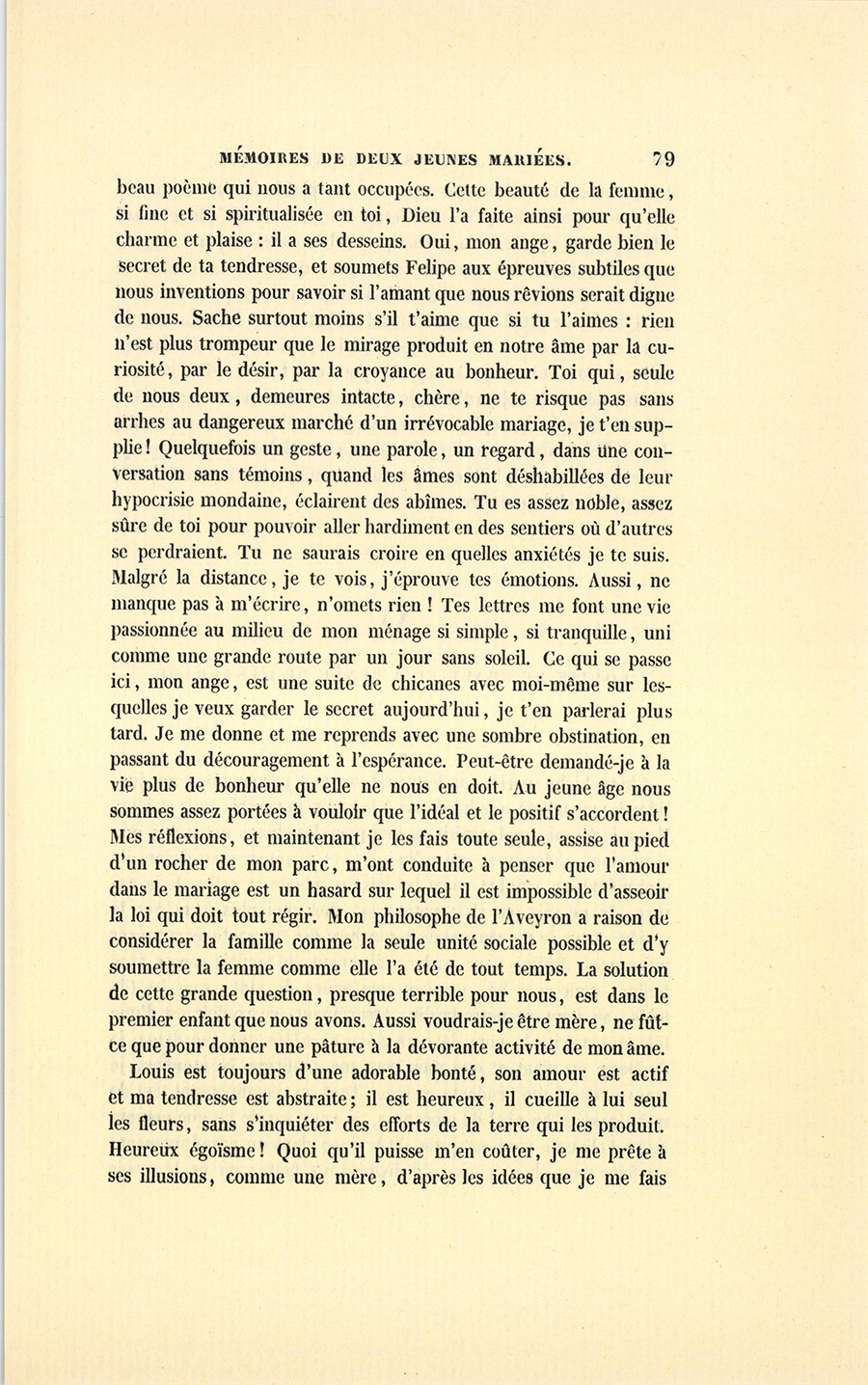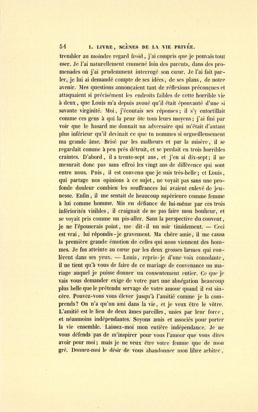 D’abord la gravité des engagements m’a investie de terreur. Le mariage se propose la vie, tandis que l’amour ne se propose que le plaisir ; mais aussi le mariage subsiste quand les plaisirs ont disparu, et donne naissance à des intérêts bien plus chers que ceux de l’homme et de la femme qui s’unissent. Aussi peut-être ne faut-il, pour faire un mariage heureux, que cette amitié qui, en vue de ses douceurs, cède sur beaucoup d’imperfections humaines. Rien ne s’opposait à ce que j’eusse de l’amitié pour Louis de l’Estorade. Bien décidée à ne pas chercher dans le mariage les jouissances de l’amour auxquelles nous pensions si souvent et avec une si dangereuse exaltation, j’ai senti la plus douce tranquillité en moi-même. Si je n’ai pas l’amour, pourquoi ne pas chercher le bonheur ? me suis-je dit. D’ailleurs, je suis aimée, et je me laisserai aimer. Mon mariage ne sera pas une servitude, mais un commandement perpétuel. Quel inconvénient cet état de choses offrira-t-il à une femme qui veut rester maîtresse absolue d’elle-même ?
