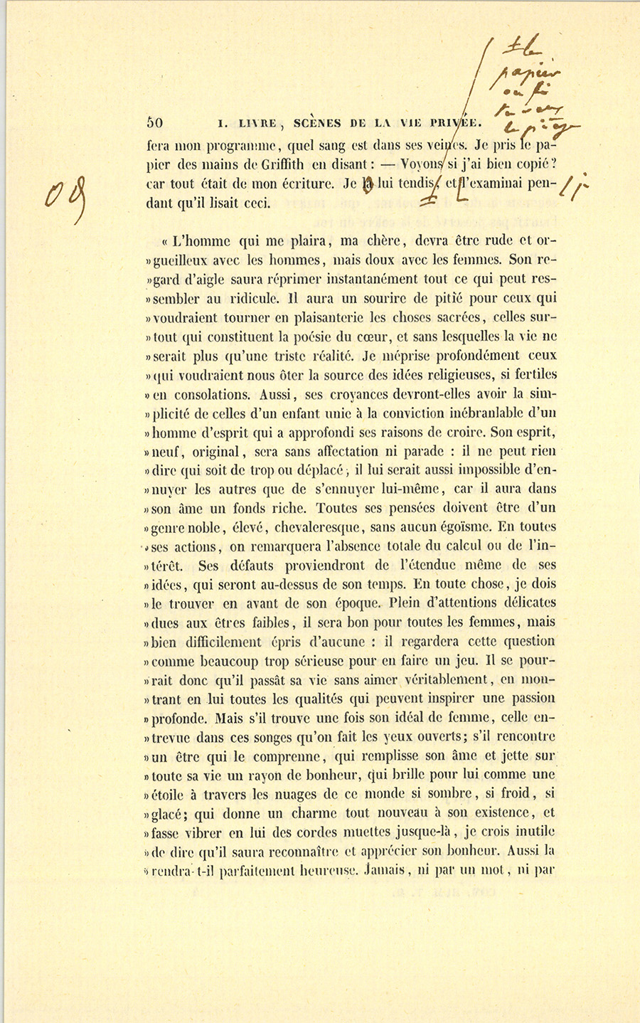 Cette réponse, que le vicomte de Vandenesse m’a rapportée textuellement, m’a donné beaucoup à penser. Je ne puis dire en quelles anxiétés j’ai passé le temps jusqu’à ma première leçon, qui a eu lieu ce matin. Pendant le premier quart d’heure de la leçon, je me suis demandé, en l’examinant, s’il était duc ou bourgeois, sans pouvoir y rien comprendre. Il semblait deviner mes pensées à mesure qu’elles naissaient et se plaire à les contrarier. Enfin je n’y tins plus, je quittai brusquement mon livre en interrompant la traduction que j’en faisais à haute voix, je lui dis en espagnol : – Vous nous trompez, monsieur. Vous n’êtes pas un pauvre bourgeois libéral, vous êtes le duc de Soria ? – Mademoiselle, répondit-il avec un mouvement de tristesse, malheureusement, je ne suis pas le duc de Soria. Je compris tout ce qu’il mit de désespoir dans le mot malheureusement. Ah ! ma chère, il sera, certes, impossible à aucun homme de mettre autant de passion et de choses dans un seul mot. Il avait baissé les yeux, et n’osait plus me regarder. – Monsieur de Talleyrand, lui dis-je, chez qui vous avez passé les années d’exil, ne laisse d’autre alternative à un Hénarez que celle d’être ou duc de Soria disgracié ou domestique. Il leva les yeux sur moi, et me montra deux brasiers noirs et brillants, deux yeux à la fois flamboyants et humiliés. Cet homme m’a paru être alors à la torture. – Mon père, dit-il, était en effet serviteur du roi d’Espagne. Griffith ne connaissait pas cette manière d’étudier. Nous faisions des silences inquiétants à chaque demande et à chaque réponse. – Enfin, lui dis-je, êtes-vous noble ou bourgeois ? – Vous savez, mademoiselle, qu’en Espagne tout le monde, même les mendiants, sont nobles. Cette réserve m’impatienta. J’avais préparé depuis la dernière leçon un de ces amusements qui sourient à l’imagination. J’avais tracé dans une lettre le portrait idéal de l’homme par qui je voudrais être aimée, en me proposant de le lui donner à traduire. Jusqu’à présent j’ai traduit de l’espagnol en français, et non du français en espagnol ; je lui en fis l’observation, et priai Griffith de me chercher la dernière lettre que j’avais reçue d’une de mes amies. Je verrai, pensais-je, à l’effet que lui {p. 50} fera mon programme, quel sang est dans ses veines. Je pris le papier des mains de Griffith en disant : – Voyons si j’ai bien copié ? car tout était de mon écriture. Je lui tendis le papier ou si tu veux le piège, et je l’examinai pendant qu’il lisait ceci.