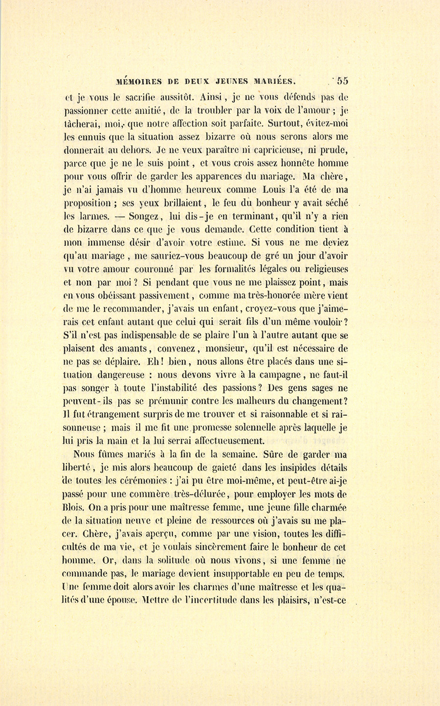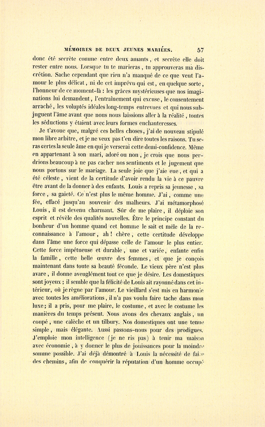 Nous fûmes mariés à la fin de la semaine. Sûre de garder ma liberté, je mis alors beaucoup de gaieté dans les insipides détails de toutes les cérémonies : j’ai pu être moi-même, et peut-être ai-je passé pour une commère très-délurée, pour employer les mots de Blois. On a pris pour une maîtresse femme, une jeune fille charmée de la situation neuve et pleine de ressources où j’avais su me placer. Chère, j’avais aperçu, comme par une vision, toutes les difficultés de ma vie, et je voulais sincèrement faire le bonheur de cet homme. Or, dans la solitude où nous vivons, si une femme ne commande pas, le mariage devient insupportable en peu de temps. Une femme doit alors avoir les charmes d’une maîtresse et les qualités d’une épouse. Mettre de l’incertitude dans les plaisirs, n’est-ce {p. 56} pas prolonger l’illusion et perpétuer les jouissances d’amour-propre auxquelles tiennent tant et avec tant de raison toutes les créatures ? L’amour conjugal, comme je le conçois, revêt alors une femme d’espérance, la rend souveraine, et lui donne une force inépuisable, une chaleur de vie qui fait tout fleurir autour d’elle. Plus elle est maîtresse d’elle-même, plus sûre elle est de rendre l’amour et le bonheur viables. Mais j’ai surtout exigé que le plus profond mystère voilât nos arrangements intérieurs. L’homme subjugué par sa femme est justement couvert de ridicule. L’influence d’une femme doit être entièrement secrète : chez nous, en tout, la grâce, c’est le mystère. Si j’entreprends de relever ce caractère abattu, de restituer leur lustre à des qualités que j’ai entrevues, je veux que tout semble spontané chez Louis. Telle est la tâche assez belle que je me suis donnée et qui suffit à la gloire d’une femme. Je suis presque fière d’avoir un secret pour intéresser ma vie, un plan auquel je rapporterai mes efforts, et qui ne sera connu que de toi et de Dieu.