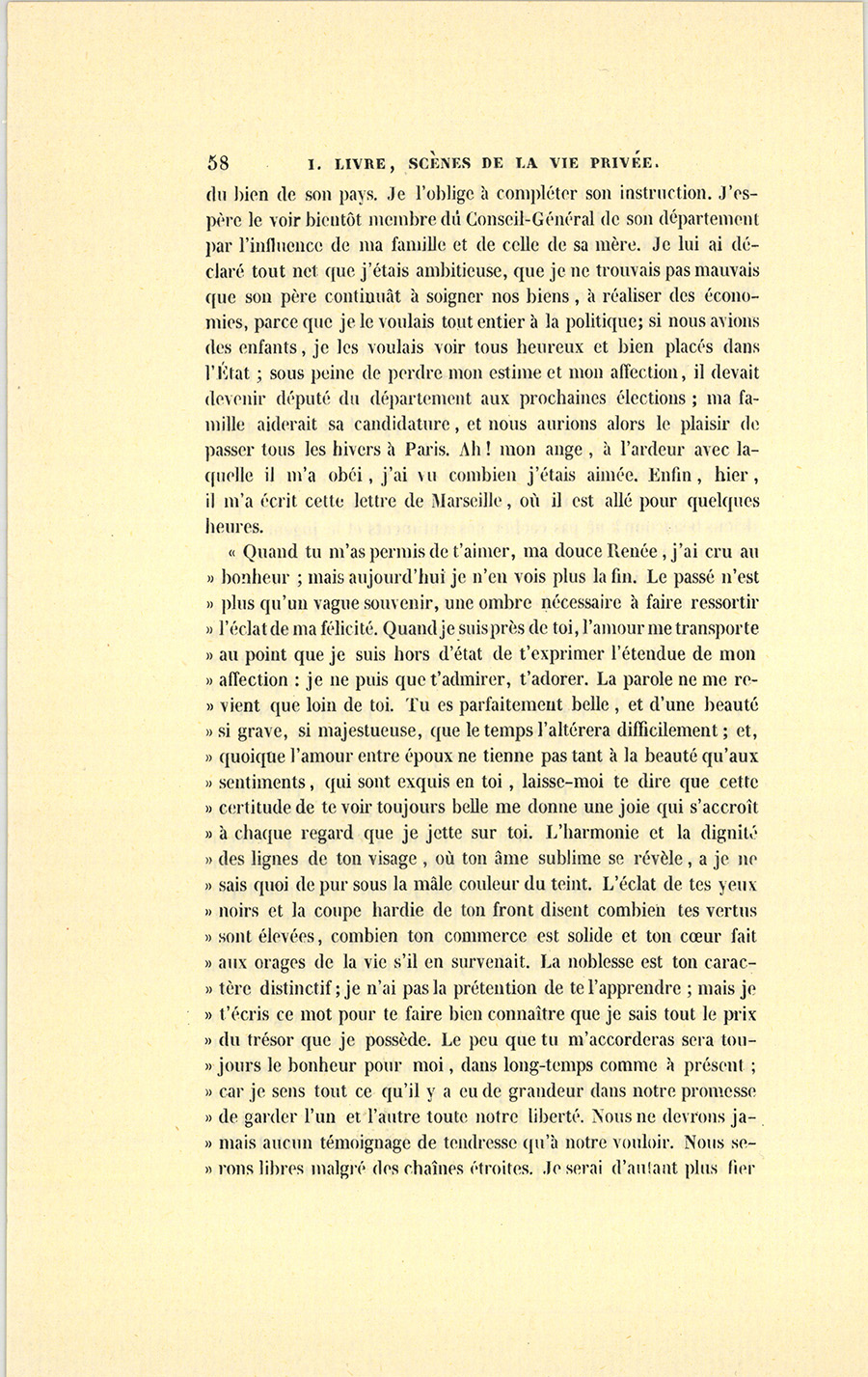 Je t’avoue que, malgré ces belles choses, j’ai de nouveau stipulé mon libre arbitre, et je ne veux pas t’en dire toutes les raisons. Tu seras certes la seule âme en qui je verserai cette demi-confidence. Même en appartenant à son mari, adoré ou non, je crois que nous perdrions beaucoup à ne pas cacher nos sentiments et le jugement que nous portons sur le mariage. La seule joie que j’aie eue, et qui a été céleste, vient de la certitude d’avoir rendu la vie à ce pauvre être avant de la donner à des enfants. Louis a repris sa jeunesse, sa force, sa gaieté. Ce n’est plus le même homme. J’ai, comme une fée, effacé jusqu’au souvenir des malheurs. J’ai métamorphosé Louis, il est devenu charmant. Sûr de me plaire, il déploie son esprit et révèle des qualités nouvelles. Être le principe constant du bonheur d’un homme quand cet homme le sait et mêle de la reconnaissance à l’amour, ah ! chère, cette certitude développe dans l’âme une force qui dépasse celle de l’amour le plus entier. Cette force impétueuse et durable, une et variée, enfante enfin la famille, cette belle œuvre des femmes, et que je conçois maintenant dans toute sa beauté féconde. Le vieux père n’est plus avare, il donne aveuglément tout ce que je désire. Les domestiques sont joyeux ; il semble que la félicité de Louis ait rayonné dans cet intérieur, où je règne par l’amour. Le vieillard s’est mis en harmonie avec toutes les améliorations, il n’a pas voulu faire tache dans mon luxe ; il a pris, pour me plaire, le costume, et avec le costume les manières du temps présent. Nous avons des chevaux anglais, un coupé, une calèche et un tilbury. Nos domestiques ont une tenue simple, mais élégante. Aussi passons-nous pour des prodigues. J’emploie mon intelligence (je ne ris pas) à tenir ma maison avec économie, à y donner le plus de jouissances pour la moindre somme possible. J’ai déjà démontré à Louis la nécessité de faire des chemins, afin de conquérir la réputation d’un homme occupé {p. 58} du bien de son pays. Je l’oblige à compléter son instruction. J’espère le voir bientôt membre du Conseil-Général de son département par l’influence de ma famille et de celle de sa mère. Je lui ai déclaré tout net que j’étais ambitieuse, que je ne trouvais pas mauvais que son père continuât à soigner nos biens, à réaliser des économies, parce que je le voulais tout entier à la politique ; si nous avions des enfants, je les voulais voir tous heureux et bien placés dans l’État ; sous peine de perdre mon estime et mon affection, il devait devenir député du département aux prochaines élections ; ma famille aiderait sa candidature, et nous aurions alors le plaisir de passer tous les hivers à Paris. Ah ! mon ange, à l’ardeur avec laquelle il m’a obéi, j’ai vu combien j’étais aimée. Enfin, hier, il m’a écrit cette lettre de Marseille, où il est allé pour quelques heures.