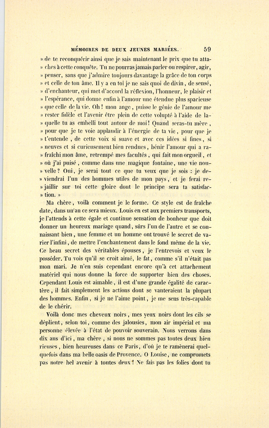 Voilà donc mes cheveux noirs, mes yeux noirs dont les cils se déplient, selon toi, comme des jalousies, mon air impérial et ma personne élevée à l’état de pouvoir souverain. Nous verrons dans dix ans d’ici, ma chère, si nous ne sommes pas toutes deux bien rieuses, bien heureuses dans ce Paris, d’où je te ramènerai quelquefois dans ma belle oasis de Provence. Ô Louise, ne compromets pas notre bel avenir à toutes deux ! Ne fais pas les folies dont tu {p. 60} me menaces. J’épouse un vieux jeune homme, épouse quelque jeune vieillard de la chambre des pairs. Tu es là dans le vrai.
