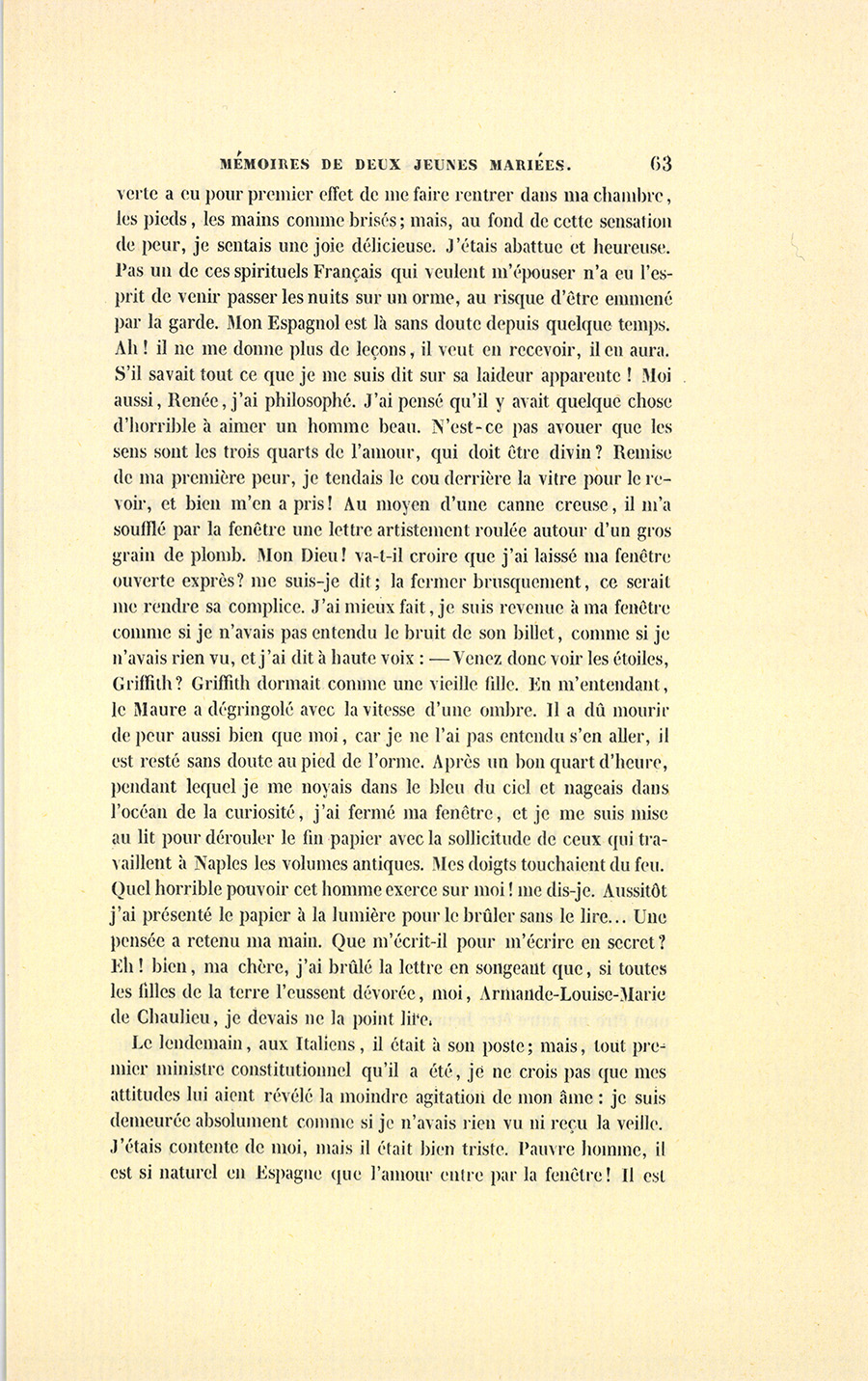 Voilà quinze jours, ma chère, que je vis de la vie du monde : un soir aux Italiens, l’autre au grand Opéra, de là toujours au bal. Ah ! le monde est une féerie. La musique des Italiens me ravit, et pendant que mon âme nage dans un plaisir divin, je suis lorgnée, admirée ; mais, par un seul de mes regards, je fais baisser les yeux au plus hardi jeune homme. J’ai vu là des jeunes gens charmants ; eh ! bien, pas un ne me plaît ; aucun ne m’a causé l’émotion que {p. 33} j’éprouve en entendant Garcia dans son magnifique duo avec Pellegrini dans Otello. Mon Dieu ! combien ce Rossini doit être jaloux pour avoir si bien exprimé la jalousie ? Quel cri que : Il mio cor si divide. Je te parle grec, tu n’as pas entendu Garcia, mais tu sais combien je suis jalouse ! Quel triste dramaturge que Shakespeare ! Othello se prend de gloire, il remporte des victoires, il commande, il parade, il se promène en laissant Desdémone dans son coin, et Desdémone, qui le voit préférant à elle les stupidités de la vie publique, ne se fâche point ? cette brebis mérite la mort. Que celui que je daignerai aimer s’avise de faire autre chose que de m’aimer ! Moi, je suis pour les longues épreuves de l’ancienne chevalerie. Je regarde comme très-impertinent et très-sot ce paltoquet de jeune seigneur qui a trouvé mauvais que sa souveraine l’envoyât chercher son gant au milieu des lions : elle lui réservait sans doute quelque belle fleur d’amour, et il l’a perdue après l’avoir méritée, l’insolent ! Mais je babille comme si je n’avais pas de grandes nouvelles à t’apprendre ! Mon père va sans doute représenter le roi notre maître à Madrid : je dis notre maître, car je ferai partie de l’ambassade. Ma mère désire rester ici, mon père m’emmènera pour avoir une femme près de lui.