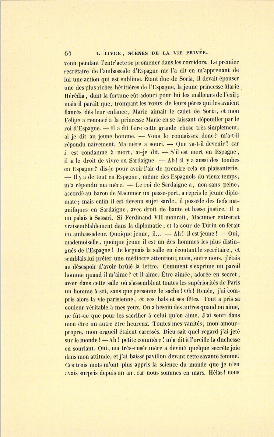– Mademoiselle, me dit-il en espagnol et d’une voix profondément émue, veut-elle me permettre de garder ceci en mémoire d’elle ? Voici la dernière leçon que j’aurai l’honneur de lui donner, et celle que je reçois dans cet écrit peut devenir une règle éternelle de conduite. J’ai quitté l’Espagne en fugitif et sans argent ; mais, aujourd’hui, j’ai reçu de ma famille une somme qui suffit à mes besoins. J’aurai l’honneur de vous envoyer quelque pauvre Espagnol pour me remplacer. Il semblait ainsi me dire : – Assez joué comme cela. Il s’est levé par un mouvement d’une incroyable dignité, et m’a laissée confondue de cette inouïe délicatesse chez les hommes de sa classe. Il est descendu, et a fait demander à parler à mon père. Au dîner, mon père me dit en souriant : – Louise, vous avez reçu des leçons d’espagnol d’un ex-ministre du roi d’Espagne et d’un condamné à mort. – Le duc de Soria, lui dis-je. – Le duc ! me répondit mon père. Il ne l’est plus, il prend maintenant le titre de baron de Macumer, d’un fief qui lui reste en Sardaigne. Il me paraît assez original. – Ne flétrissez pas de ce mot qui, chez vous, comporte toujours un peu de moquerie et de dédain, un homme qui vous vaut, lui dis-je, et qui, je crois, a une belle âme. – Baronne de Macumer ? s’écria mon père en me regardant d’un air moqueur. J’ai baissé les yeux par un mouvement de fierté. – Mais, dit ma mère, Hénarez a dû se rencontrer sur le perron avec l’ambassadeur d’Espagne ? – Oui, a répondu mon père : l’ambassadeur m’a demandé si je conspirais contre le roi son maître ; mais il a salué l’ex-grand d’Espagne avec beaucoup de déférence, en se mettant à ses ordres.